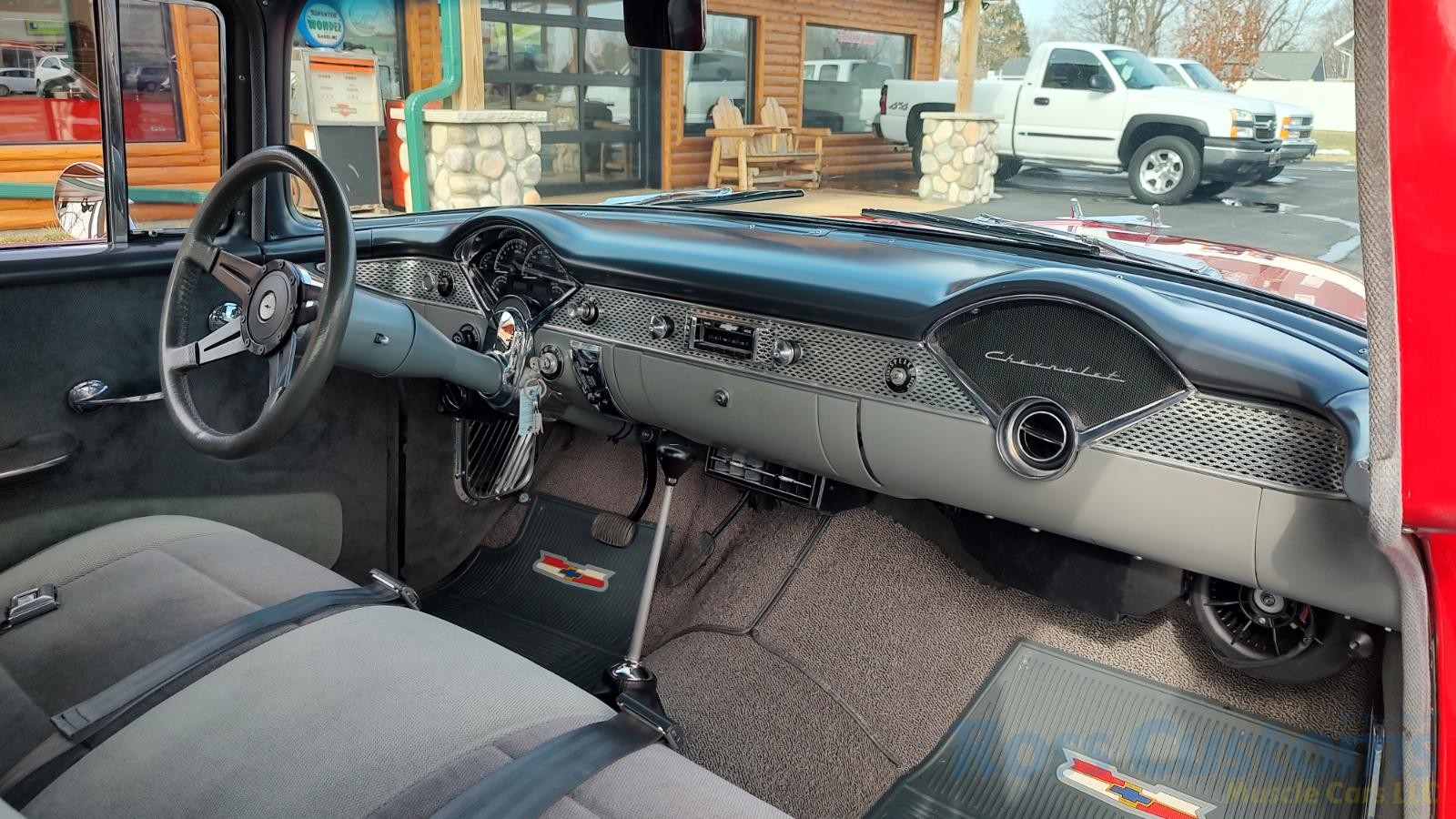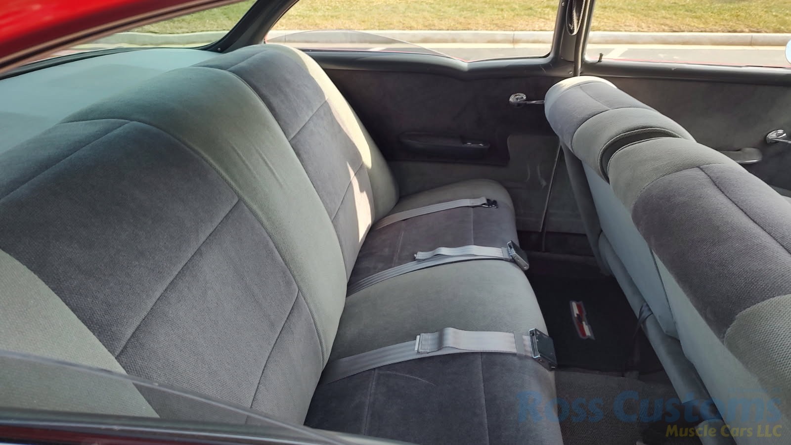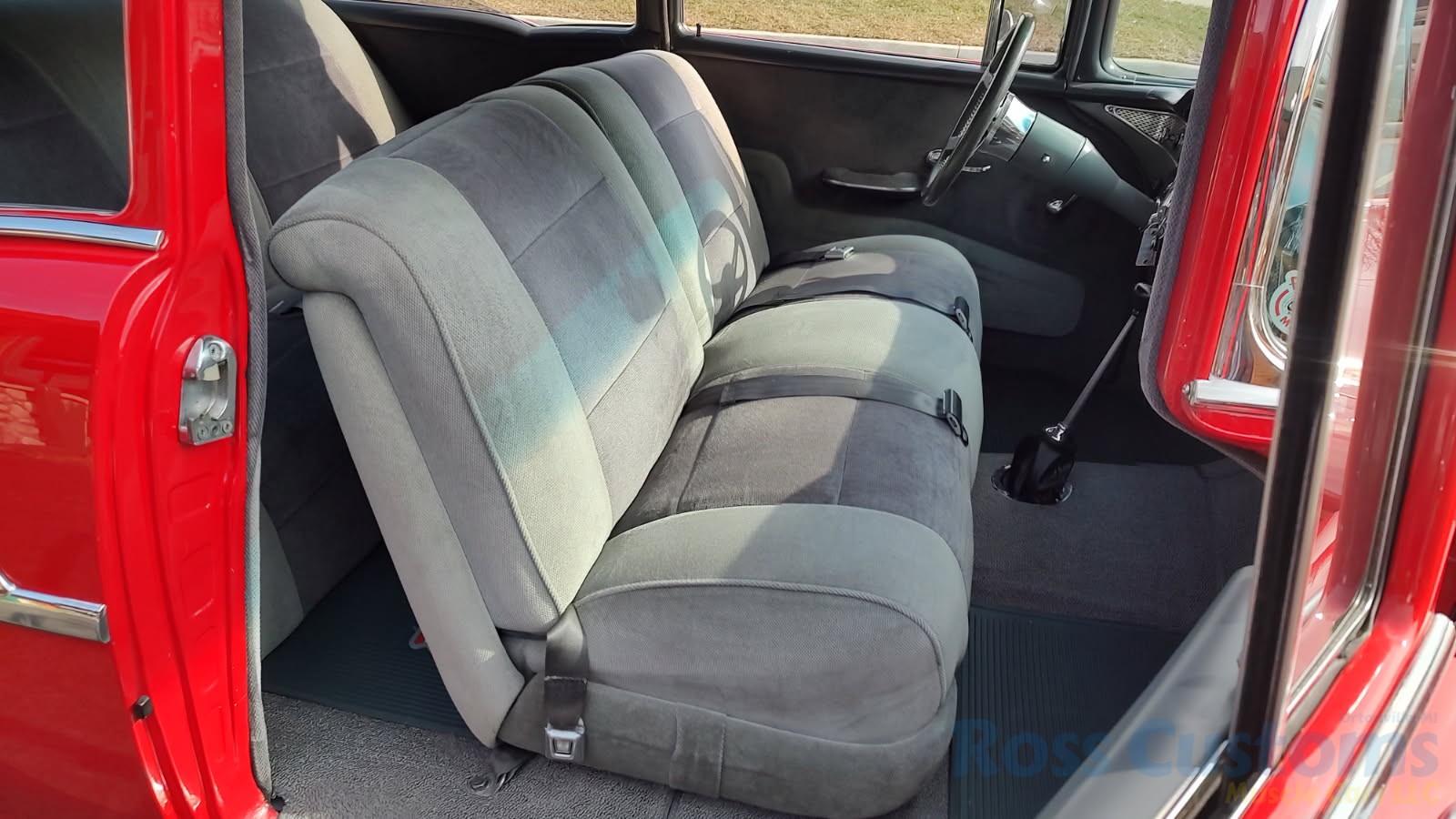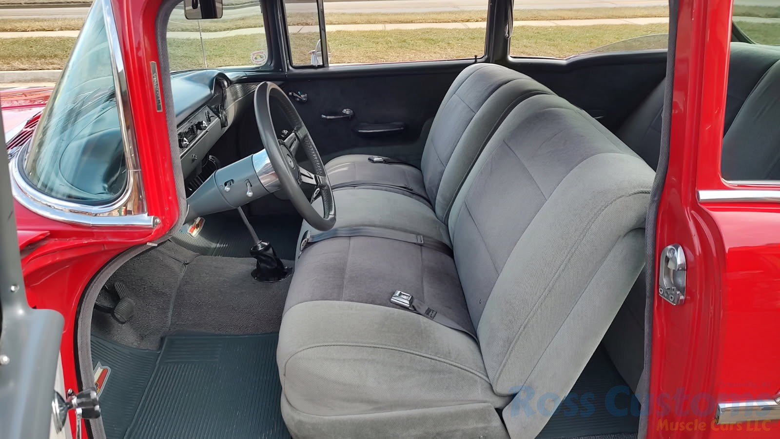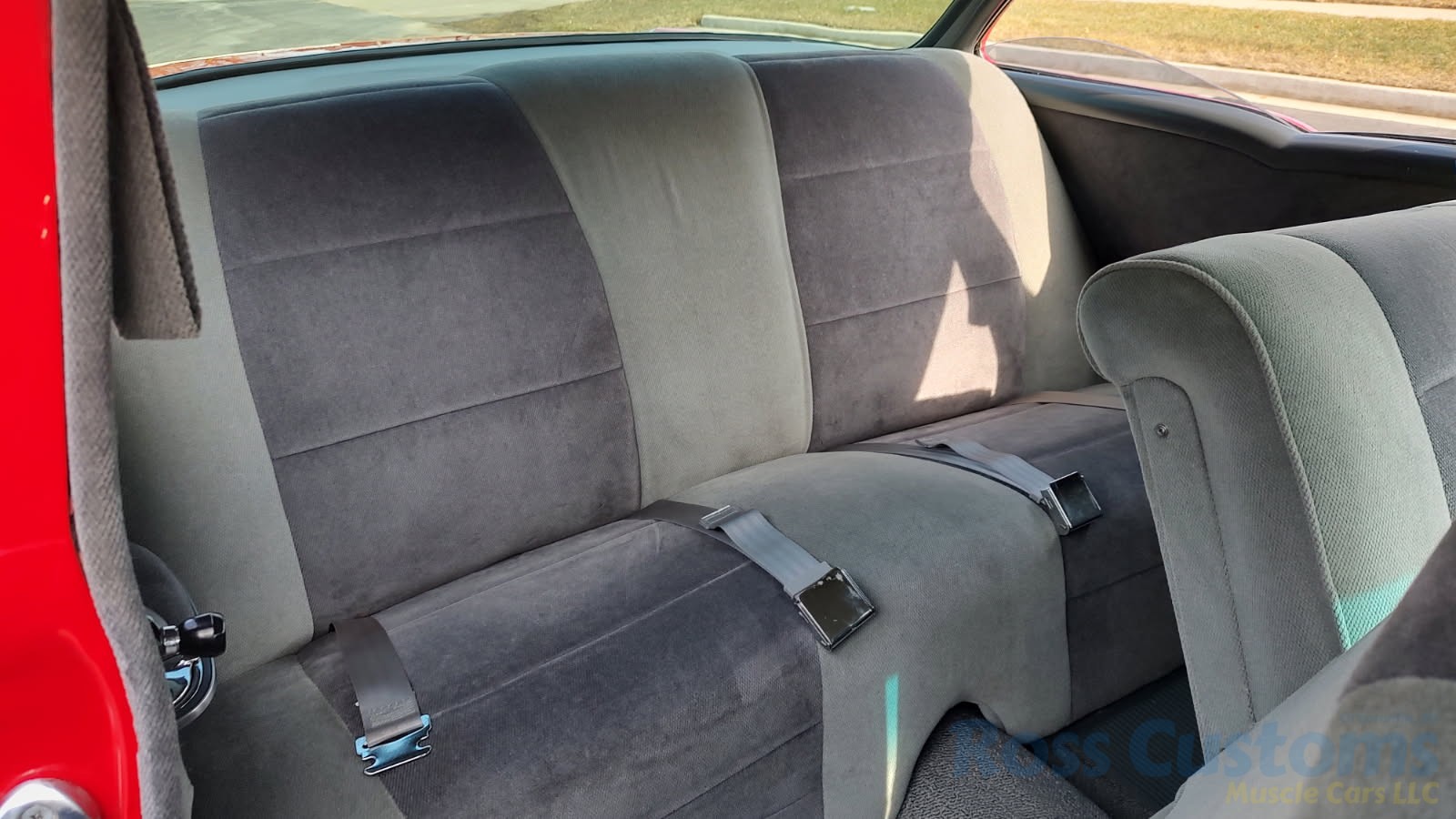 Custom 2 tone gray interior, dash and garnish moldings have been re-finished, has been completely rewired with up to date harness throughout, nicely updated with Dakota digital classic look instrumentation, direct fit AM/FM stereo with IPOD capability, front and rear speakers, nicely outfitted with Vintage AC Gen 5 system, also updated with Newport multi-speed wipers, Flaming River tilt steering column, Lokar steering wheel, at time of build had new headliner and visors, package shelf, custom front and rear door panels; as well as kick panels, original front and rear seats have also been custom upholstered, updated with front and rear seat belts, nicely outfitted with Lokar shifter, new carpet, deluxe floor mats, new sill plates, trunk has also been upholstered to match.
