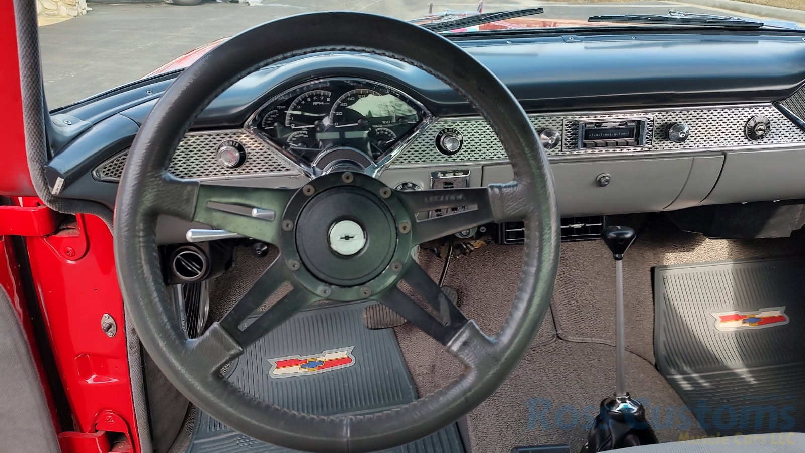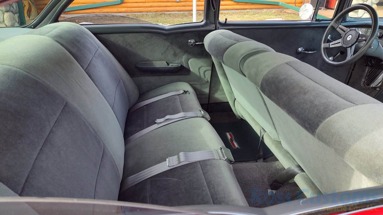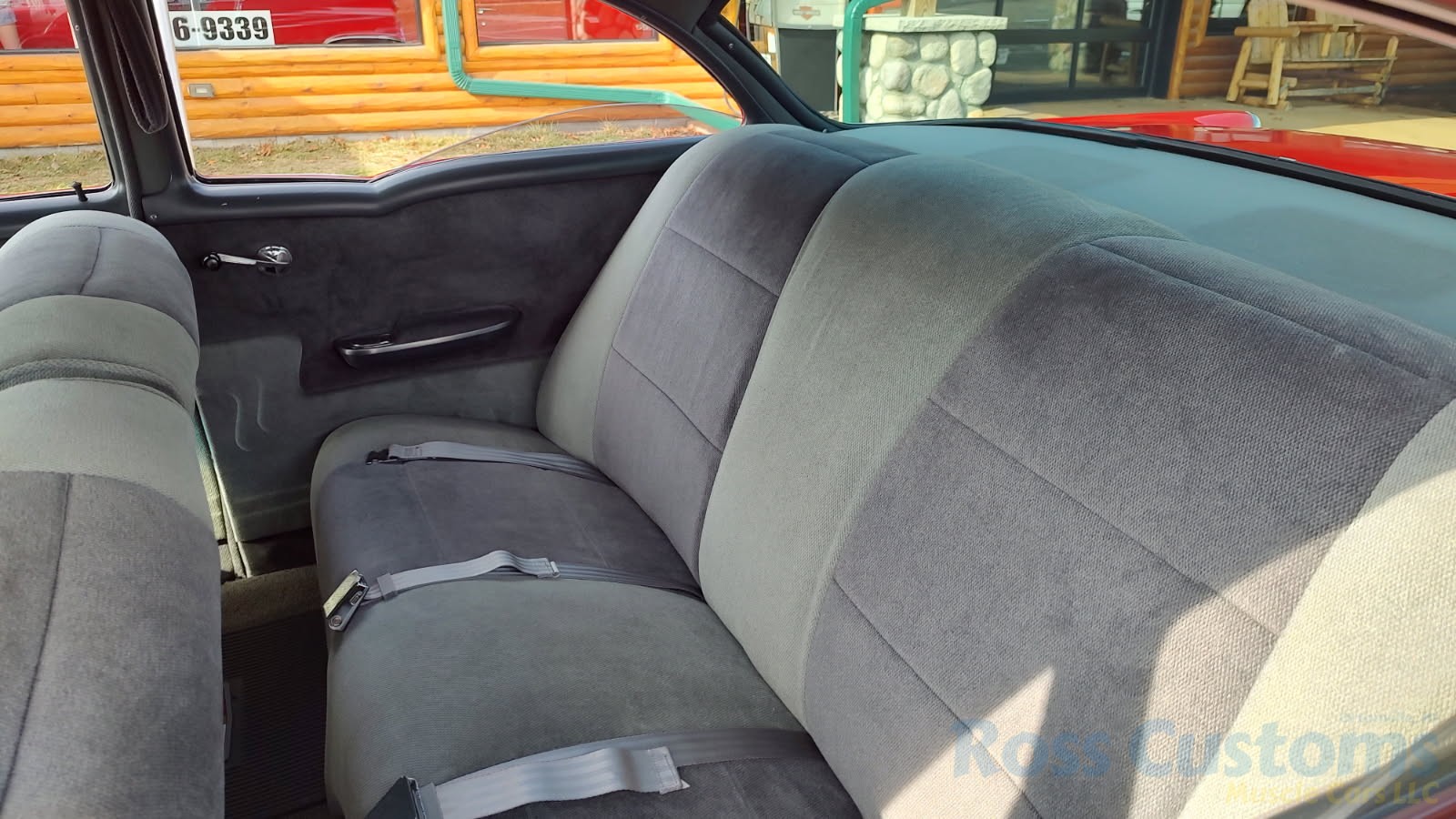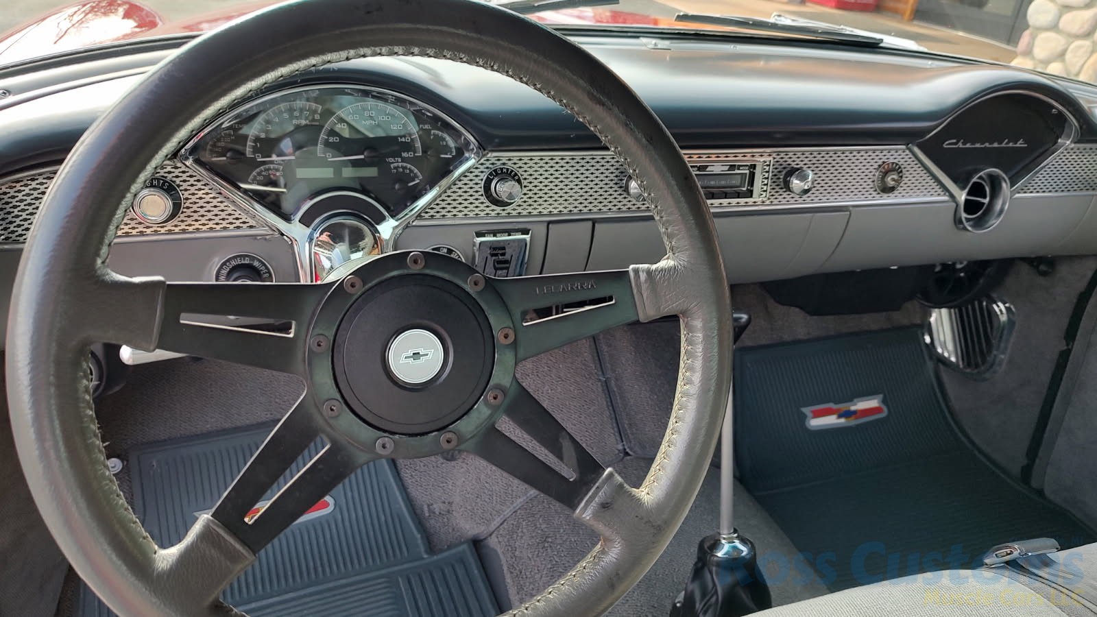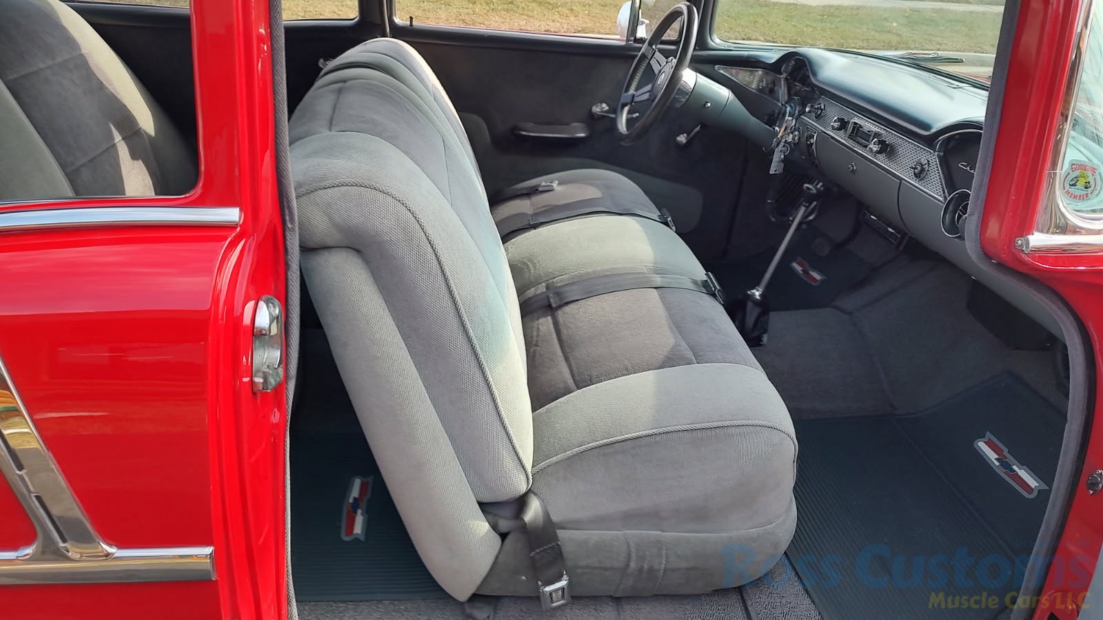 Custom 2 tone gray interior, dash and garnish moldings have been re-finished, has been completely rewired with up to date harness throughout, nicely updated with Dakota digital classic look instrumentation, direct fit AM/FM stereo with IPOD capability, front and rear speakers, nicely outfitted with Vintage AC Gen 5 system, also updated with Newport multi-speed wipers, Flaming River tilt steering column, Lokar steering wheel, at time of build had new headliner and visors, package shelf, custom front and rear door panels; as well as kick panels, original front and rear seats have also been custom upholstered, updated with front and rear seat belts, nicely outfitted with Lokar shifter, new carpet, deluxe floor mats, new sill plates, trunk has also been upholstered to match.