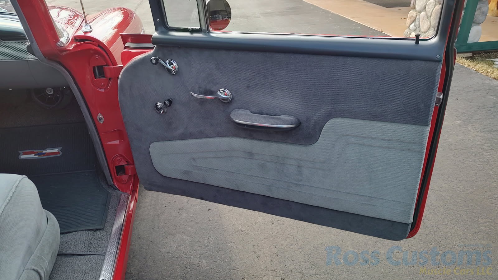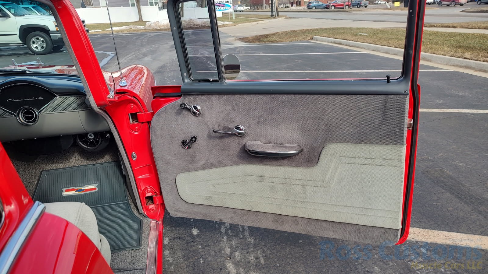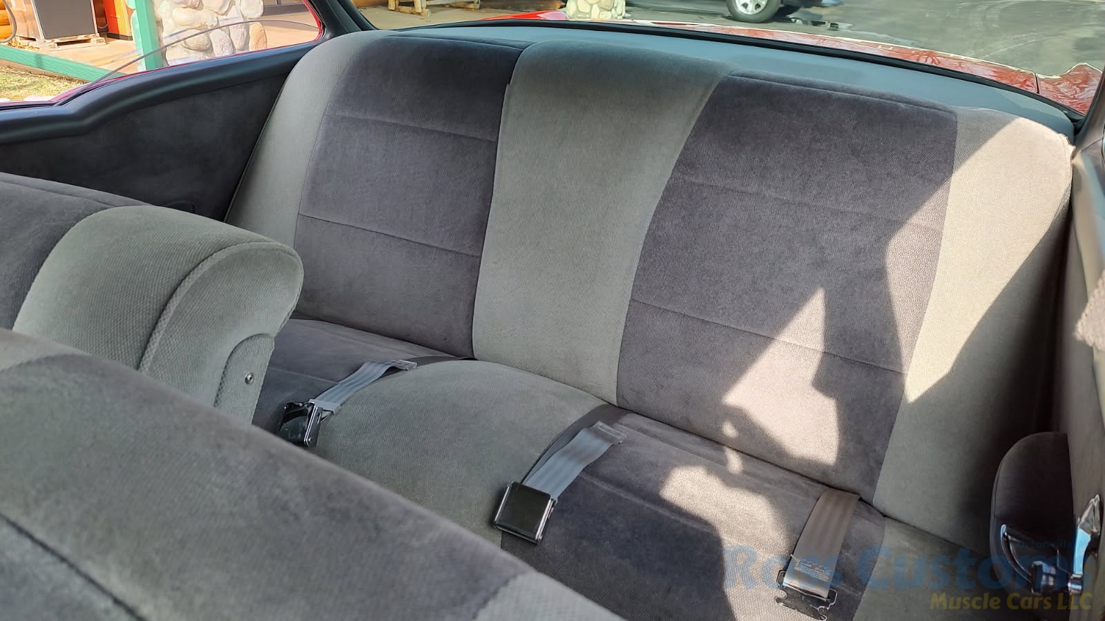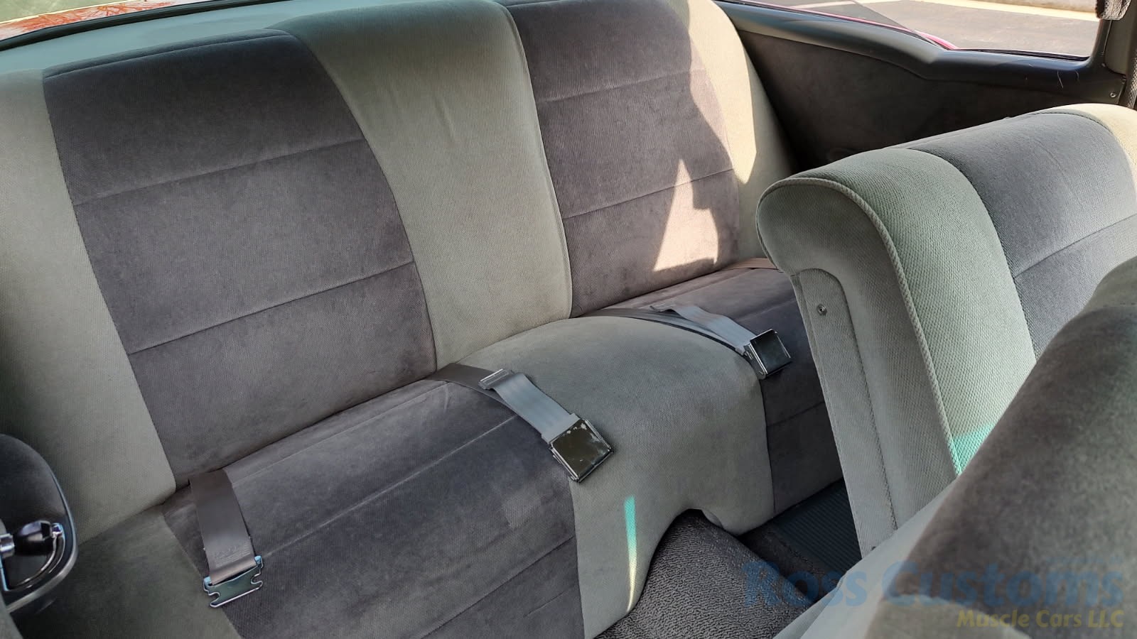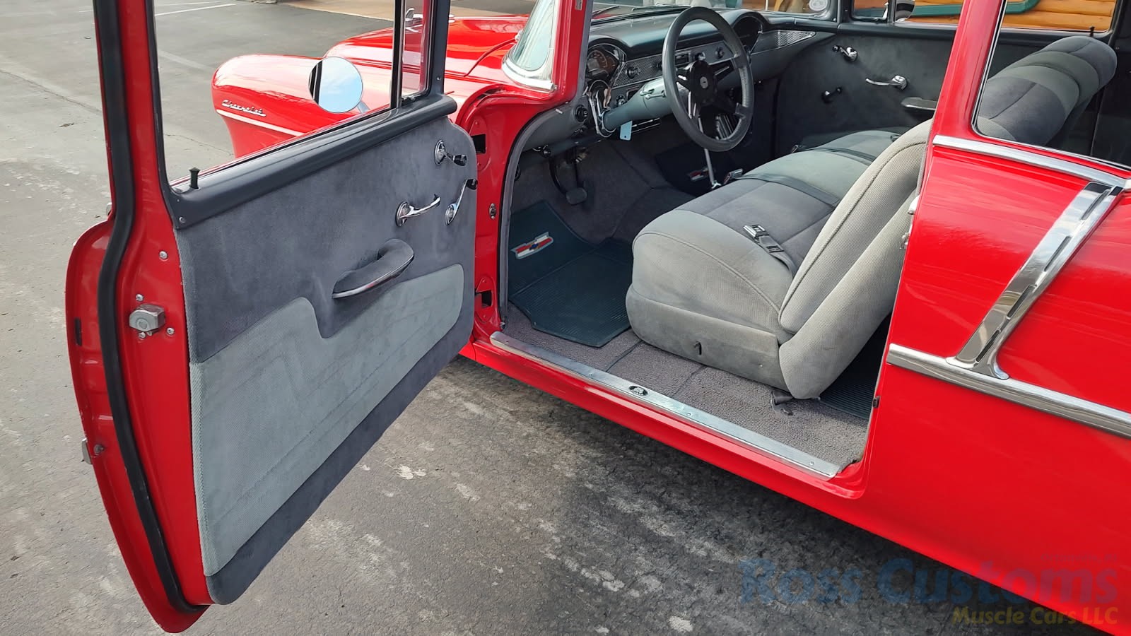 Custom 2 tone gray interior, dash and garnish moldings have been re-finished, has been completely rewired with up to date harness throughout, nicely updated with Dakota digital classic look instrumentation, direct fit AM/FM stereo with IPOD capability, front and rear speakers, nicely outfitted with Vintage AC Gen 5 system, also updated with Newport multi-speed wipers, Flaming River tilt steering column, Lokar steering wheel, at time of build had new headliner and visors, package shelf, custom front and rear door panels; as well as kick panels, original front and rear seats have also been custom upholstered, updated with front and rear seat belts, nicely outfitted with Lokar shifter, new carpet, deluxe floor mats, new sill plates, trunk has also been upholstered to match.