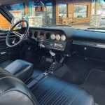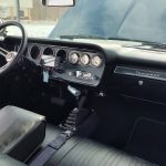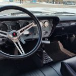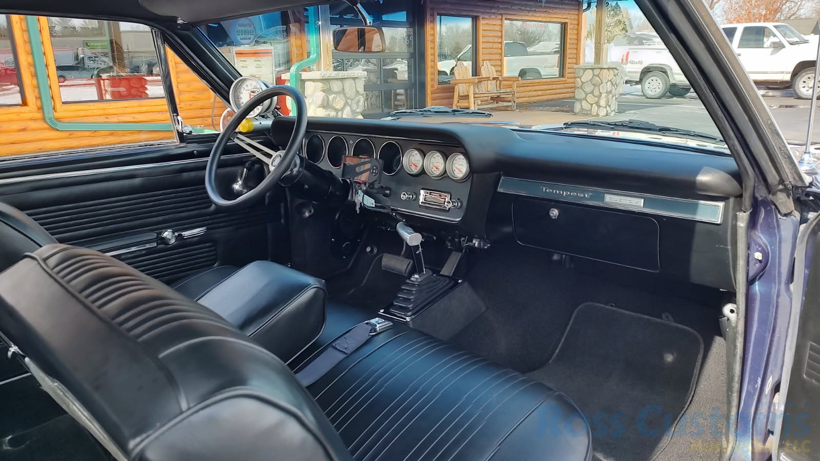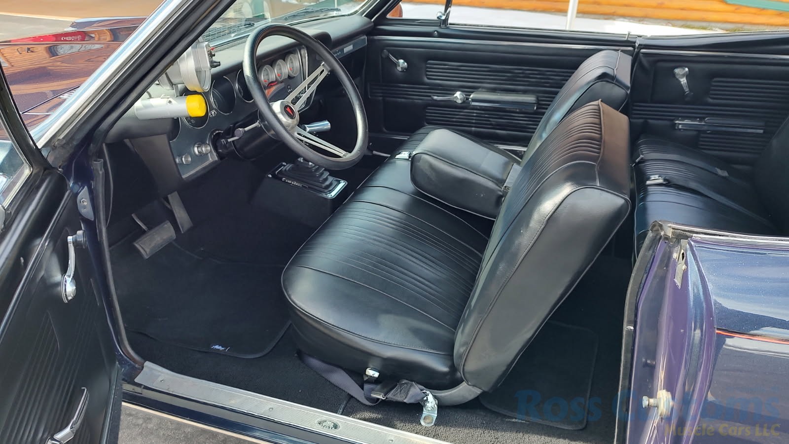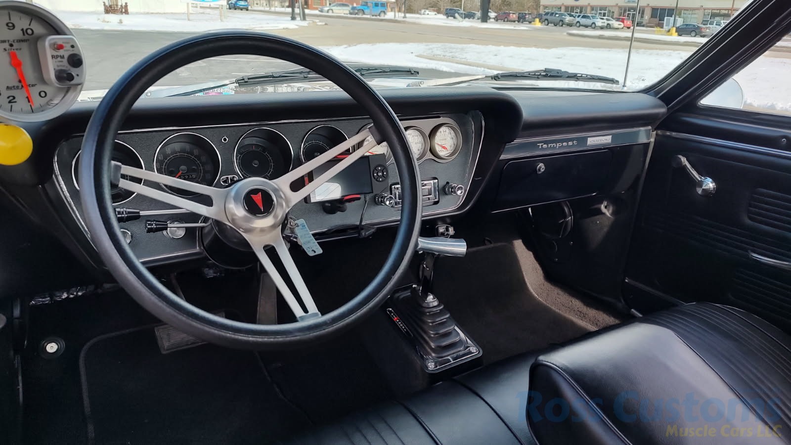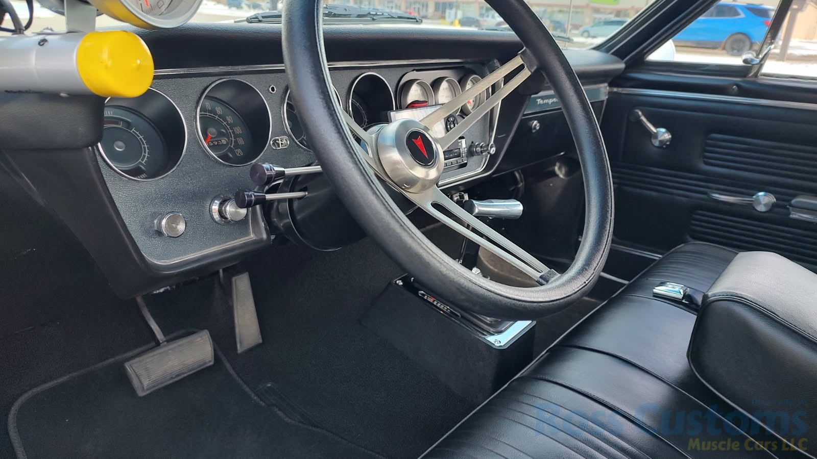 Black interior, rewired with up to date wiring throughout, new dash bezel with custom Auto Meter gauges, tach with shift light, direct-fit AM/FM stereo with IPOD capability, amp and kicker, custom kick panel speakers and rear deck speakers, updated with IDIDIT tilt steering column, 3 spoke sport wheel, control screen for Fitech fuel injection, new dash pad, new headliner and visors, front and rear door panels have been replaced; as well as arm rest and bases, front and rear seats have also been reupholstered, rare GTO front bench seat with fold-down arm rest, updated with front and rear seat belts, nicely outfitted with a TCI performance shifter, new carpet and floor mats.