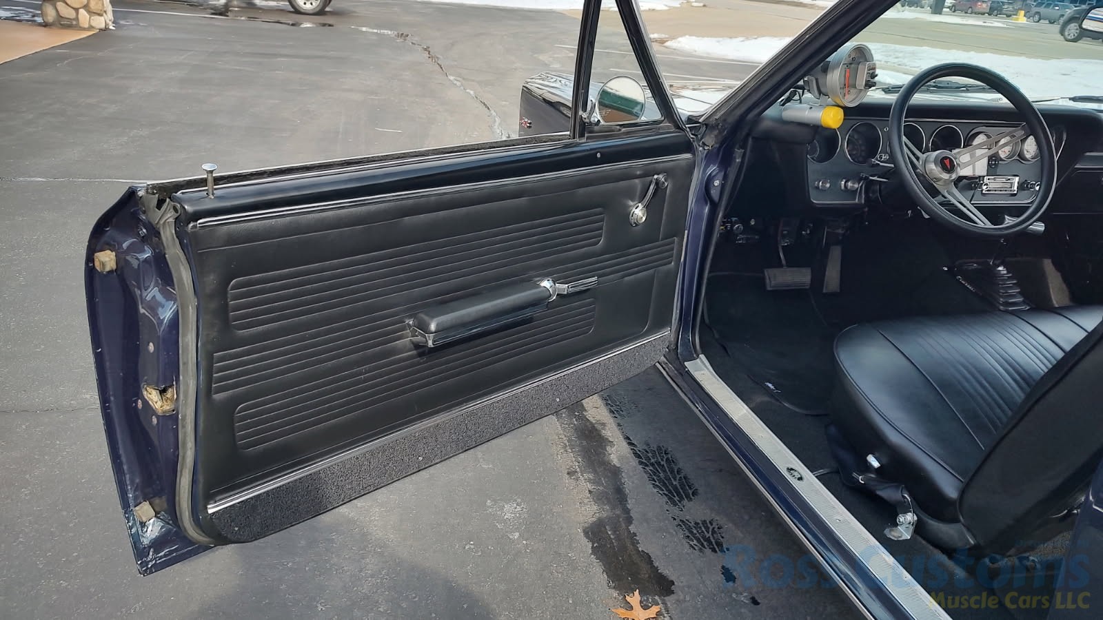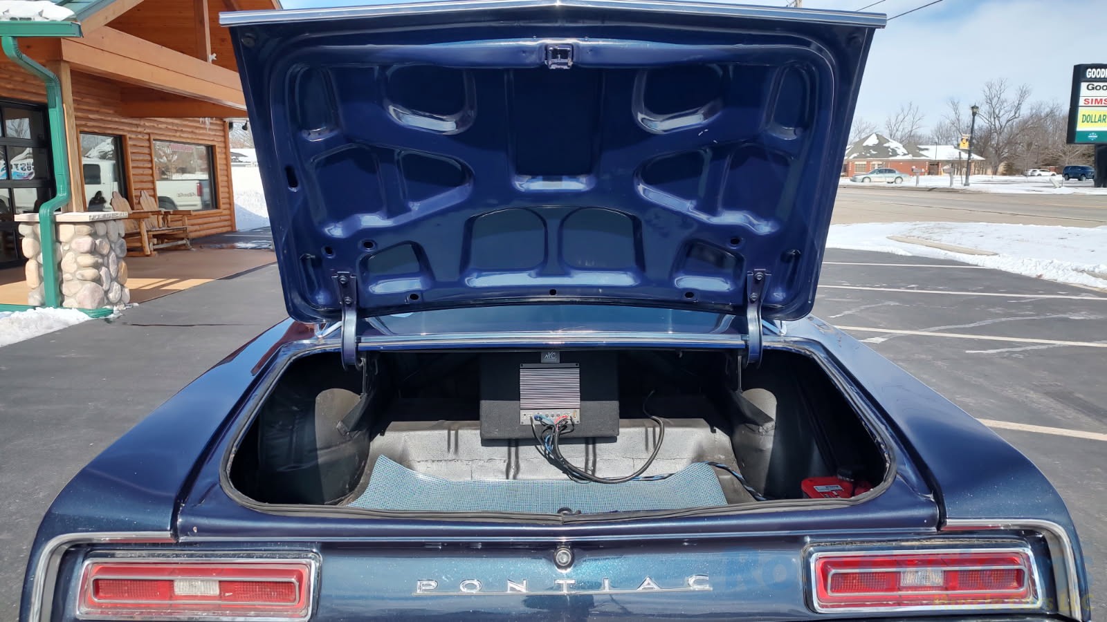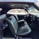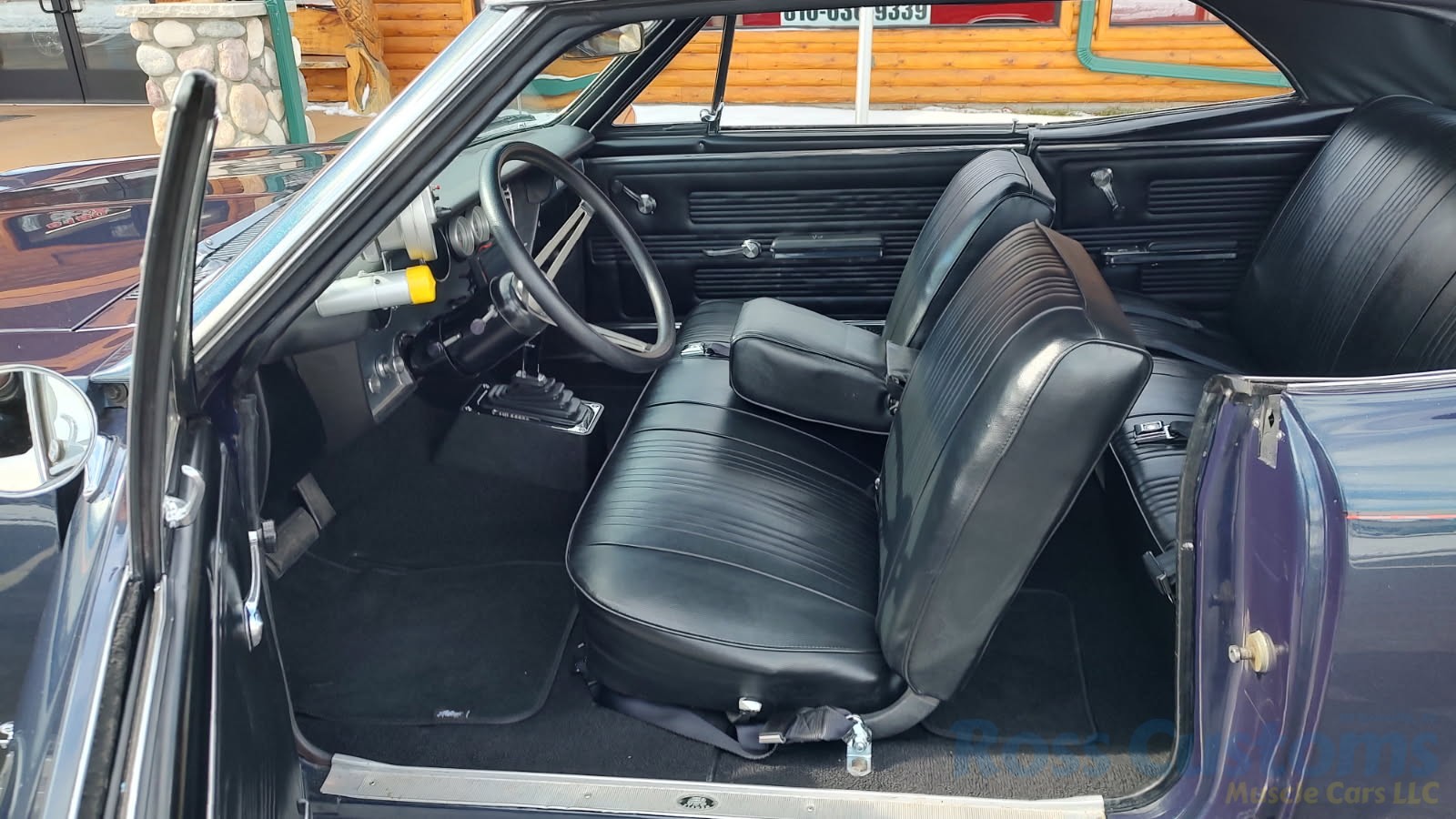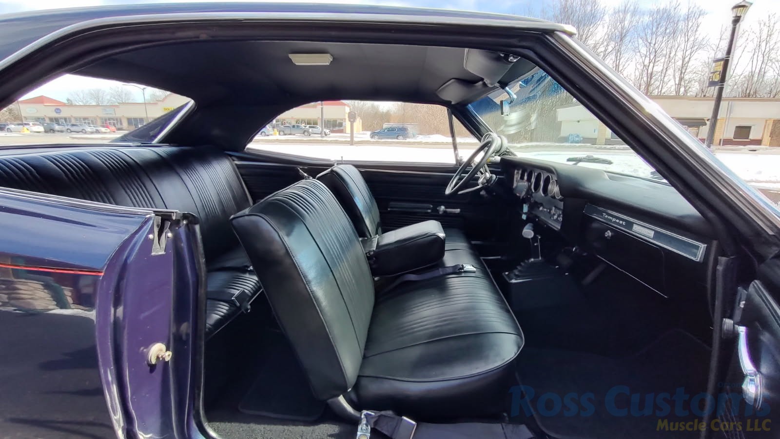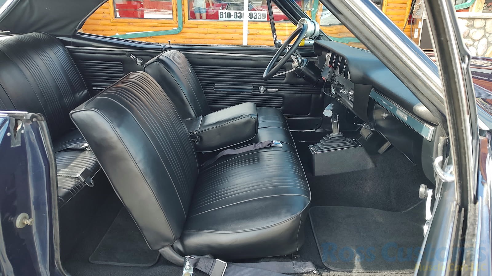 Black interior, rewired with up to date wiring throughout, new dash bezel with custom Auto Meter gauges, tach with shift light, direct-fit AM/FM stereo with IPOD capability, amp and kicker, custom kick panel speakers and rear deck speakers, updated with IDIDIT tilt steering column, 3 spoke sport wheel, control screen for Fitech fuel injection, new dash pad, new headliner and visors, front and rear door panels have been replaced; as well as arm rest and bases, front and rear seats have also been reupholstered, rare GTO front bench seat with fold-down arm rest, updated with front and rear seat belts, nicely outfitted with a TCI performance shifter, new carpet and floor mats.