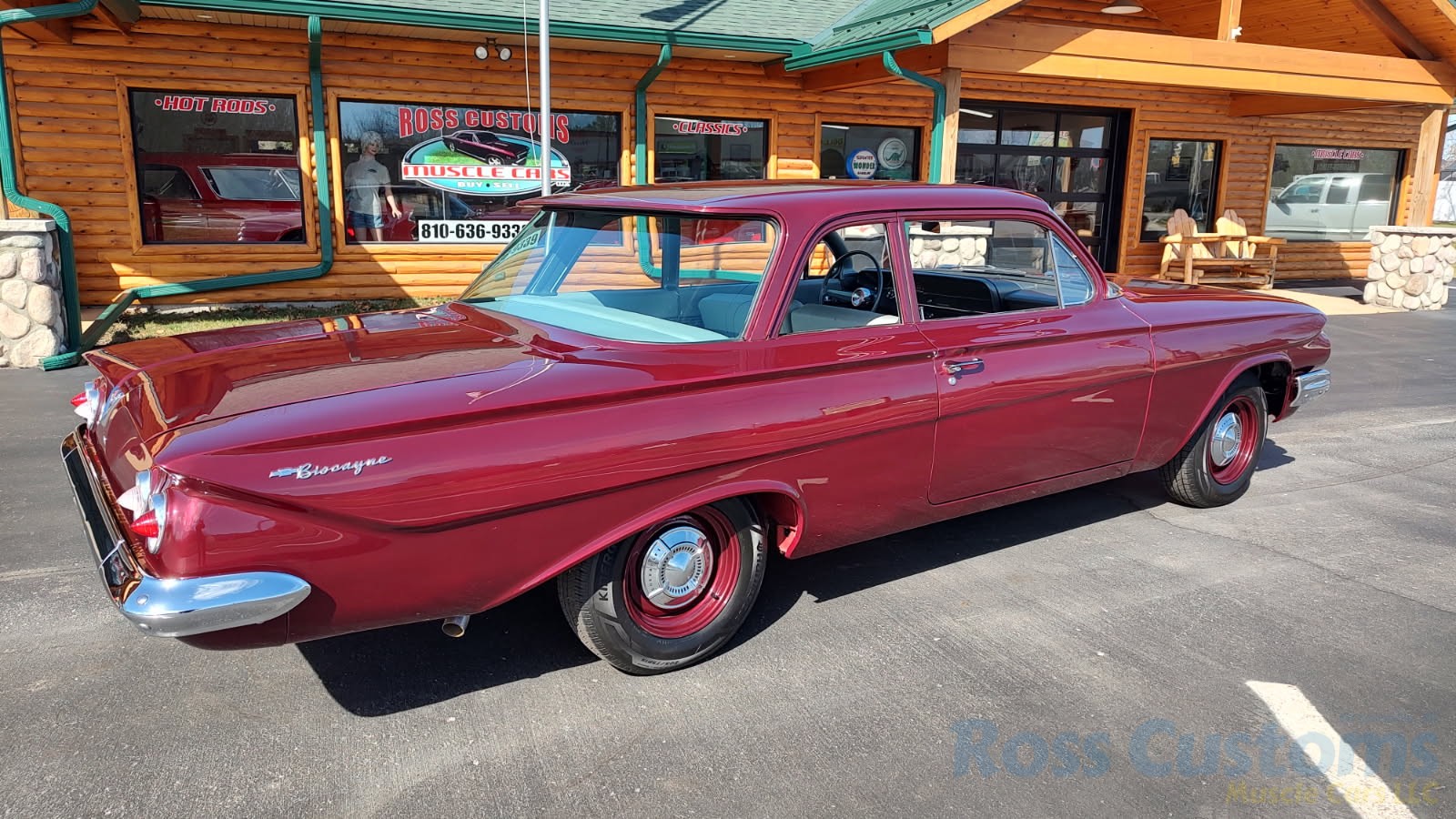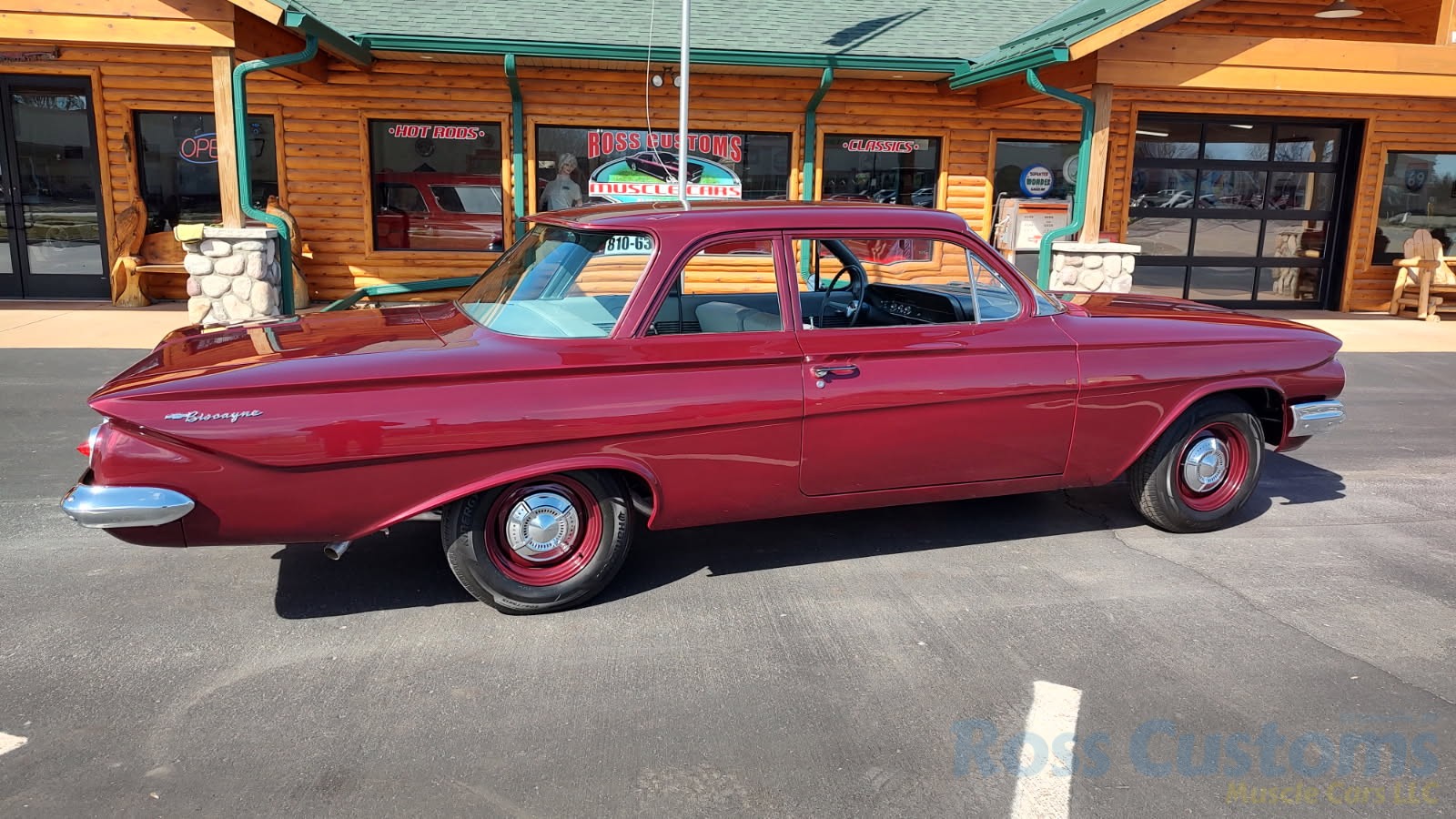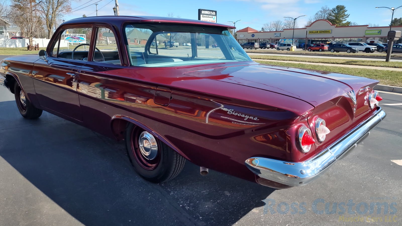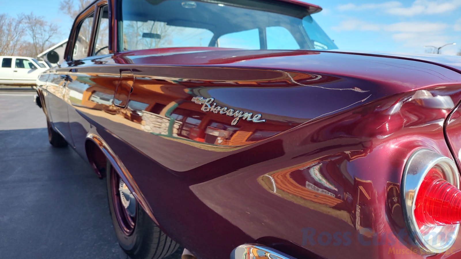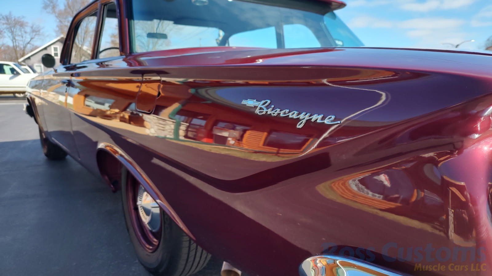 This is a very cool 61 Chevrolet Biscayne, clean Texas car that has had a complete frame off nut and bolt restoration, done in very slick Burgundy Metallic basecoat clearcoat, sanded and wheeled smooth, at time of restoration had new windshield and side glass, back glass is factory original, new window rubbers, weather striping and window felts, new side view mirror, new door handles, grill and headlight bezels are original in excellent condition, front bumper has been re-chromed, new deck lid emblem, taillight housings are original in excellent condition, new taillight lens, rear bumper has also been re-chromed.
