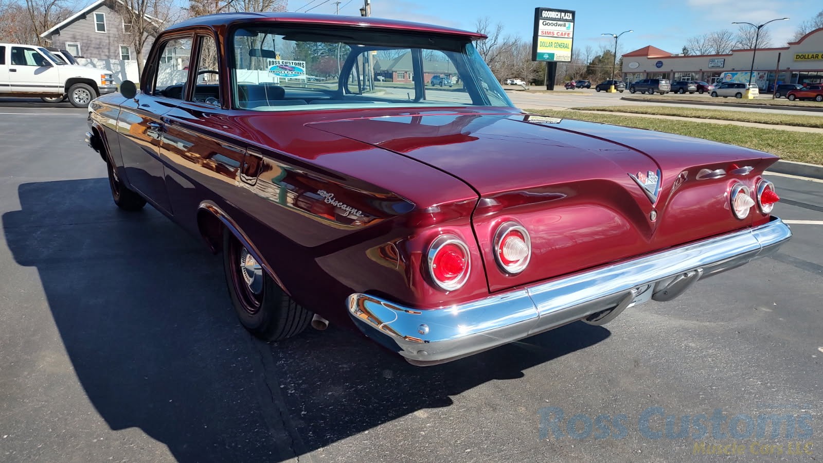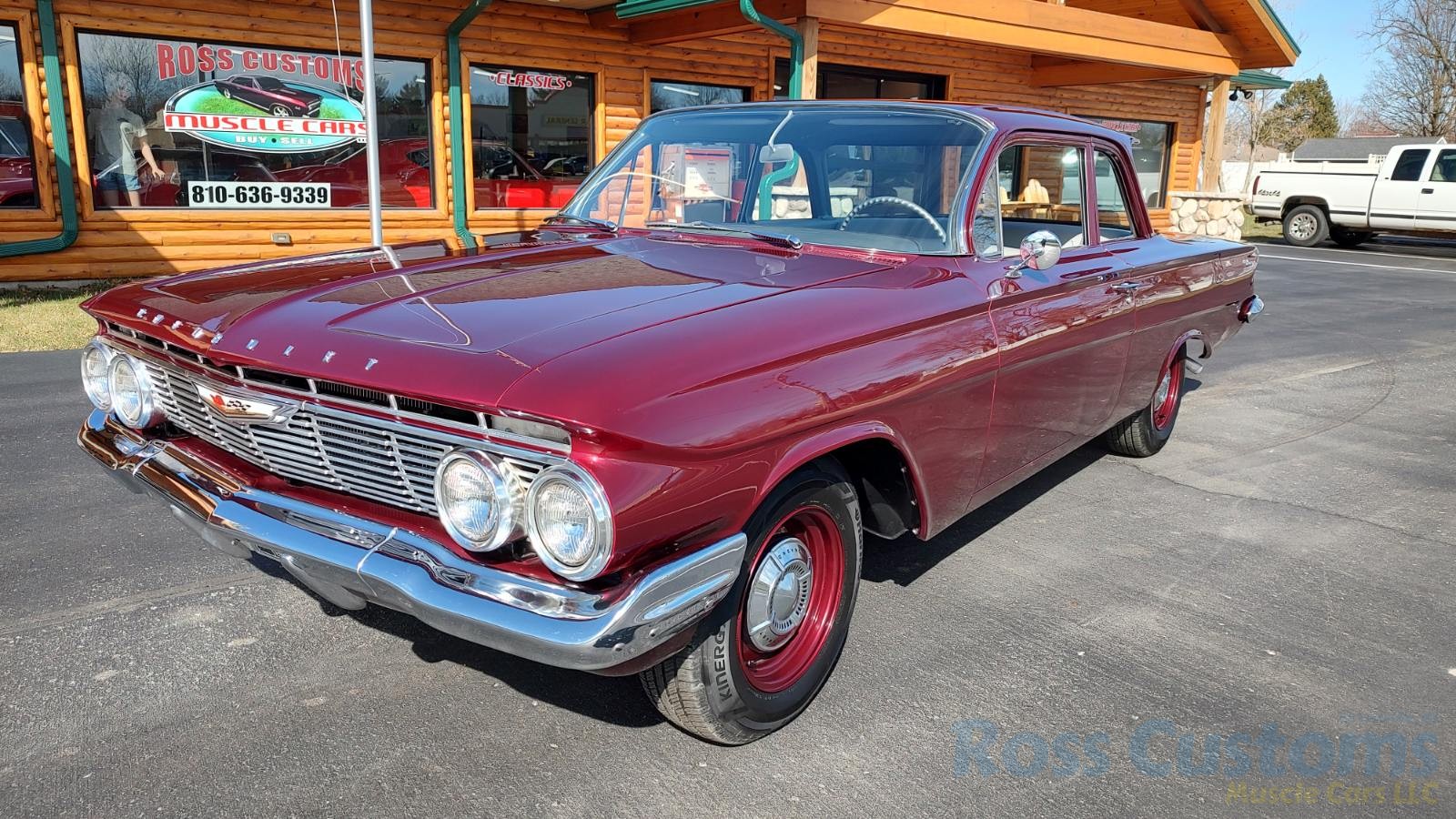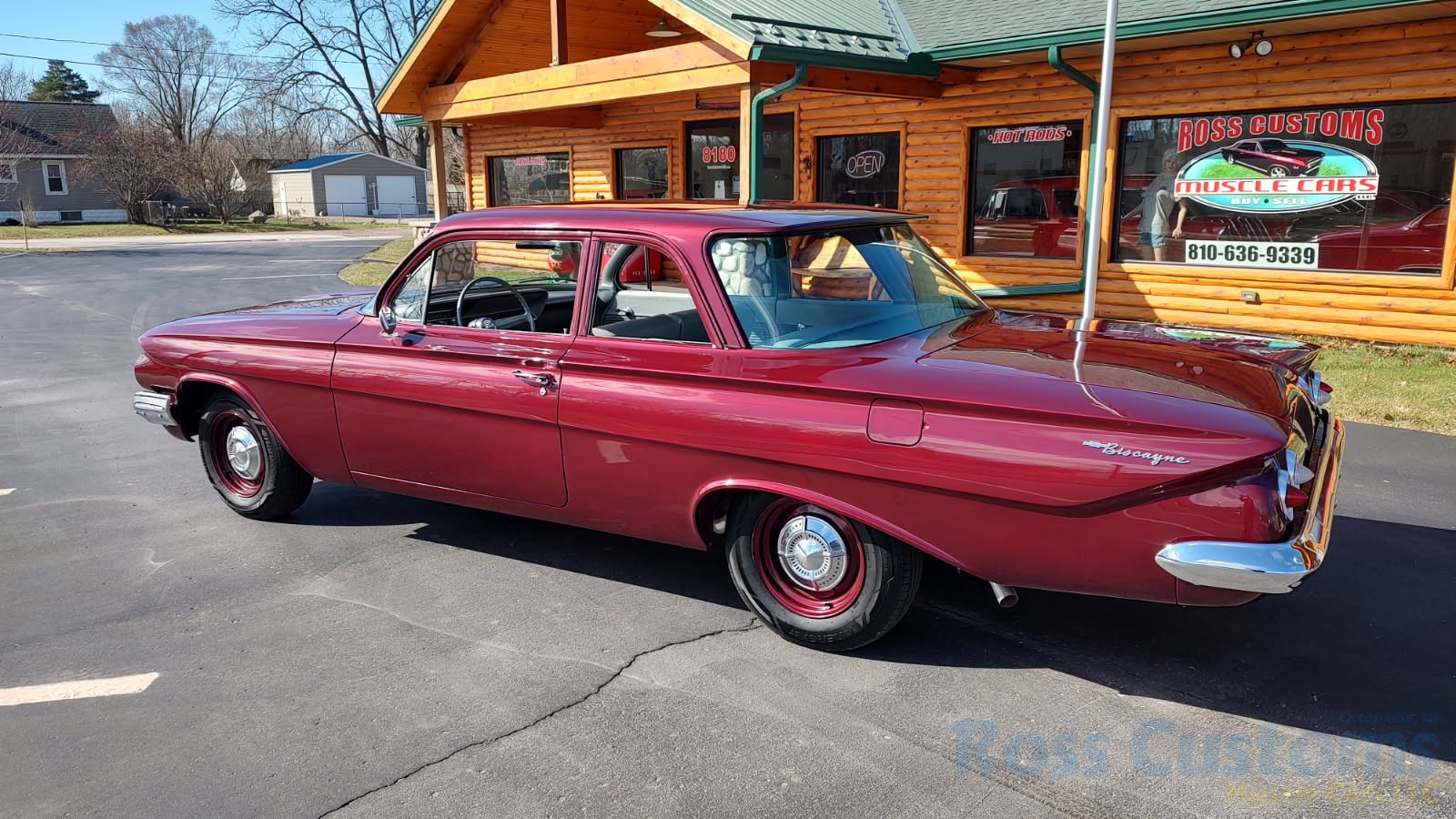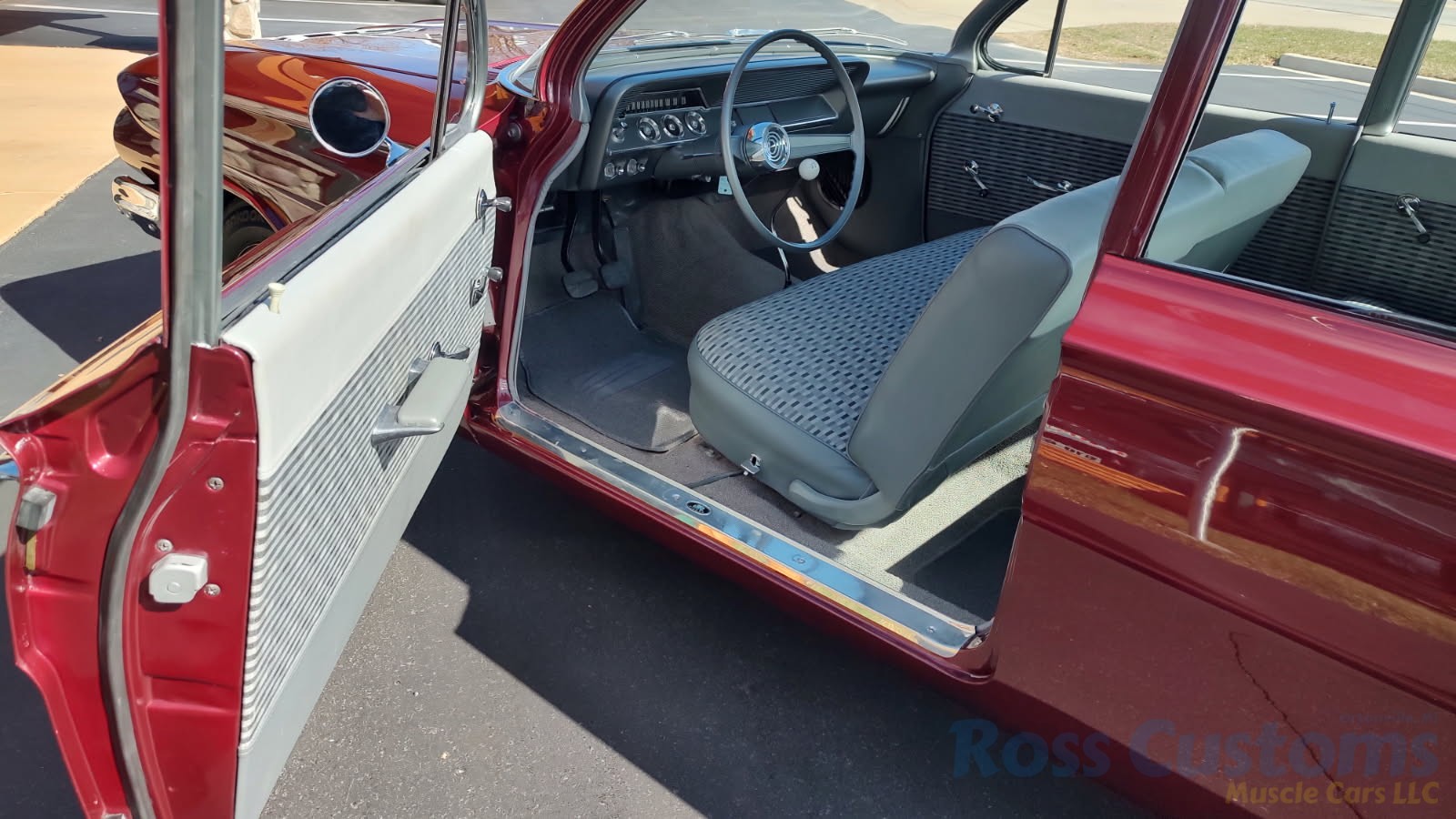 This is a very cool 61 Chevrolet Biscayne, clean Texas car that has had a complete frame off nut and bolt restoration, done in very slick Burgundy Metallic basecoat clearcoat, sanded and wheeled smooth, at time of restoration had new windshield and side glass, back glass is factory original, new window rubbers, weather striping and window felts, new side view mirror, new door handles, grill and headlight bezels are original in excellent condition, front bumper has been re-chromed, new deck lid emblem, taillight housings are original in excellent condition, new taillight lens, rear bumper has also been re-chromed.