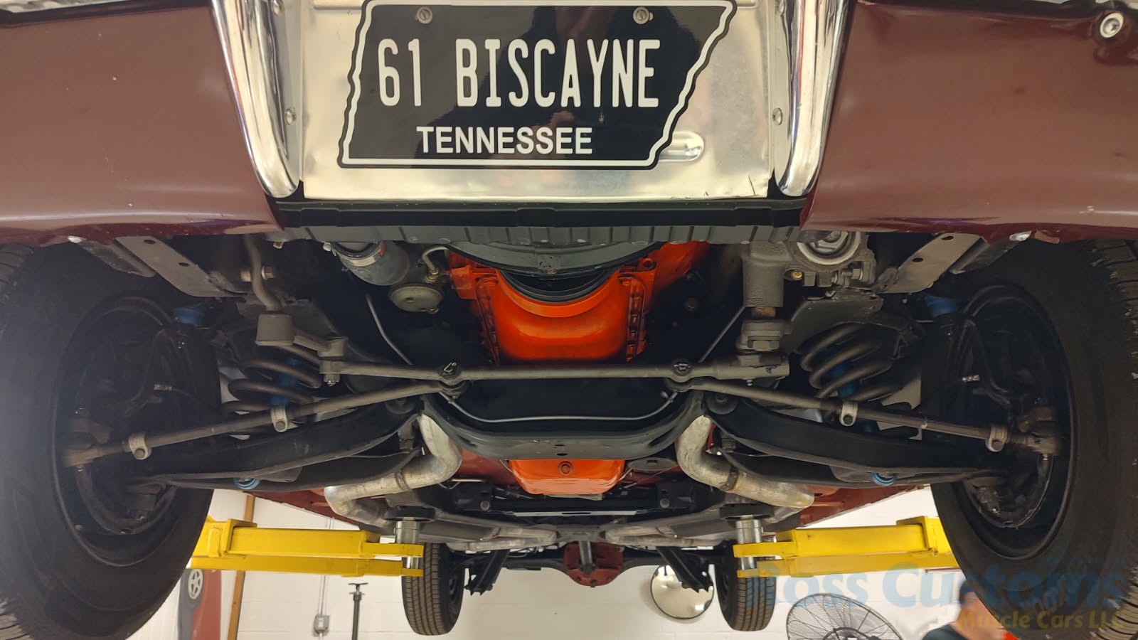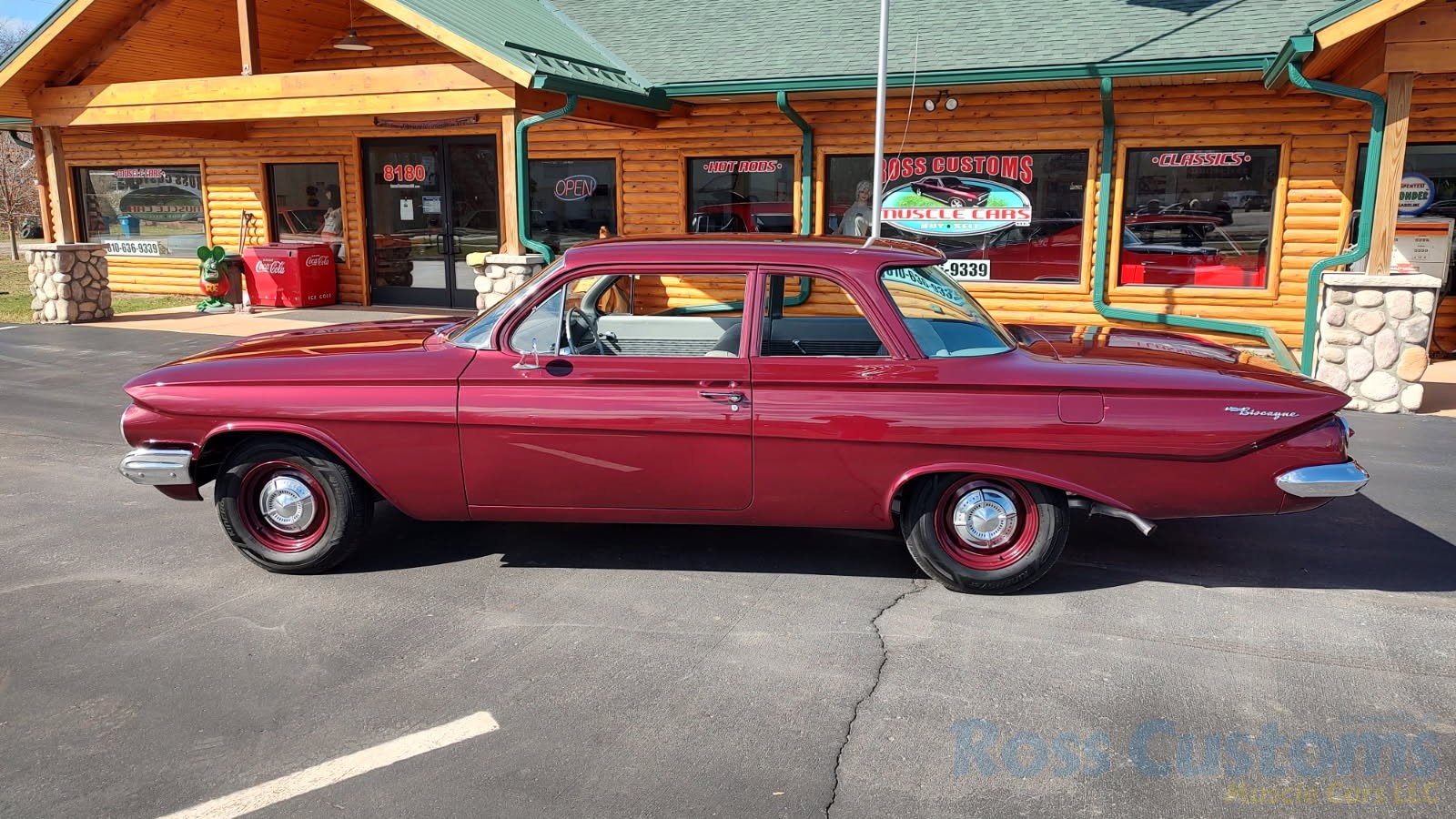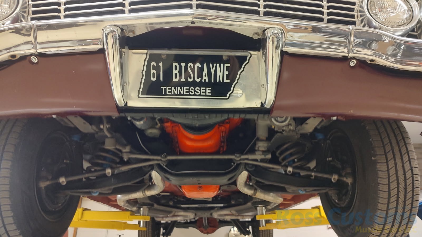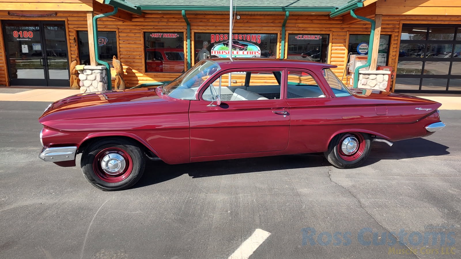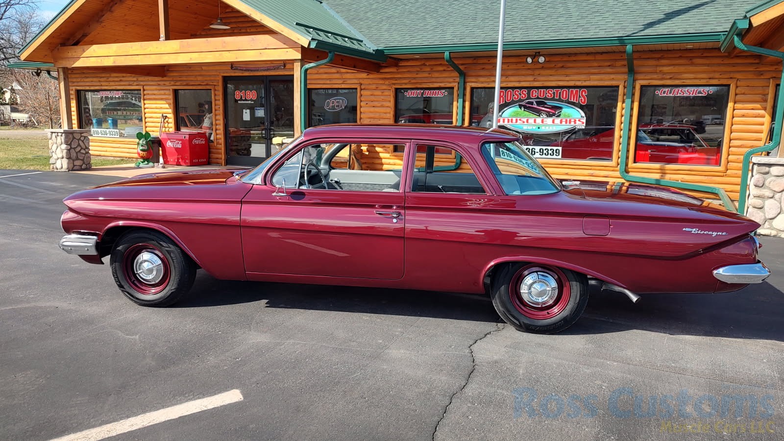 This is a very cool 61 Chevrolet Biscayne, clean Texas car that has had a complete frame off nut and bolt restoration, done in very slick Burgundy Metallic basecoat clearcoat, sanded and wheeled smooth, at time of restoration had new windshield and side glass, back glass is factory original, new window rubbers, weather striping and window felts, new side view mirror, new door handles, grill and headlight bezels are original in excellent condition, front bumper has been re-chromed, new deck lid emblem, taillight housings are original in excellent condition, new taillight lens, rear bumper has also been re-chromed.