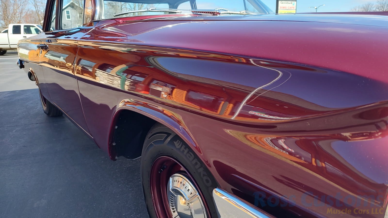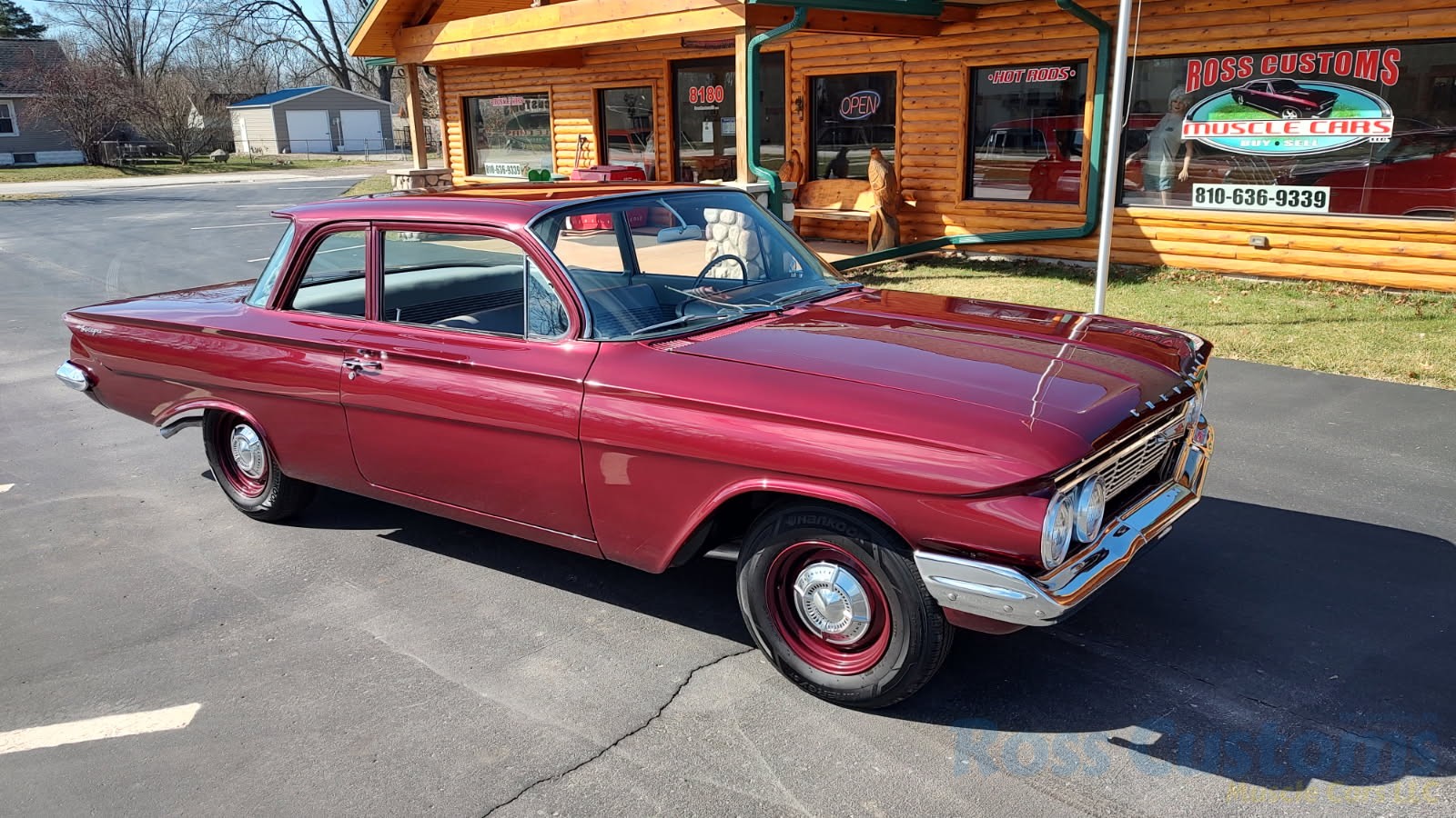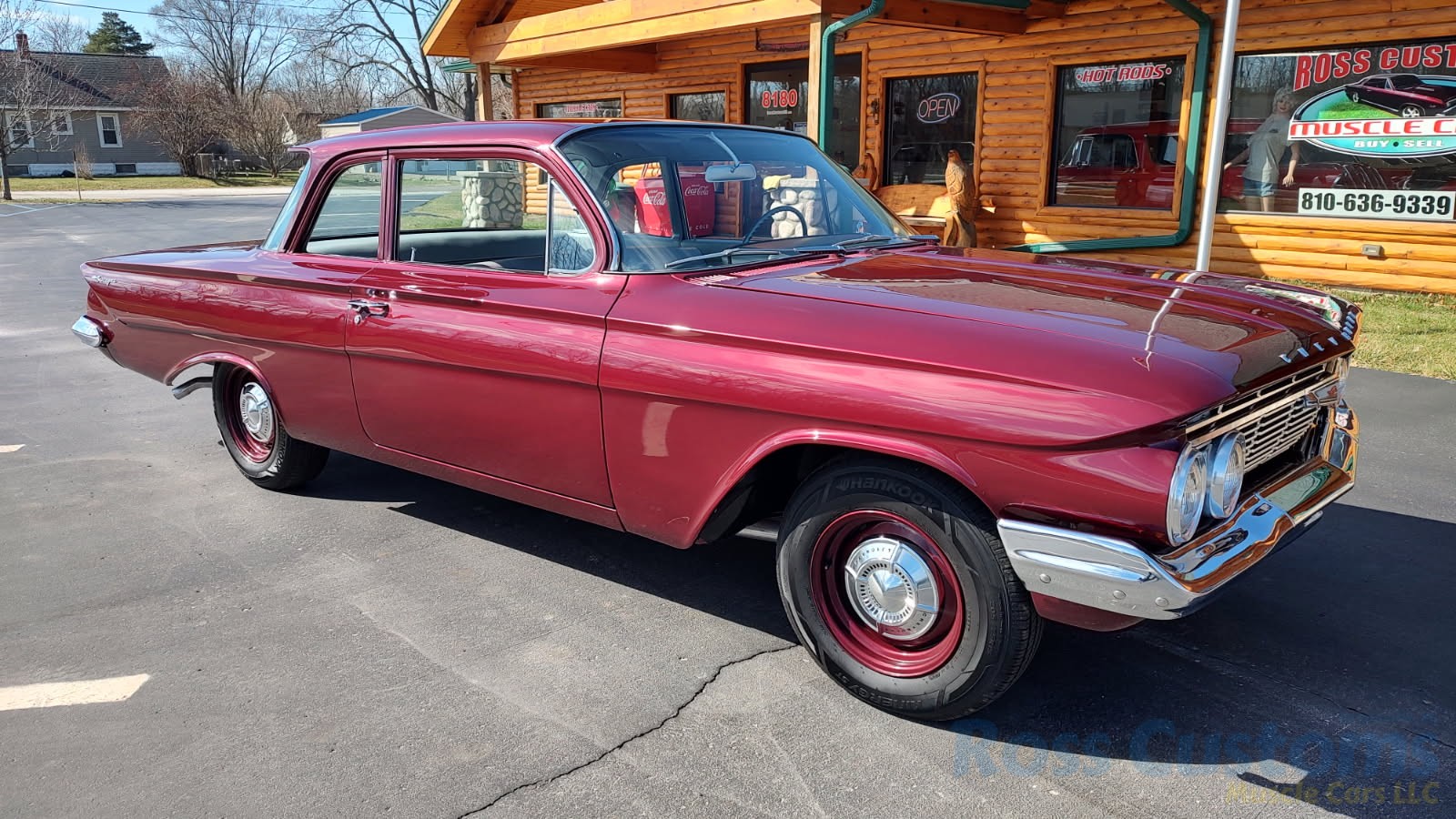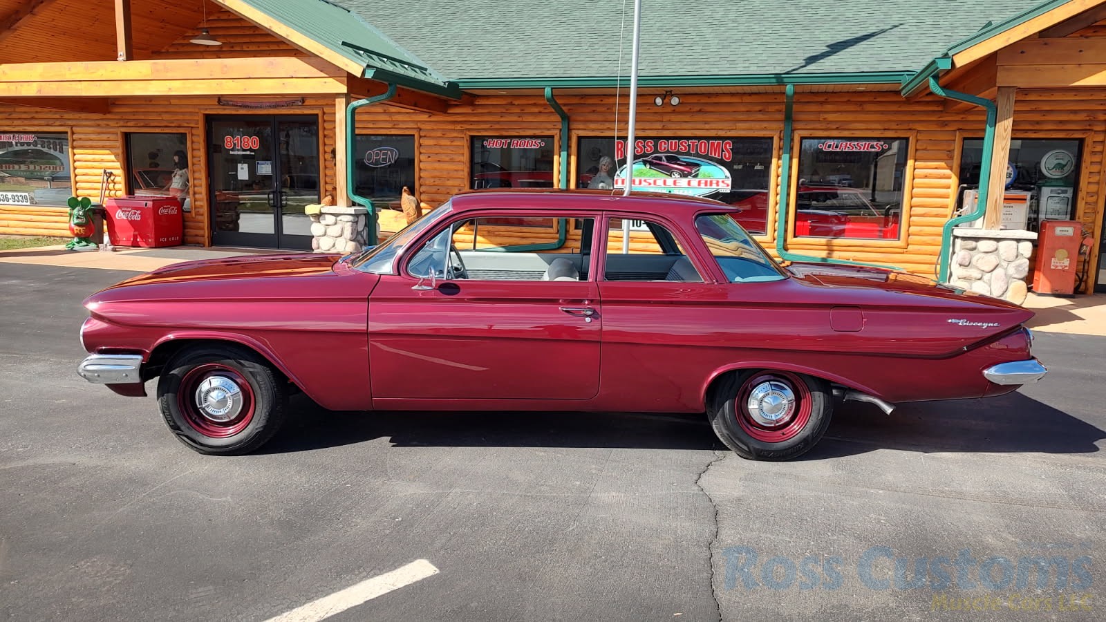 This is a very cool 61 Chevrolet Biscayne, clean Texas car that has had a complete frame off nut and bolt restoration, done in very slick Burgundy Metallic basecoat clearcoat, sanded and wheeled smooth, at time of restoration had new windshield and side glass, back glass is factory original, new window rubbers, weather striping and window felts, new side view mirror, new door handles, grill and headlight bezels are original in excellent condition, front bumper has been re-chromed, new deck lid emblem, taillight housings are original in excellent condition, new taillight lens, rear bumper has also been re-chromed.