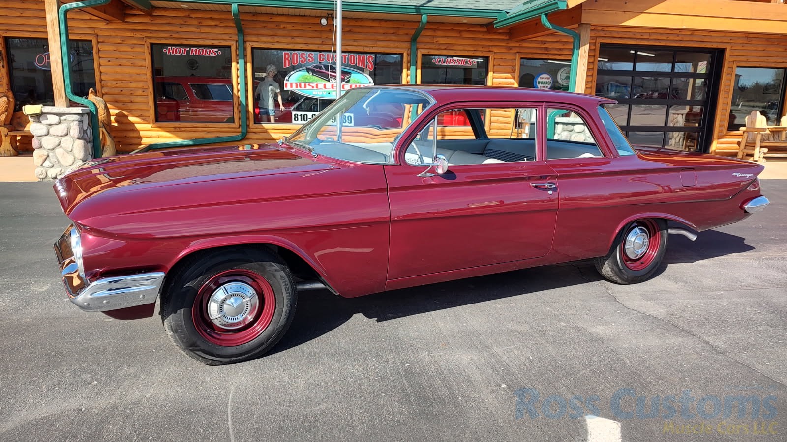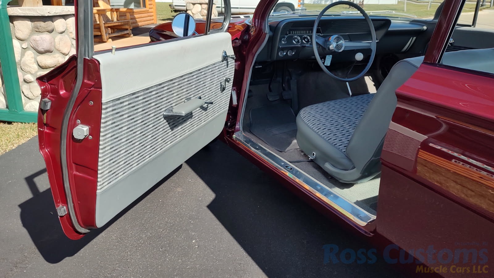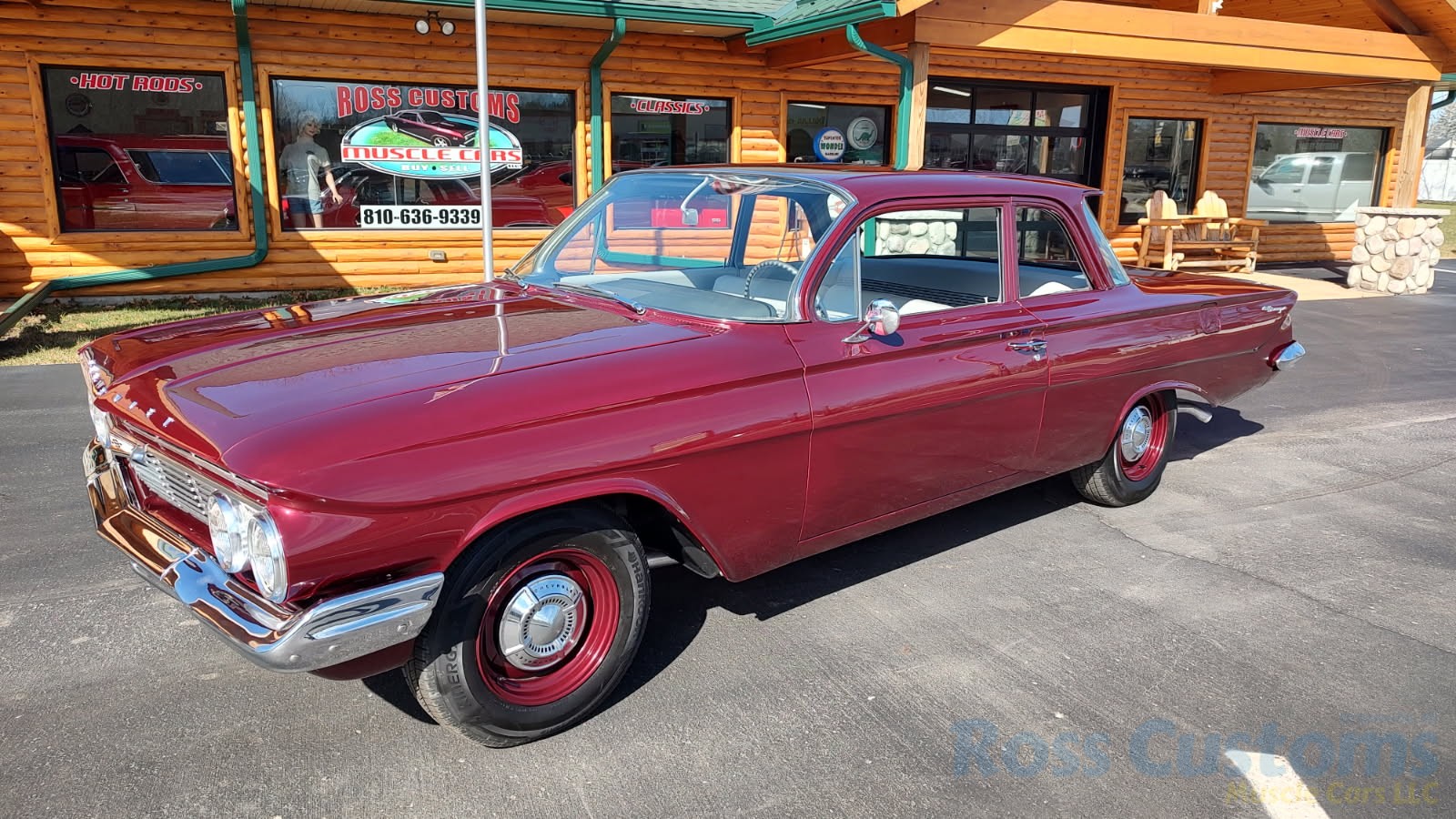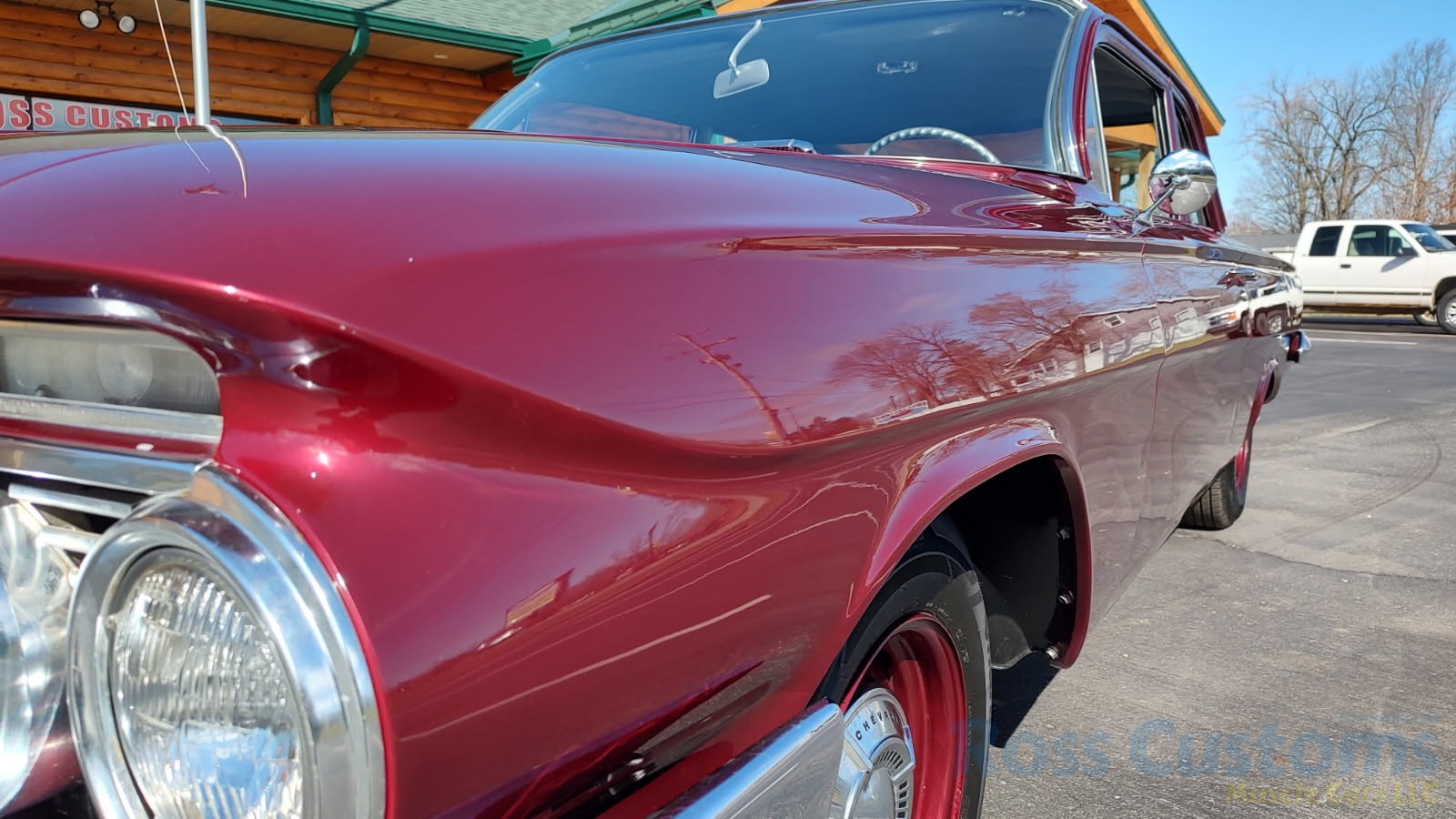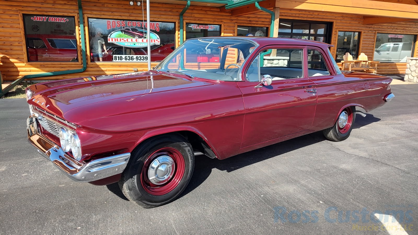 This is a very cool 61 Chevrolet Biscayne, clean Texas car that has had a complete frame off nut and bolt restoration, done in very slick Burgundy Metallic basecoat clearcoat, sanded and wheeled smooth, at time of restoration had new windshield and side glass, back glass is factory original, new window rubbers, weather striping and window felts, new side view mirror, new door handles, grill and headlight bezels are original in excellent condition, front bumper has been re-chromed, new deck lid emblem, taillight housings are original in excellent condition, new taillight lens, rear bumper has also been re-chromed.
