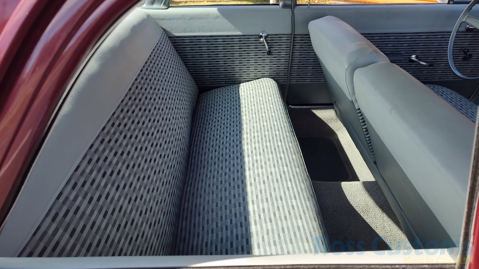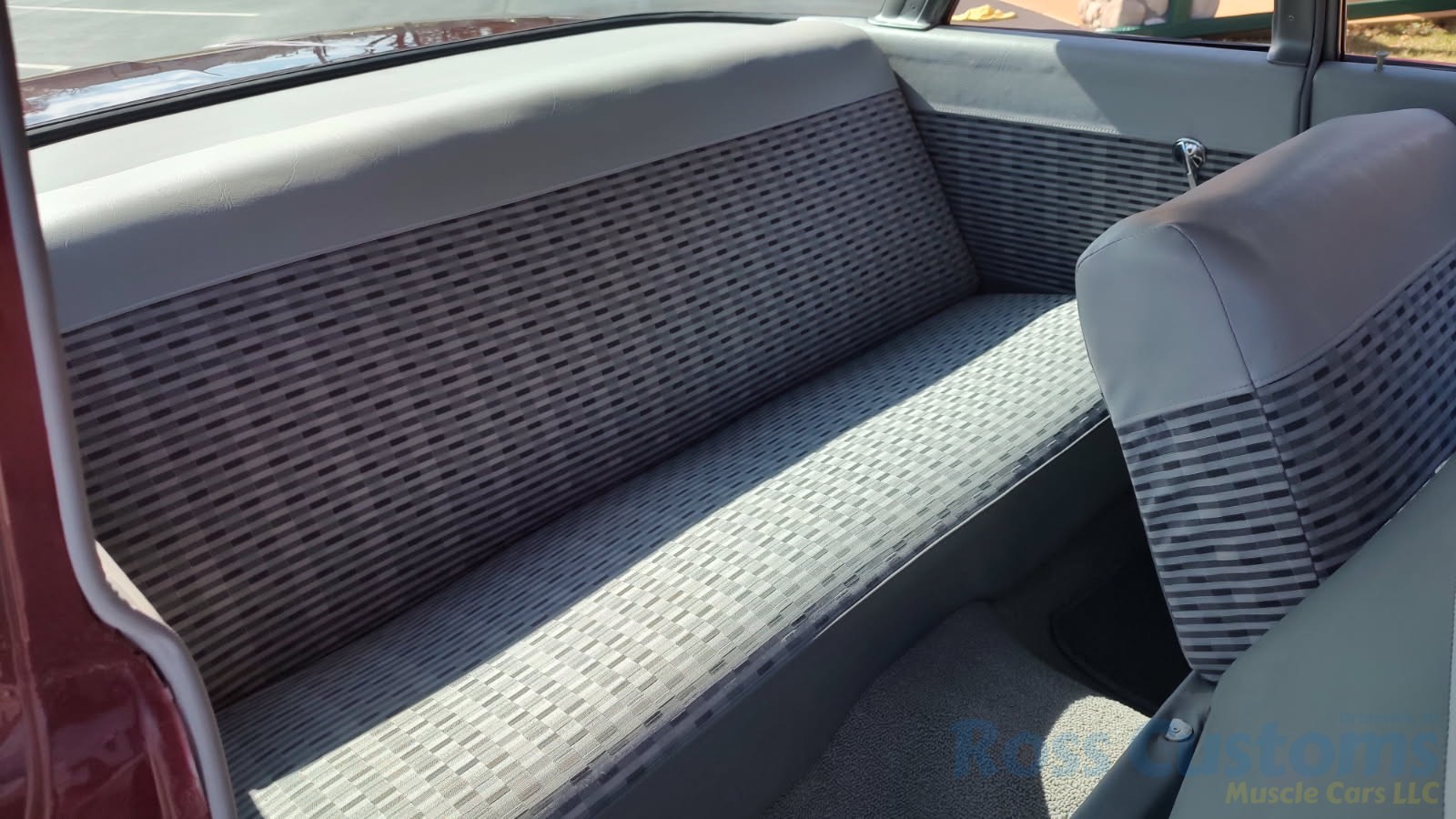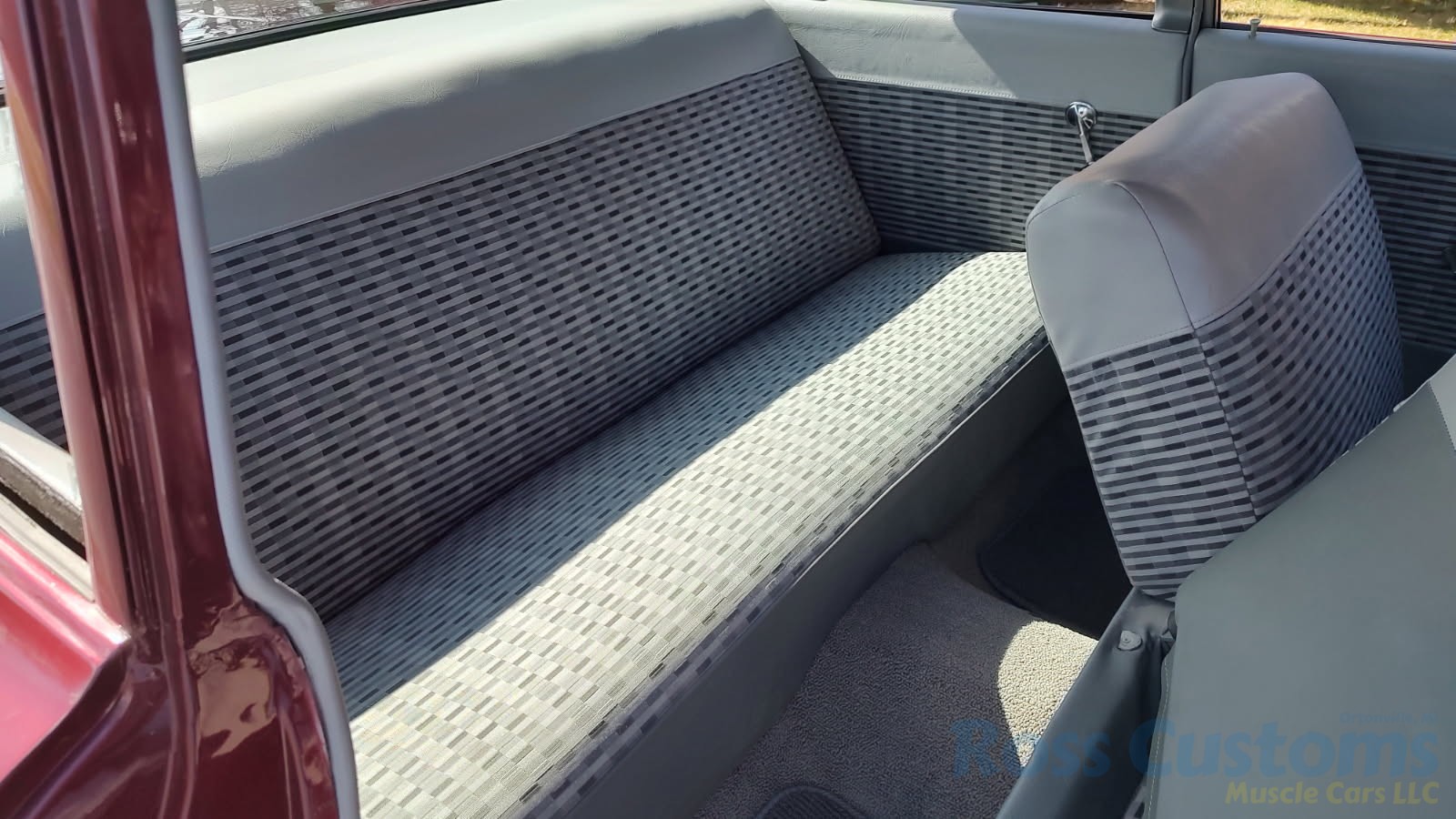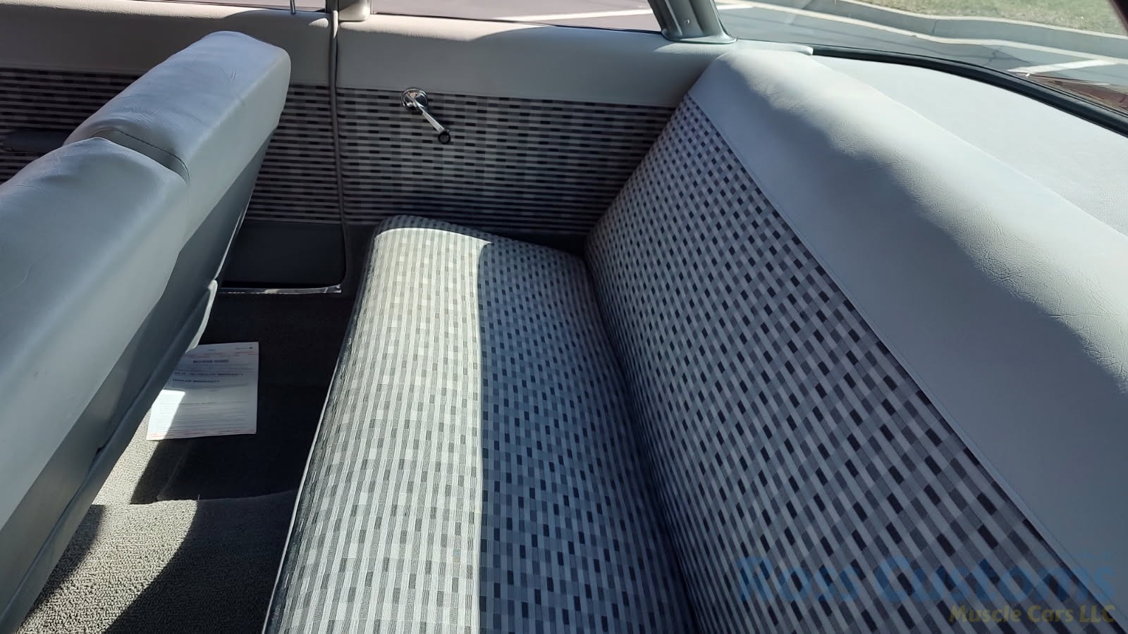 2 tone gray factory type interior, all garnish moldings and dash have been refinished, dash bezel and trim have been reconditioned, original gauges in good working condition, speedo showing 77,000 miles, original steering wheel in excellent condition, new wiring, new visors and headliner, front and rear door panels were custom made using factory materials, new window cranks and handles, new front arm rest, front and rear seats were also reupholstered, new carpet, floor mats and still plates, original type 4 speed shifter.