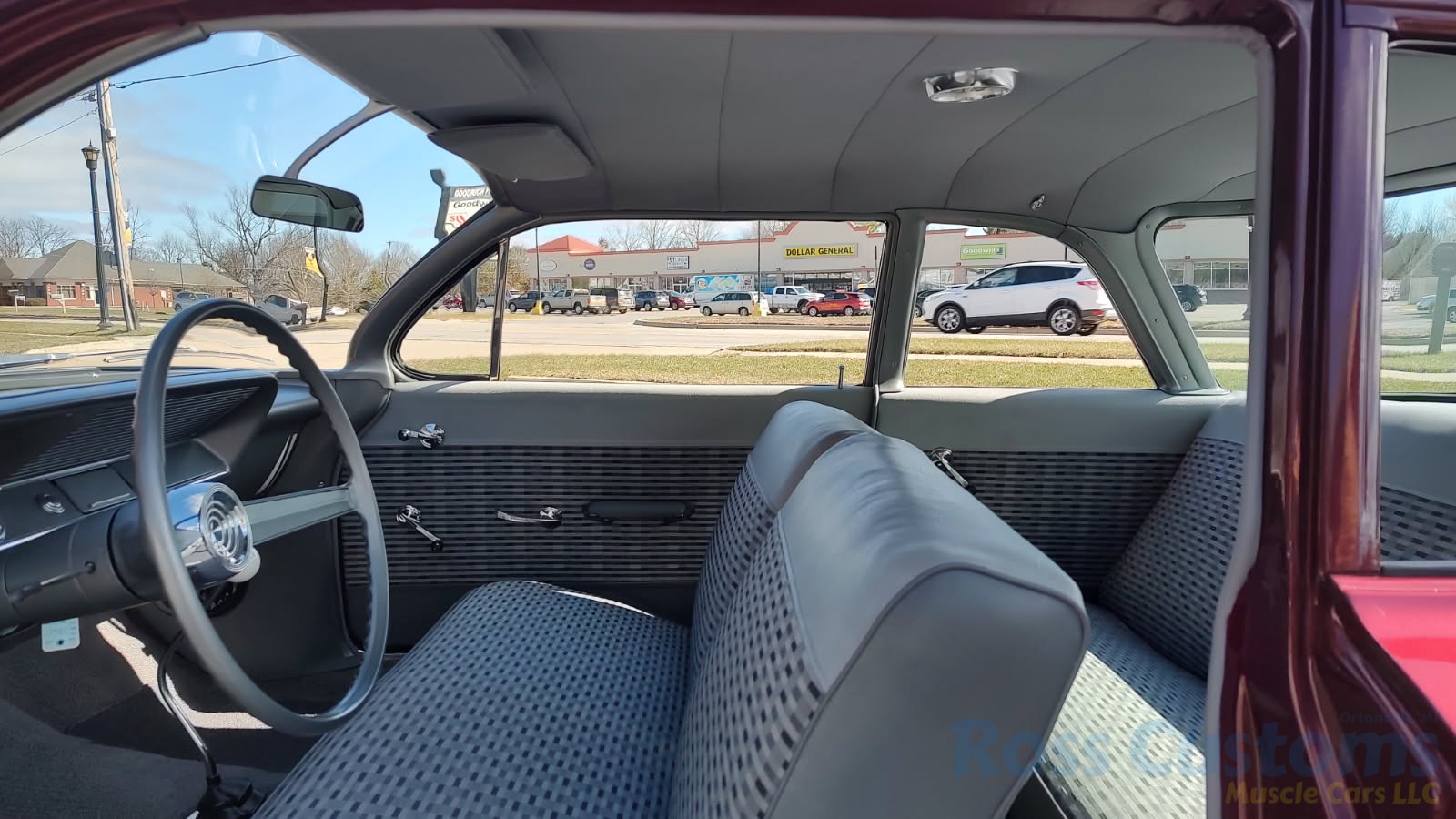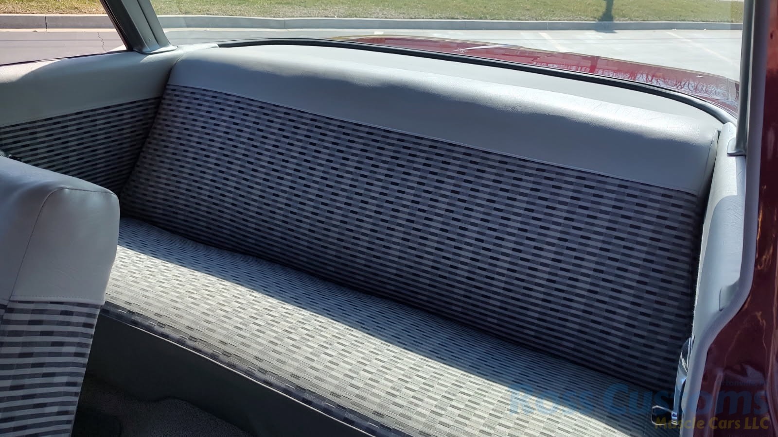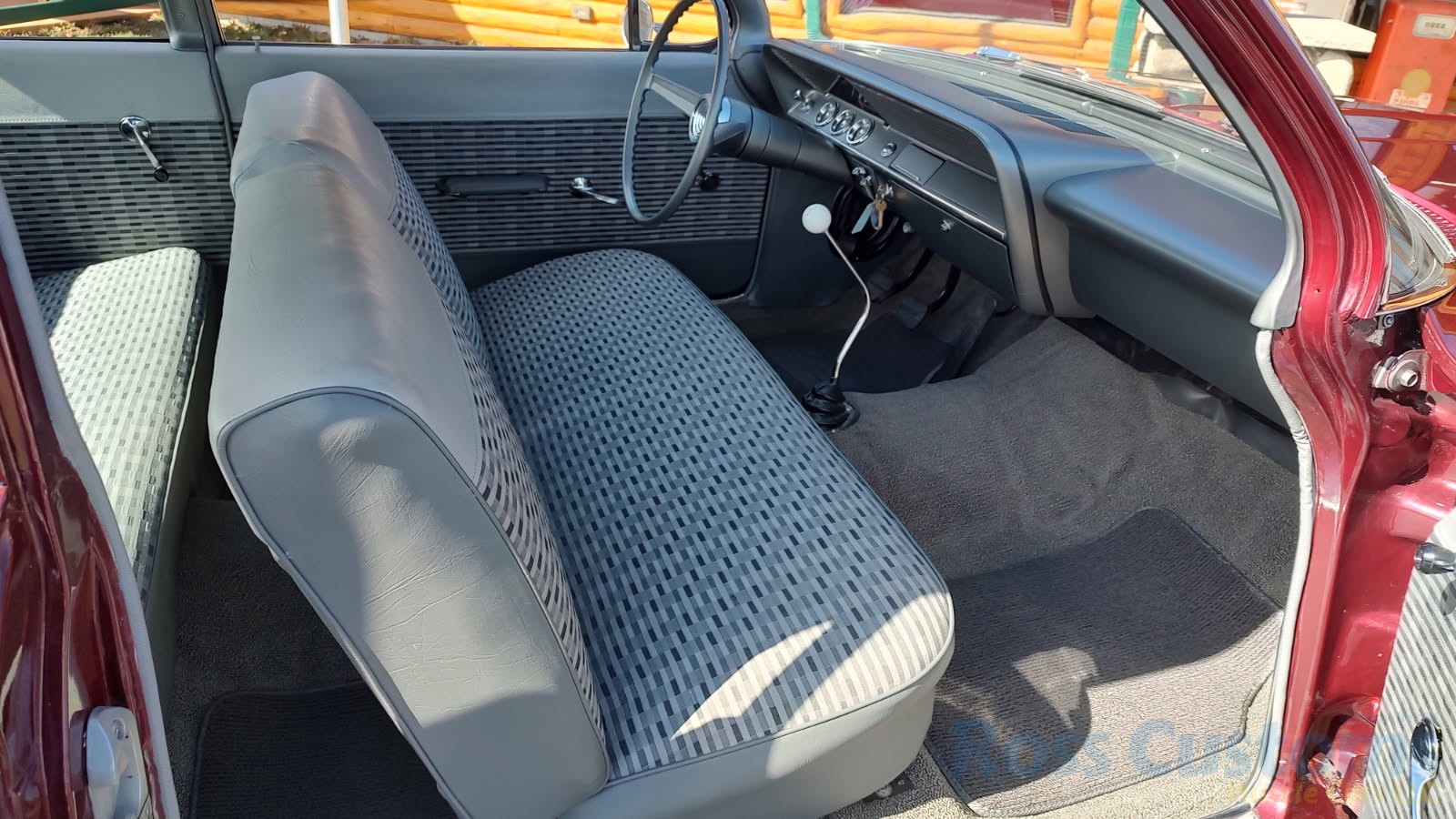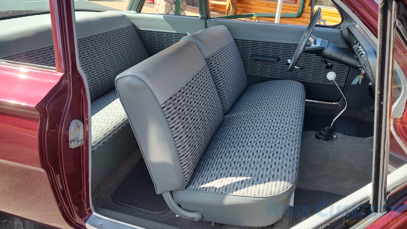 2 tone gray factory type interior, all garnish moldings and dash have been refinished, dash bezel and trim have been reconditioned, original gauges in good working condition, speedo showing 77,000 miles, original steering wheel in excellent condition, new wiring, new visors and headliner, front and rear door panels were custom made using factory materials, new window cranks and handles, new front arm rest, front and rear seats were also reupholstered, new carpet, floor mats and still plates, original type 4 speed shifter.