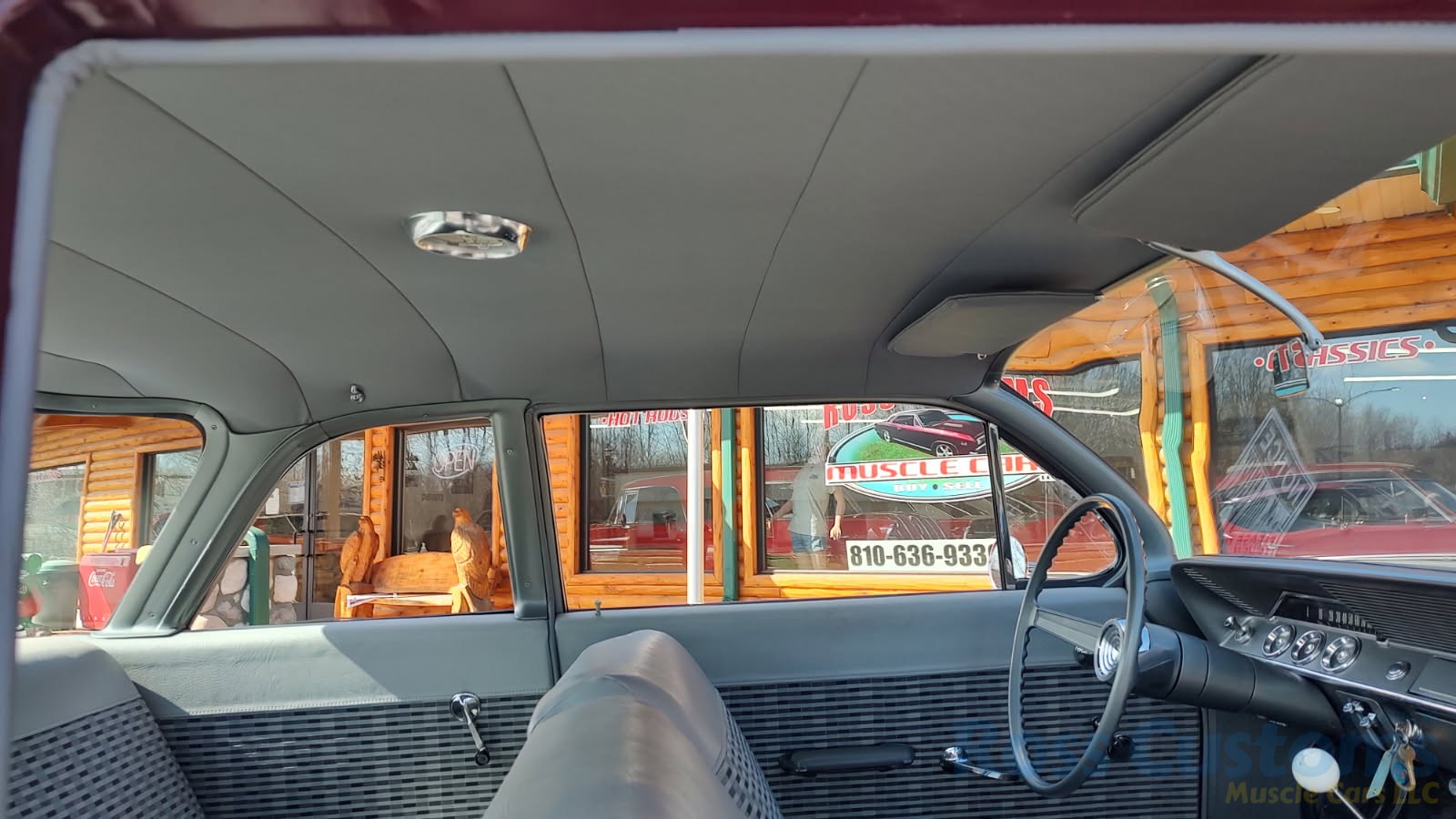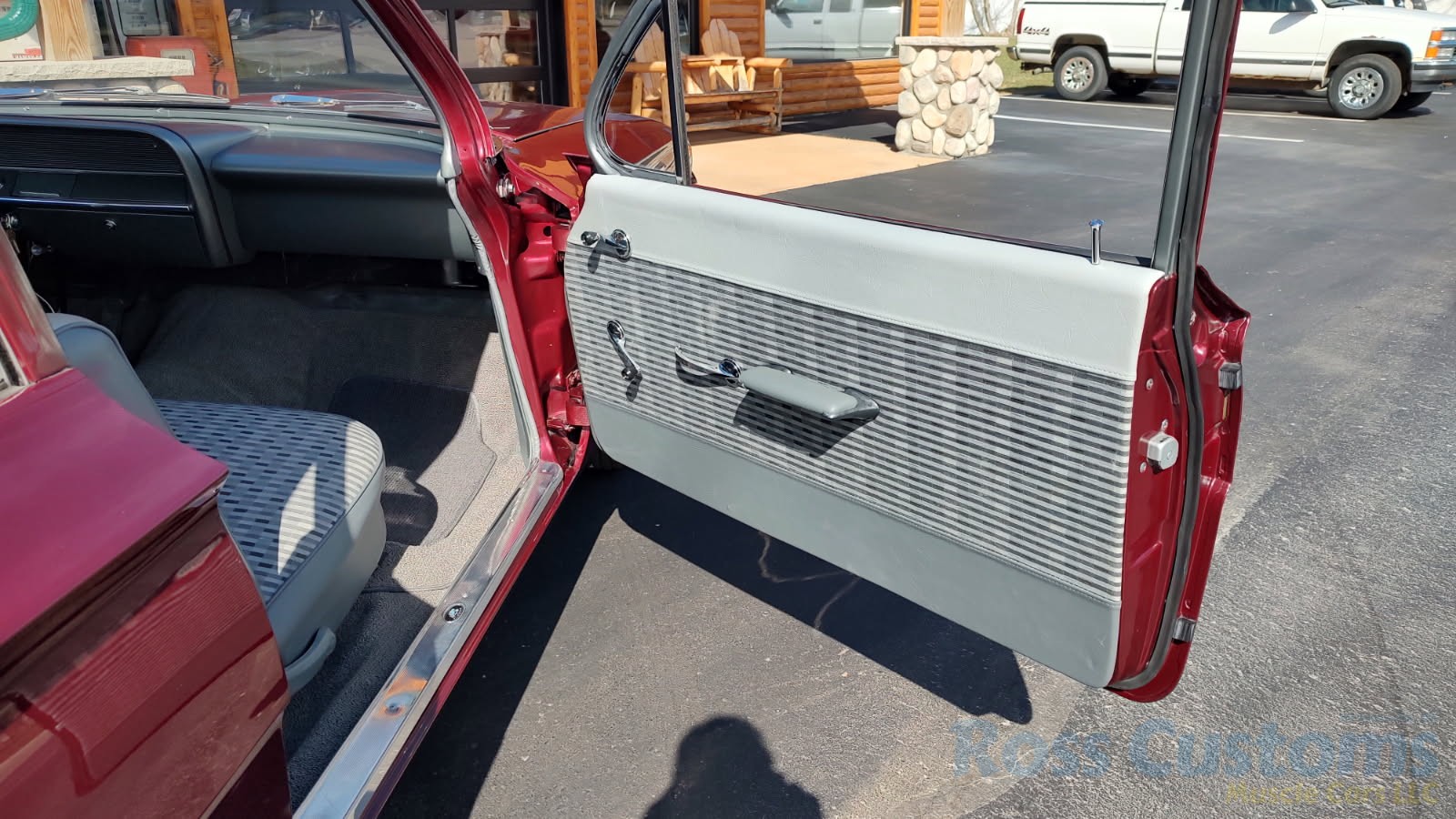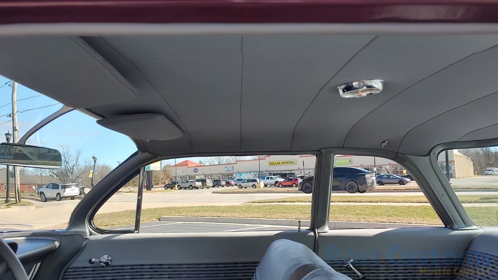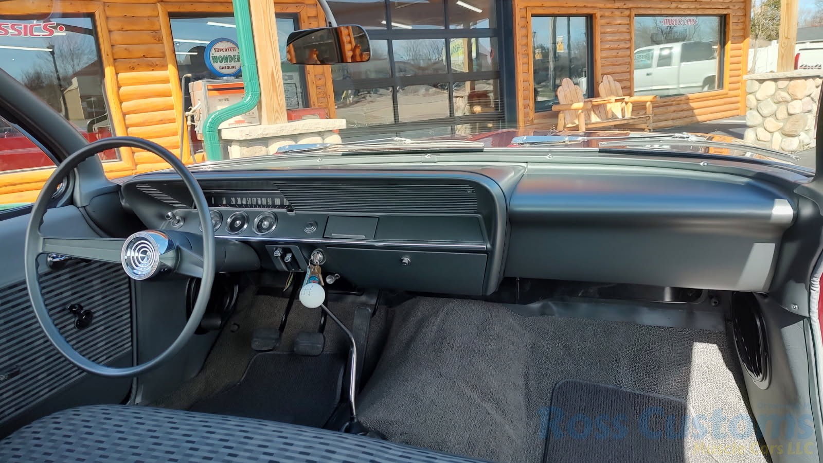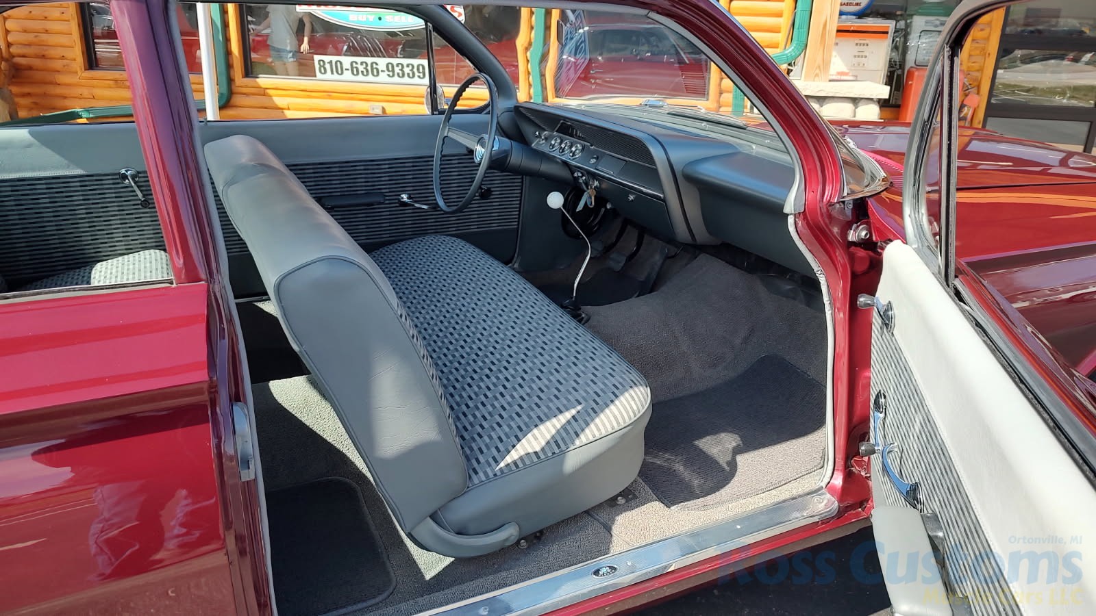 2 tone gray factory type interior, all garnish moldings and dash have been refinished, dash bezel and trim have been reconditioned, original gauges in good working condition, speedo showing 77,000 miles, original steering wheel in excellent condition, new wiring, new visors and headliner, front and rear door panels were custom made using factory materials, new window cranks and handles, new front arm rest, front and rear seats were also reupholstered, new carpet, floor mats and still plates, original type 4 speed shifter.