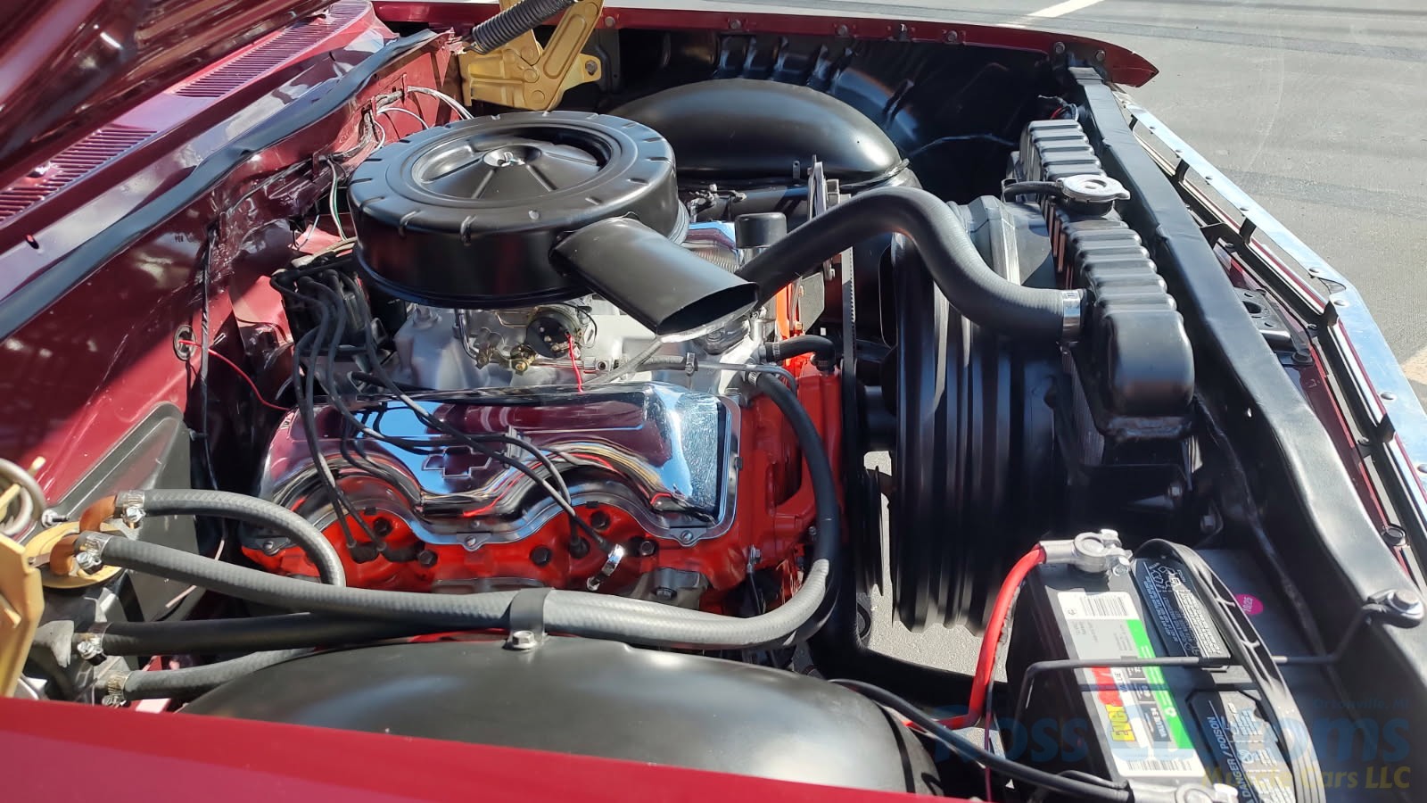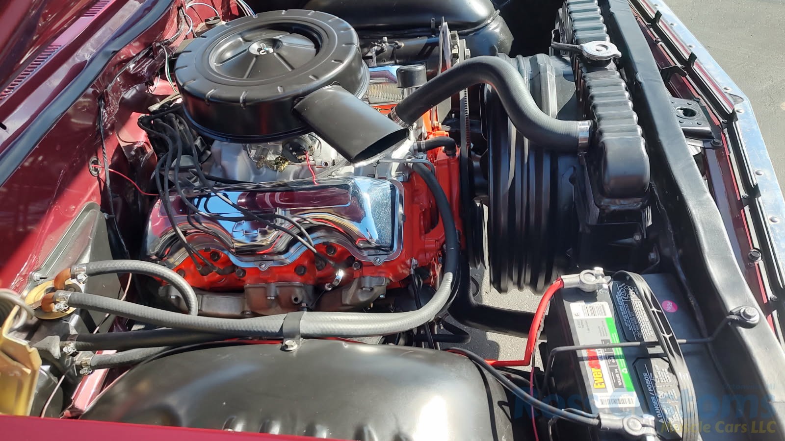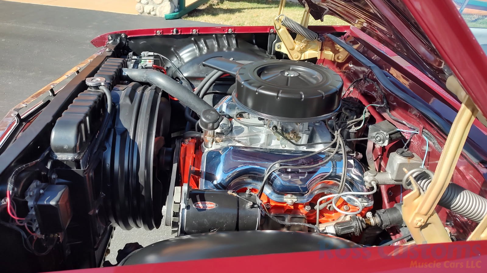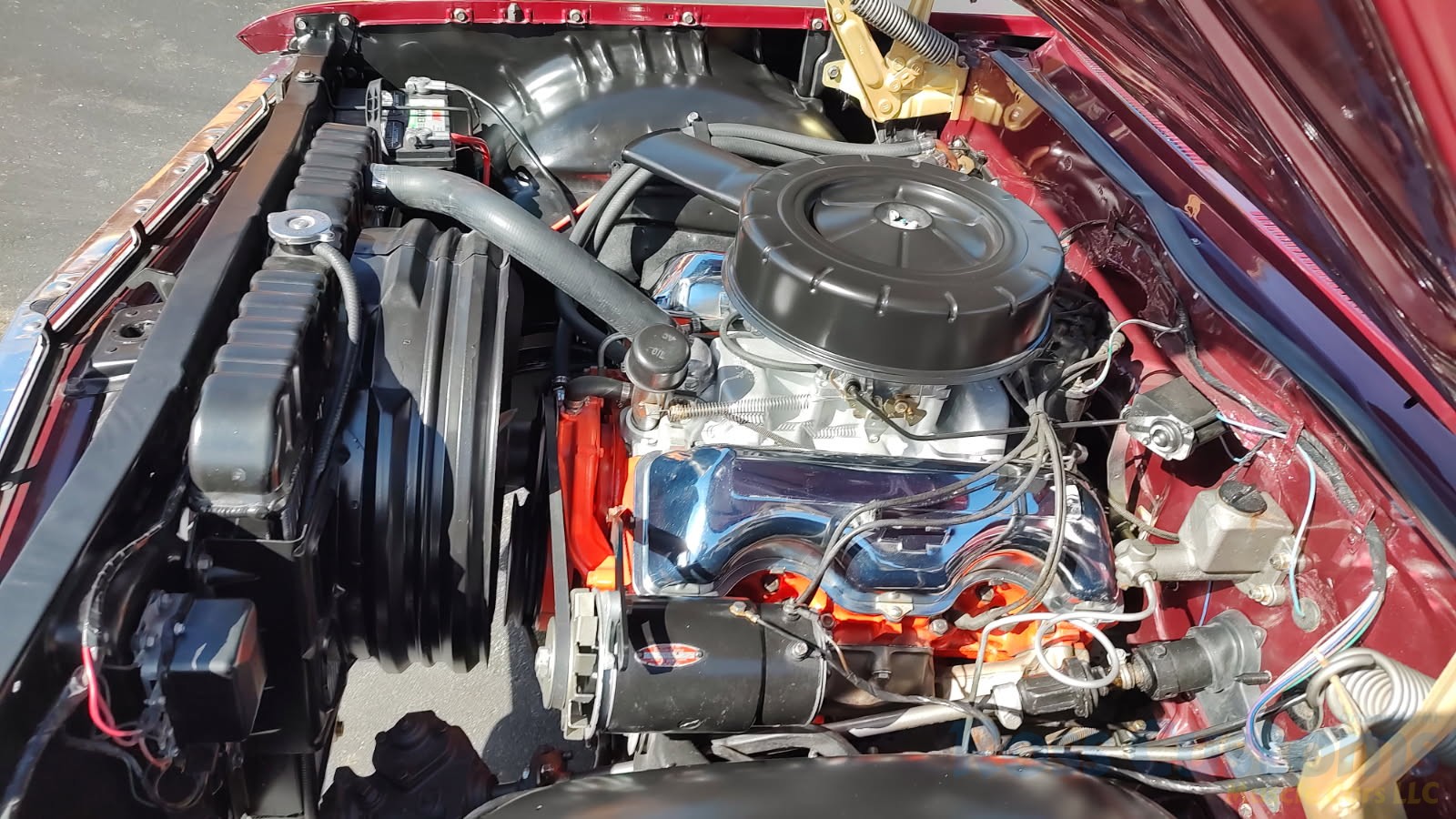 Under the hood we have a rebuilt 409, factory Winters aluminum intake, nicely outfitted with Edelbrock 4 barrel carb with electric choke, factory type ignition, chrome valve covers, factory breather, rebuilt generator, nicely updated with aluminum original appearing radiator, correct shroud and fan, front suspension has been gone through; as well as brake system, factory exhaust manifolds into 2 1/2 inch dual Flowmaster exhaust out the back in stock location, this strong running 409 is backed up with its original 4 speed trans; which has been gone through, new clutch and pressure plate, factory rear; which was rebuilt, new fuel tank and sending unit.