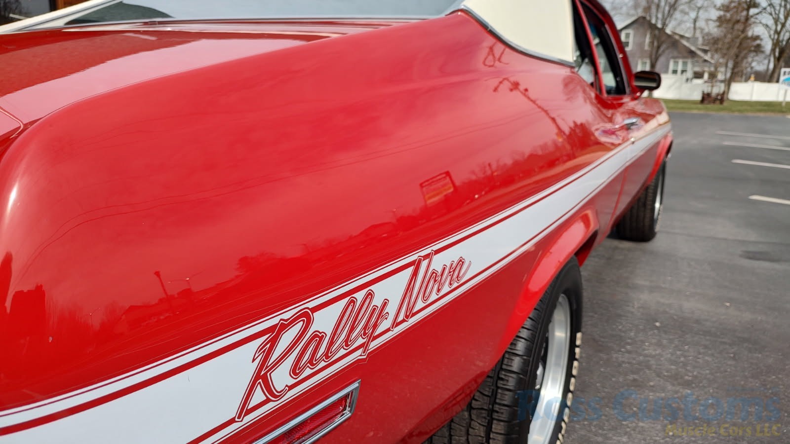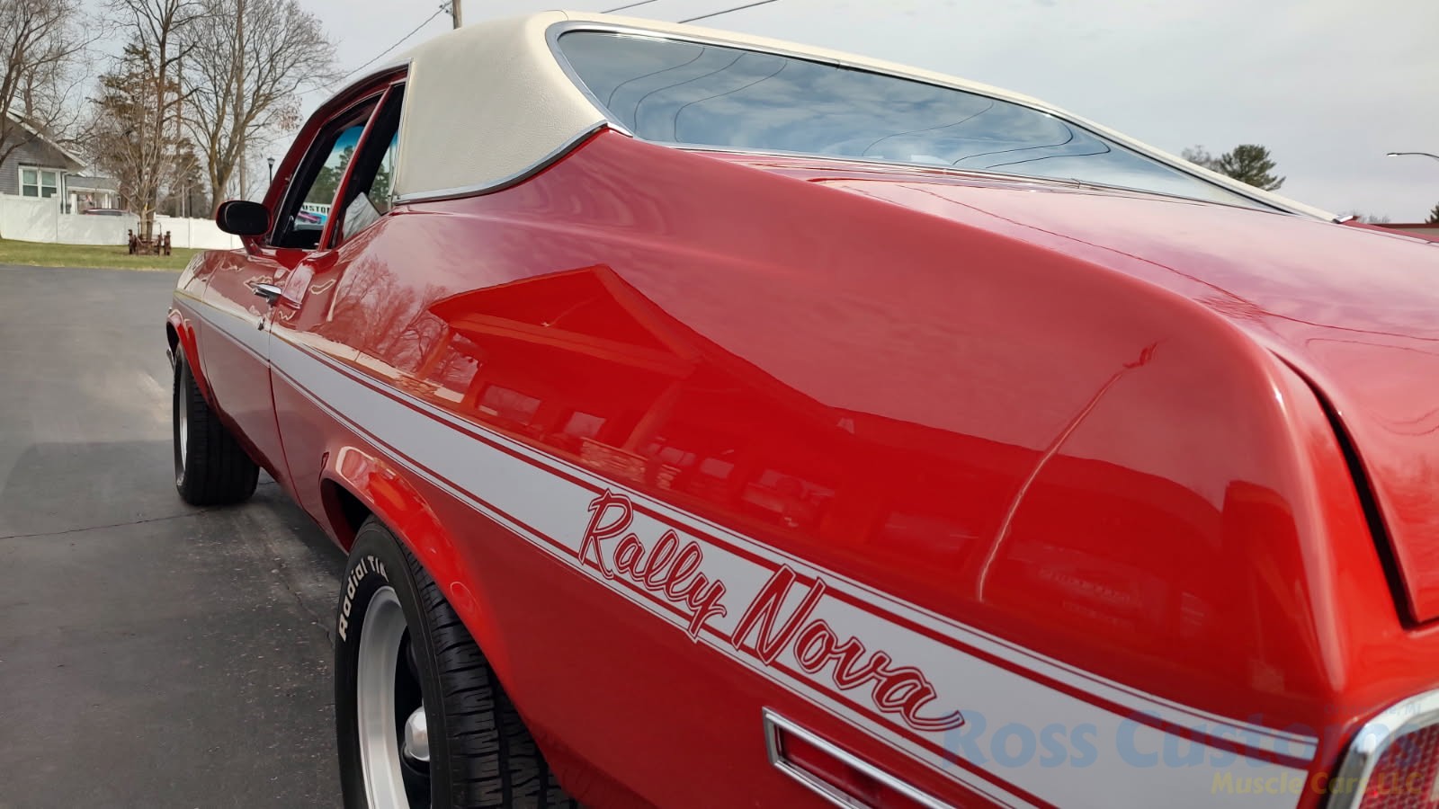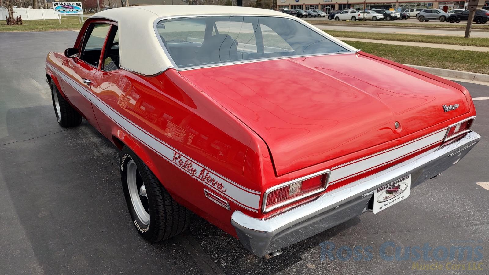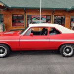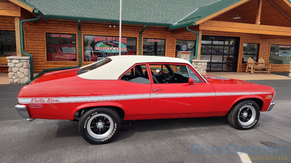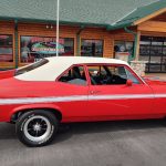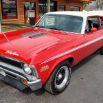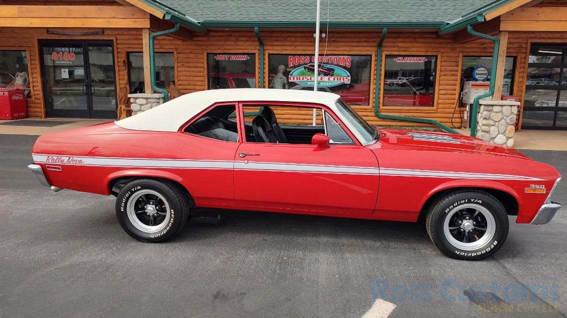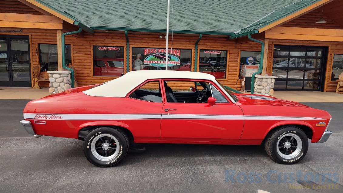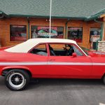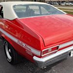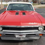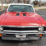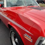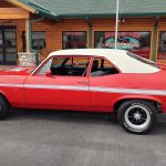 This is a very clean original panel 72 Rally Nova that has had 1 factory repaint Cranberry Red which has been sanded and wheeled smooth, vinyl top has also been replace in excellent condition, factory Rally strip, new tinted windshield; all other glass is factory original in excellent condition, all window trim and vinyl top trim are in very good condition, all weather stripping and window felts have been replaced, factory dual sport side view mirrors; driver side is remote, door handles have been replaced, previous owner added SS hood louvers for the cool look, hood moldings and fender eyebrow moldings are original in very good condition, grill and headlight bezels are also original in very good condition, front bumper has been re-chromed, added chin spoiler, original fender emblems and side markers in excellent condition, original taillights and bezels in excellent condition, re-chromed rear bumper.