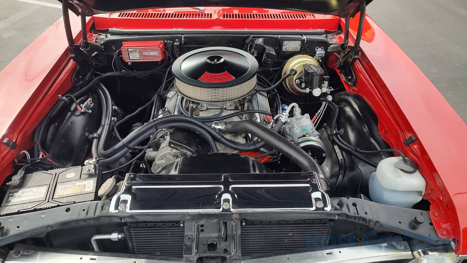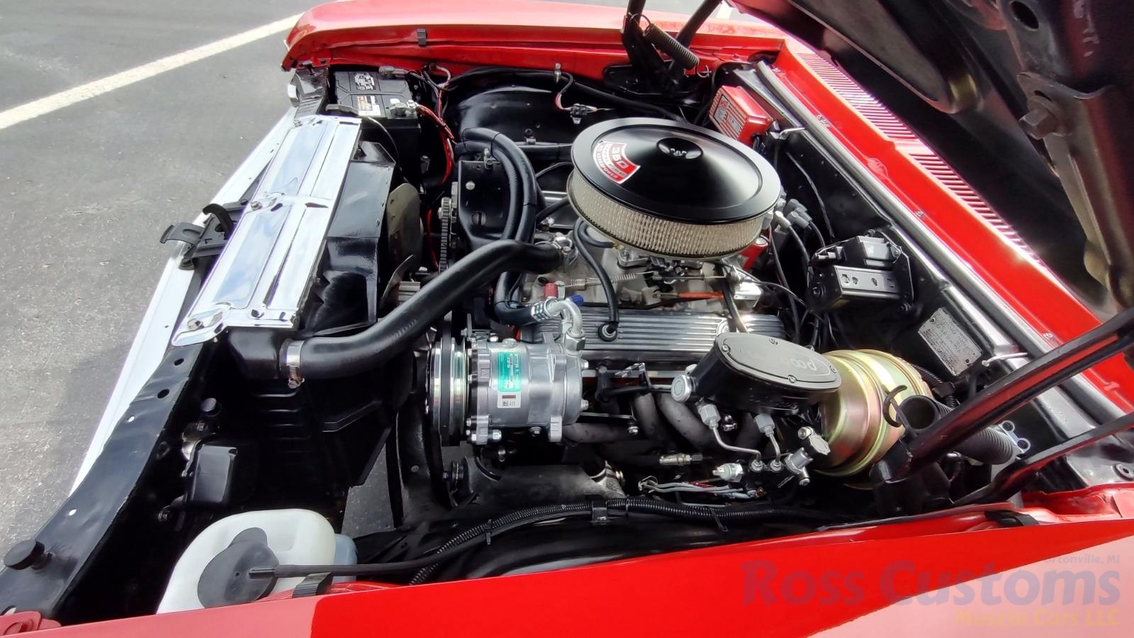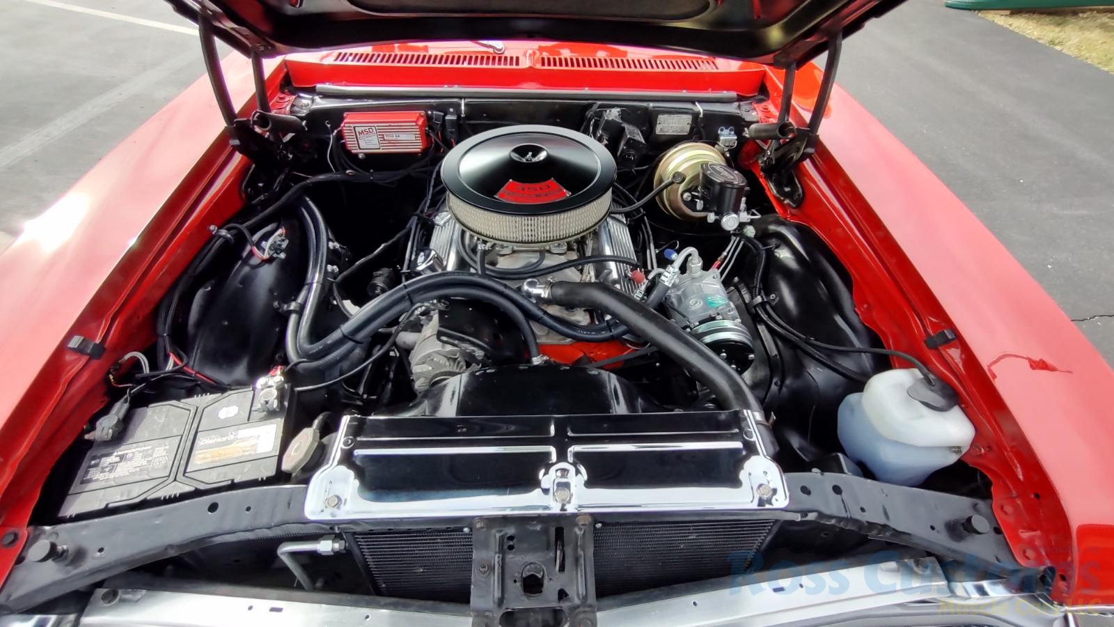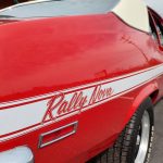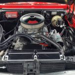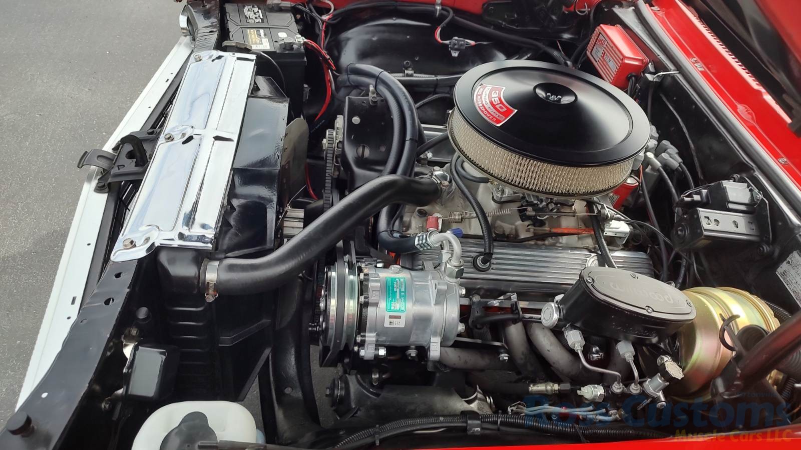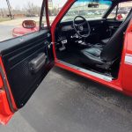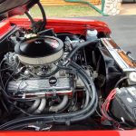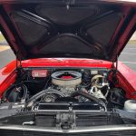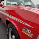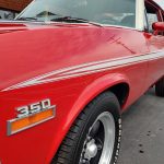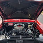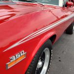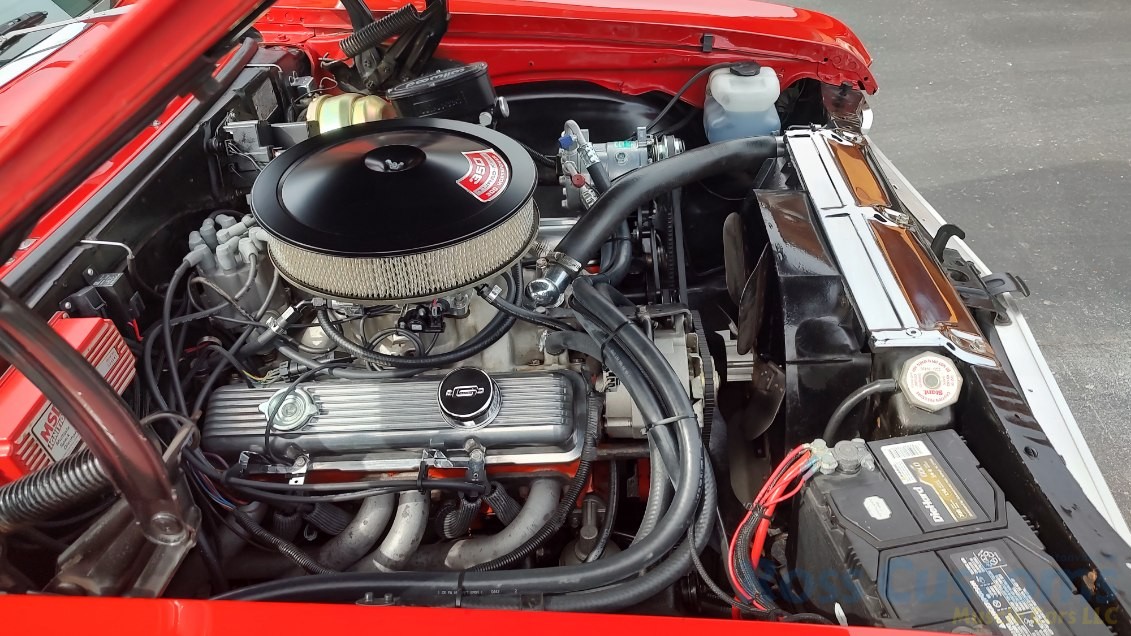 Under the hood we have the original #’s matching 350 – which has been rebuilt (per previous owner), mild cam, Edelbrock aluminum intake, nicely outfitted and upgraded with Sniper Fuel injection with correct new fuel tank and in tank pump, also updated with MSD ignition, factory finned aluminum valve covers, Vintage AC and heat, heavy duty radiator with correct shroud and fan, power steering, nicely updated with power Wilwood disc brakes up front, drilled and slotted rotors, drums out back, front suspension has been gone through, this strong running 350 is backed up with a 350 turbo trans, set of headers into 2 1/2 inch dual Flowmaster exhaust out the back, 10 bolt limited slip rear.