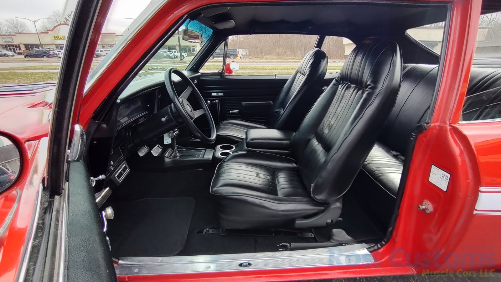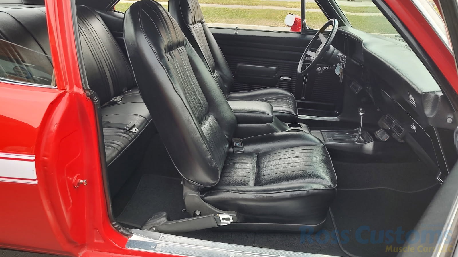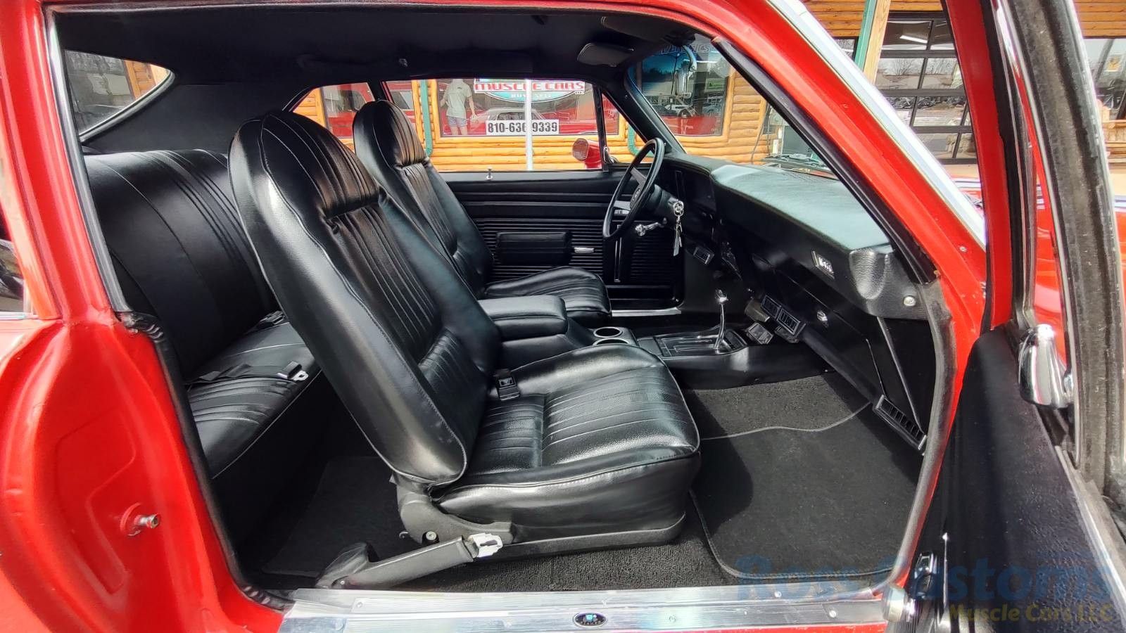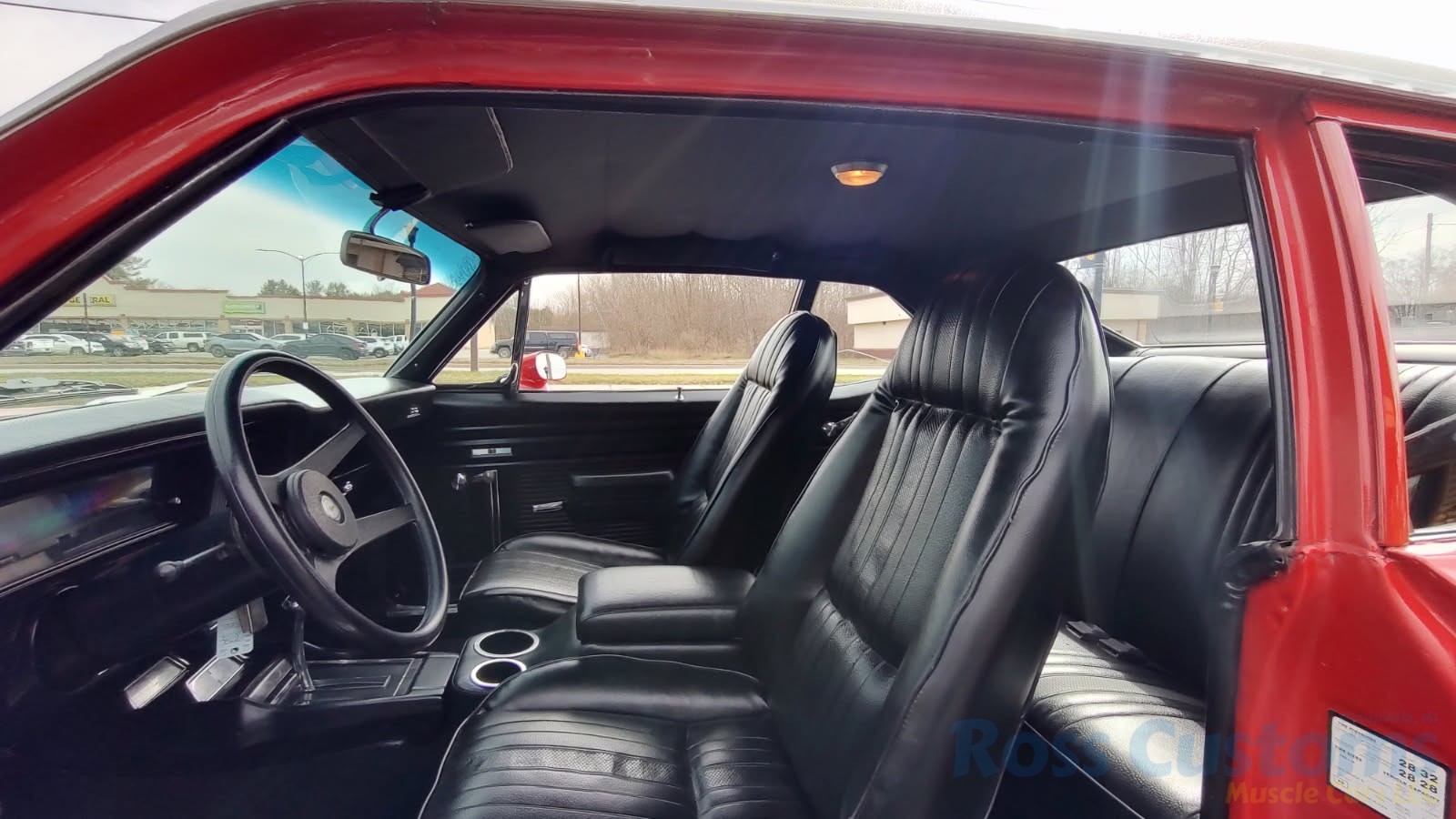 Factory black interior with bucket seats, original dash and dash pad, has rare factory gauge package with in dash tach, nicely outfitted with Vintage AC and heat with correct controls and under dash vents, Alpine AM/FM/CD stereo with bluetooth, rare center console with gauges and correct shifter, factory sport comfort grip wheel, headliner looks like new; as well as visors, front and rear door panels are original in excellent condition with new arm rest, front and rear seats have been reupholstered, front and rear seat belts, added center console with cup holders – which is removable, carpet is in excellent condition, new floor mats, original sill plates.