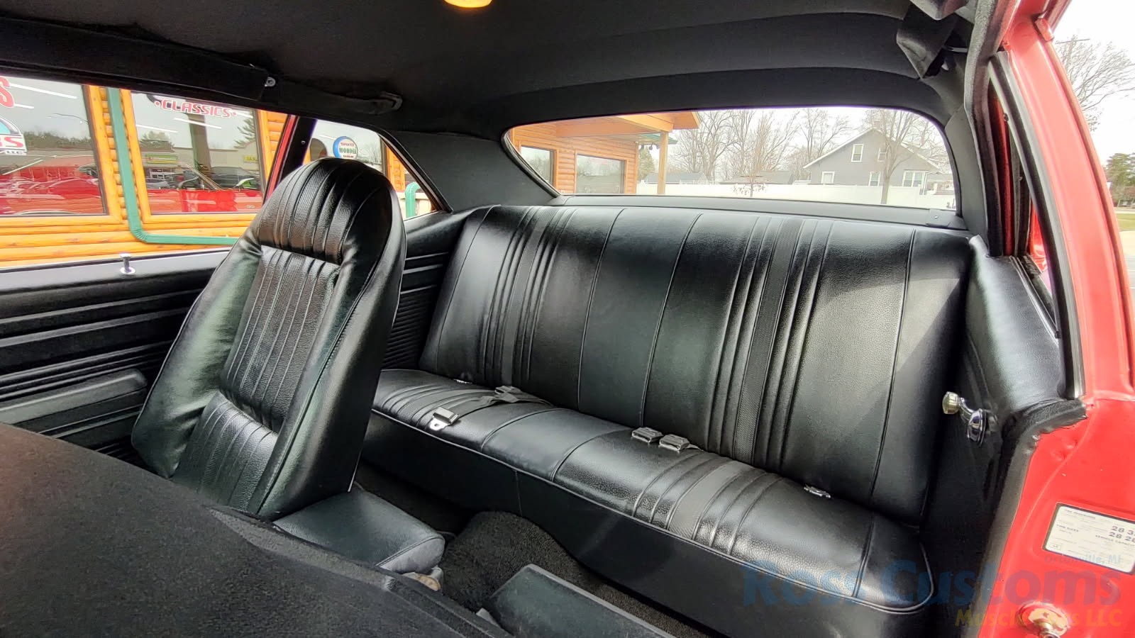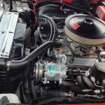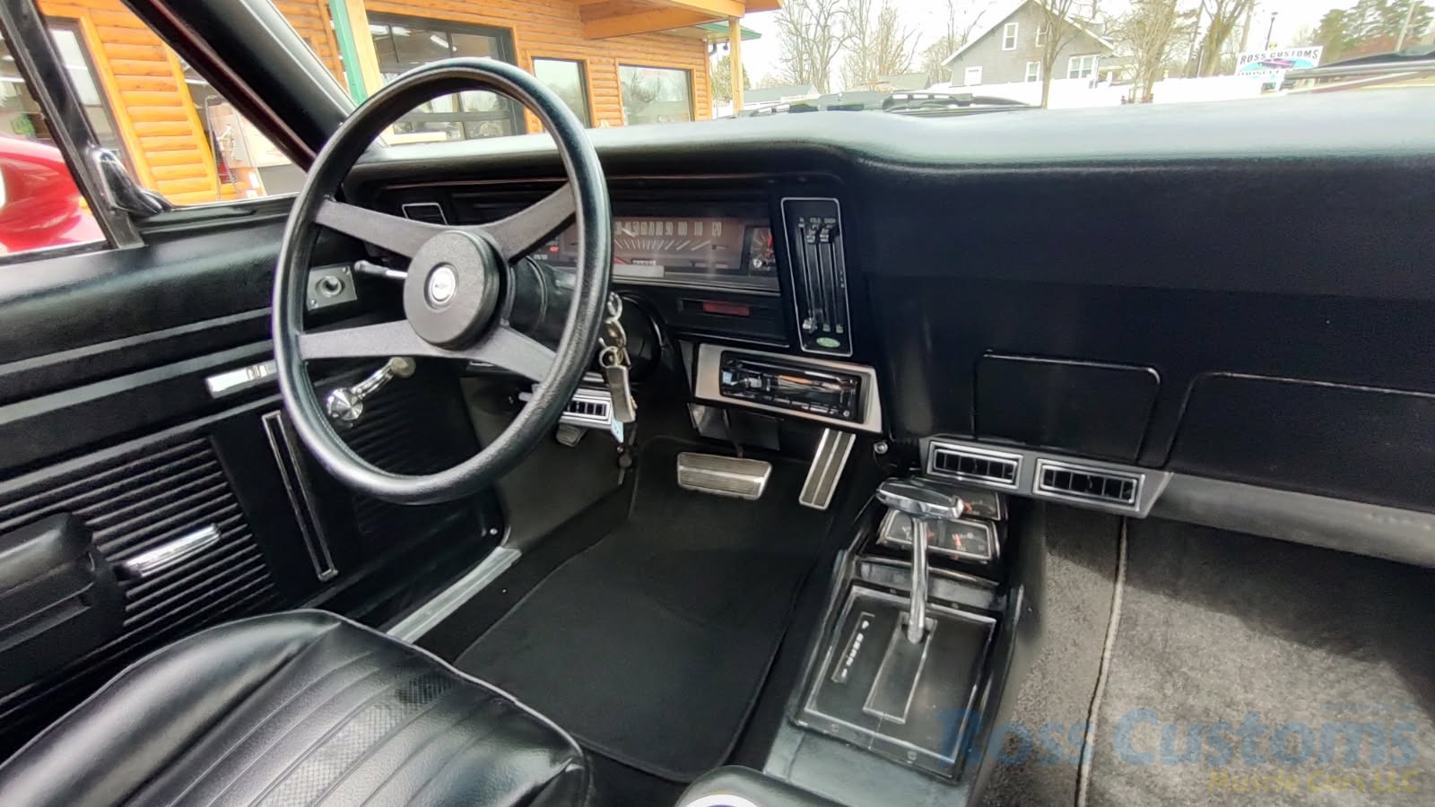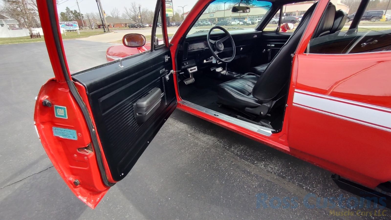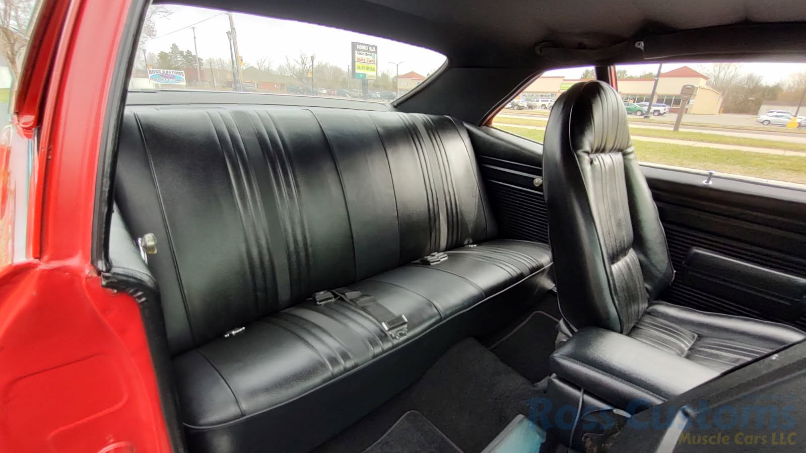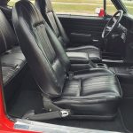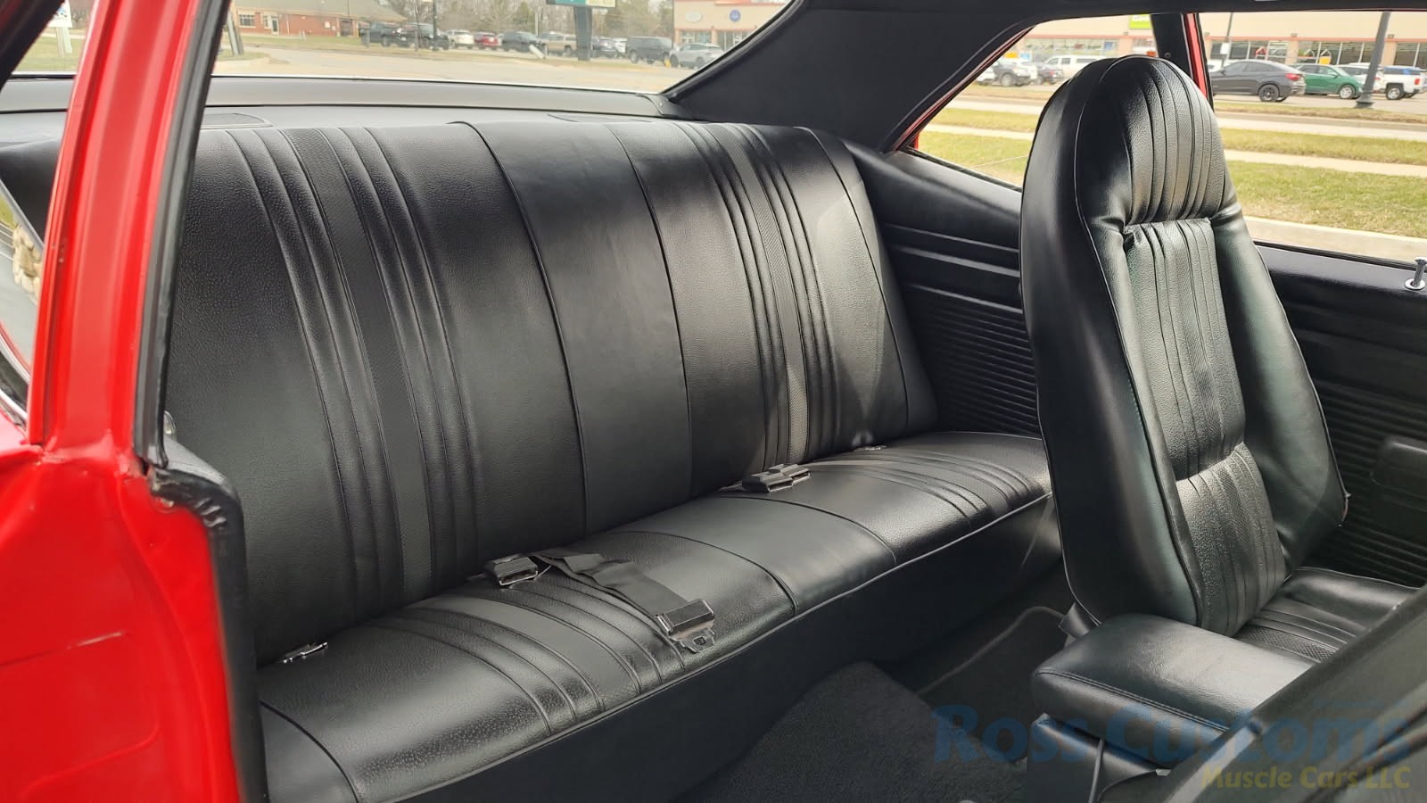 Factory black interior with bucket seats, original dash and dash pad, has rare factory gauge package with in dash tach, nicely outfitted with Vintage AC and heat with correct controls and under dash vents, Alpine AM/FM/CD stereo with bluetooth, rare center console with gauges and correct shifter, factory sport comfort grip wheel, headliner looks like new; as well as visors, front and rear door panels are original in excellent condition with new arm rest, front and rear seats have been reupholstered, front and rear seat belts, added center console with cup holders – which is removable, carpet is in excellent condition, new floor mats, original sill plates.