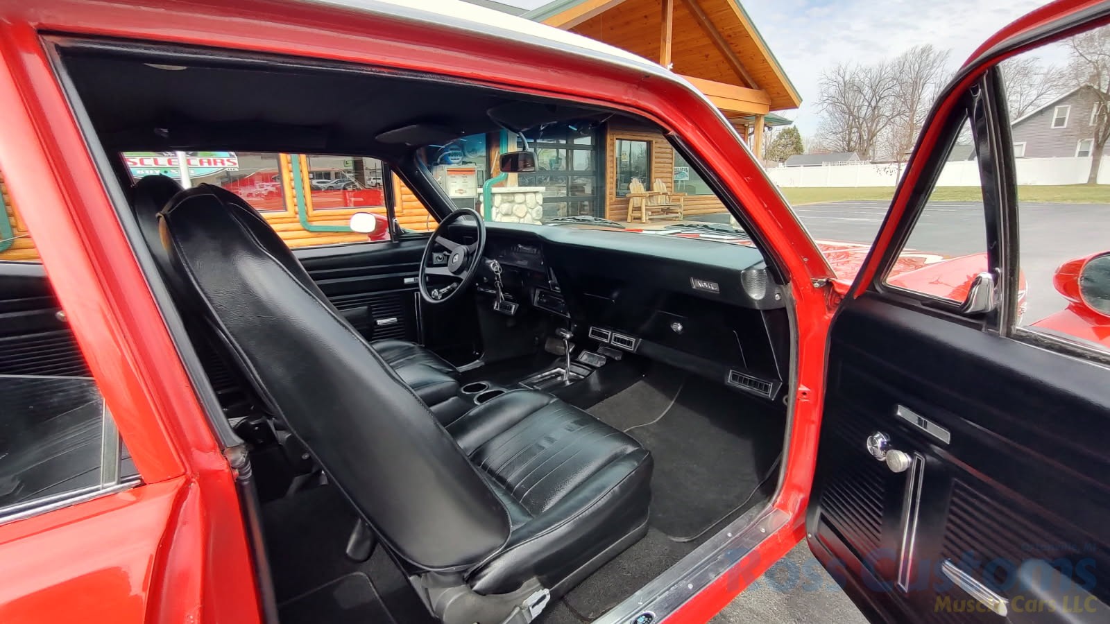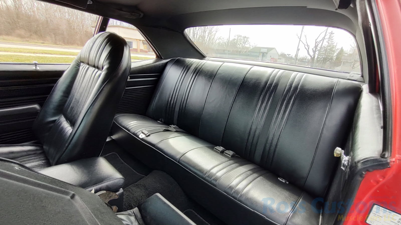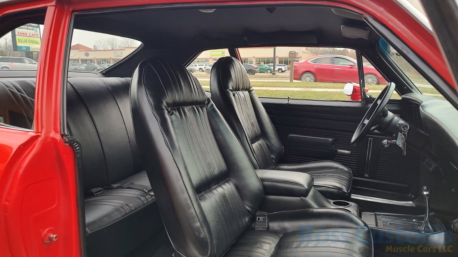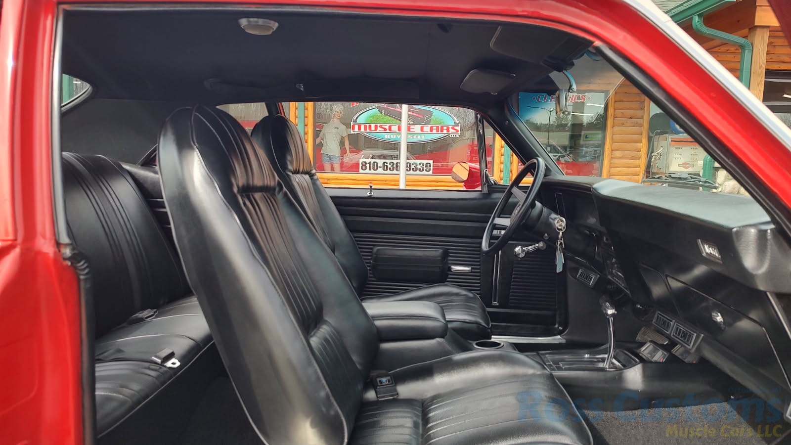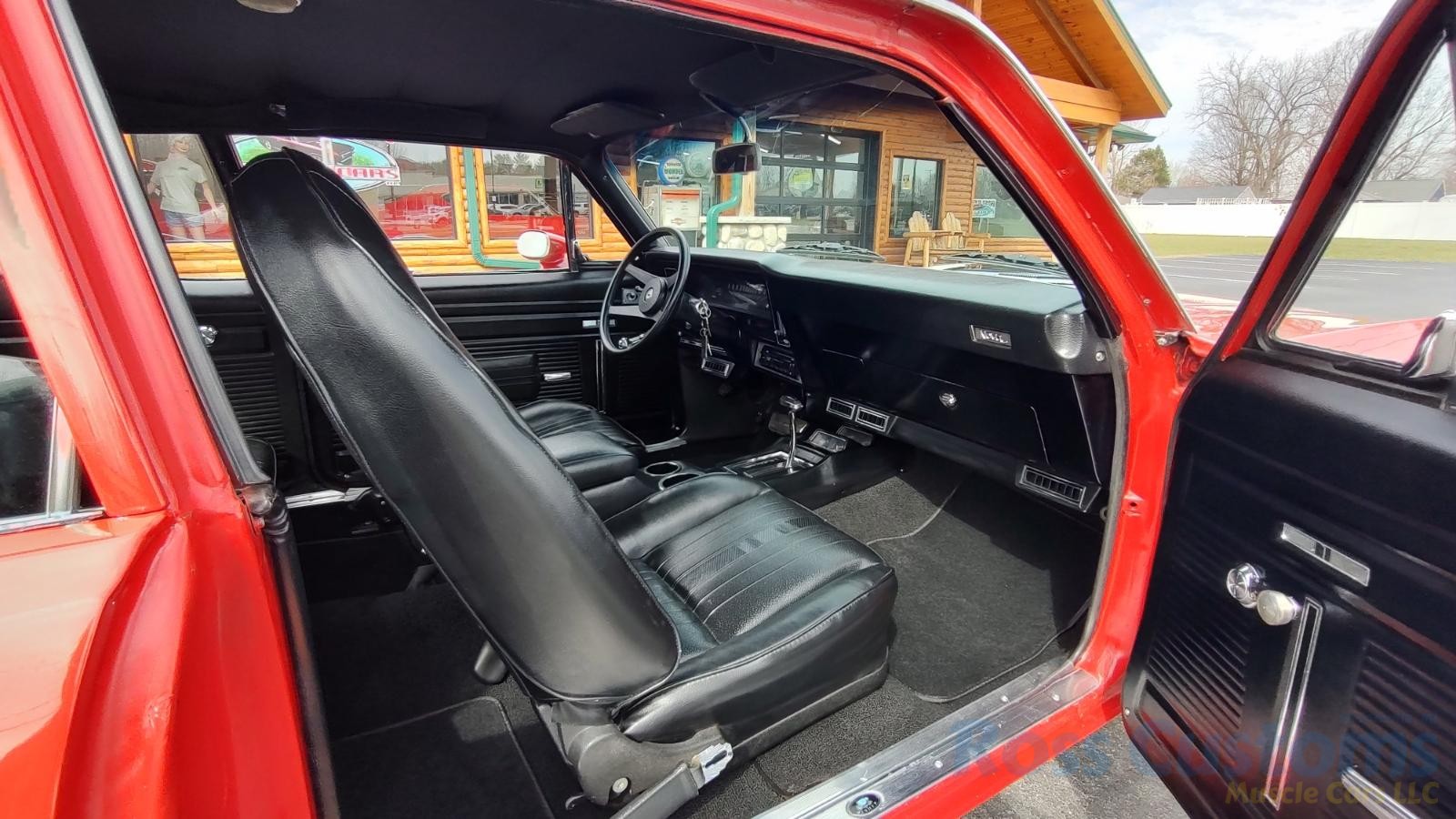 Factory black interior with bucket seats, original dash and dash pad, has rare factory gauge package with in dash tach, nicely outfitted with Vintage AC and heat with correct controls and under dash vents, Alpine AM/FM/CD stereo with bluetooth, rare center console with gauges and correct shifter, factory sport comfort grip wheel, headliner looks like new; as well as visors, front and rear door panels are original in excellent condition with new arm rest, front and rear seats have been reupholstered, front and rear seat belts, added center console with cup holders – which is removable, carpet is in excellent condition, new floor mats, original sill plates.