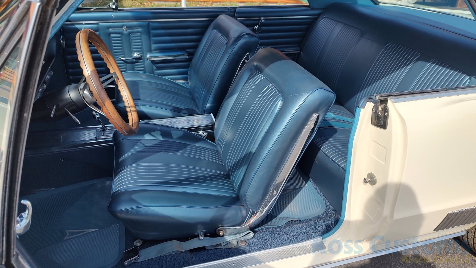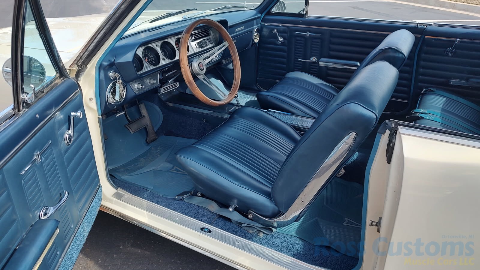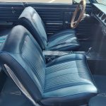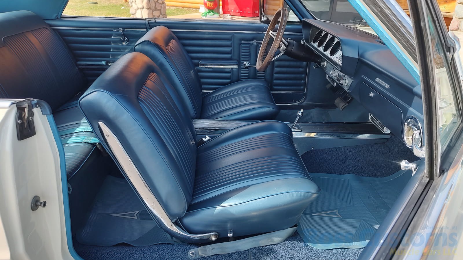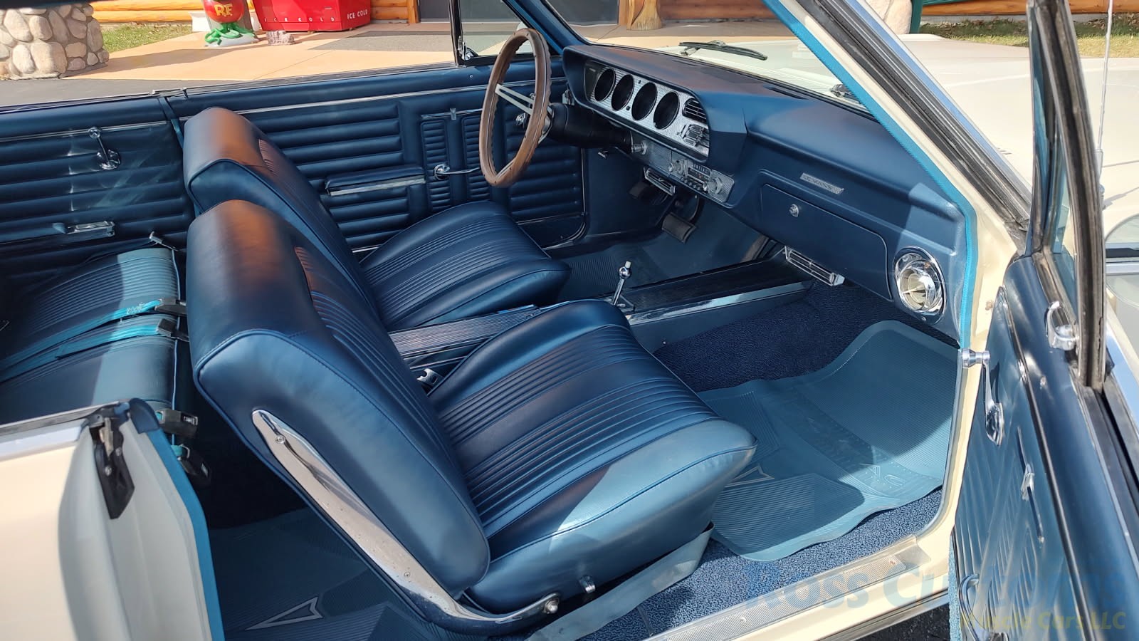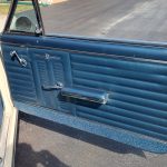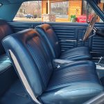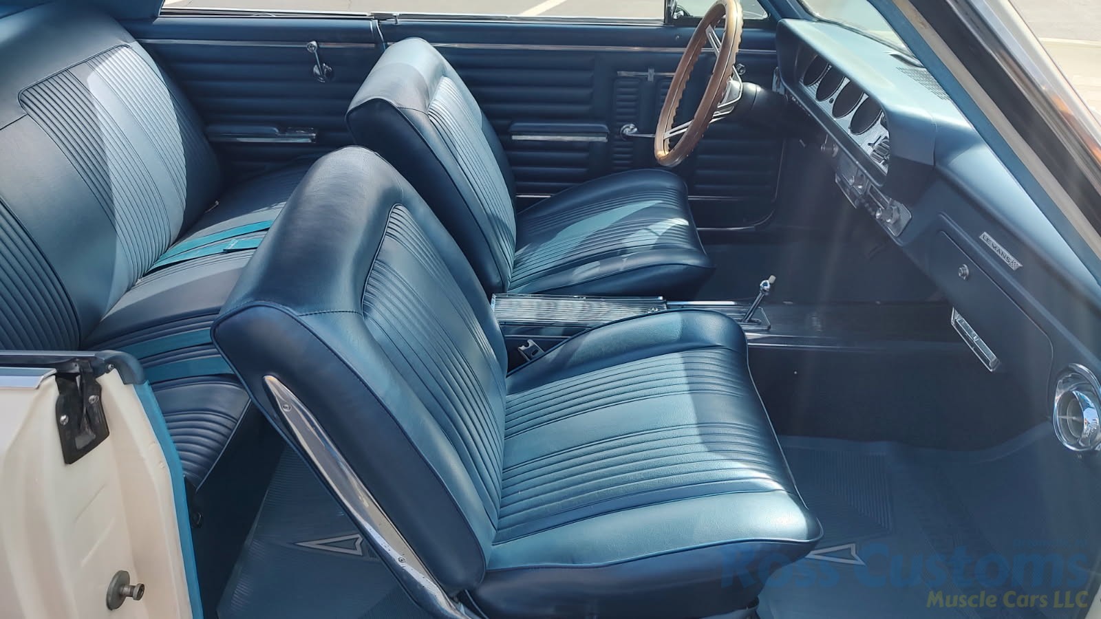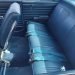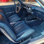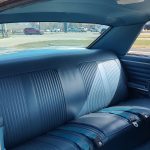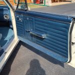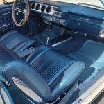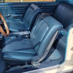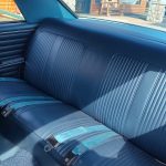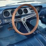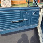Factory dark blue interior, dash is original in very good condition, all original gauges, previous owner added engine turned trim, rare tilt steering column with 3 spoke wood wheel, new visors, headliner, sail panels and package shelf, new front and rear door panels, new window cranks and handles, arm rest appear to be original in excellent condition, front and rear seats have been reupholstered, optional front and rear seat belts, original console in excellent condition, shifter has been reworked to work correctly with the 3 speed automatic trans, new carpet, deluxe floormats and sill plates.
