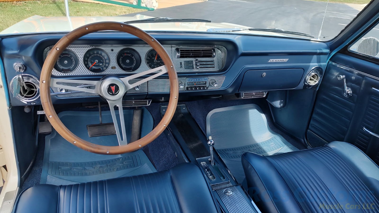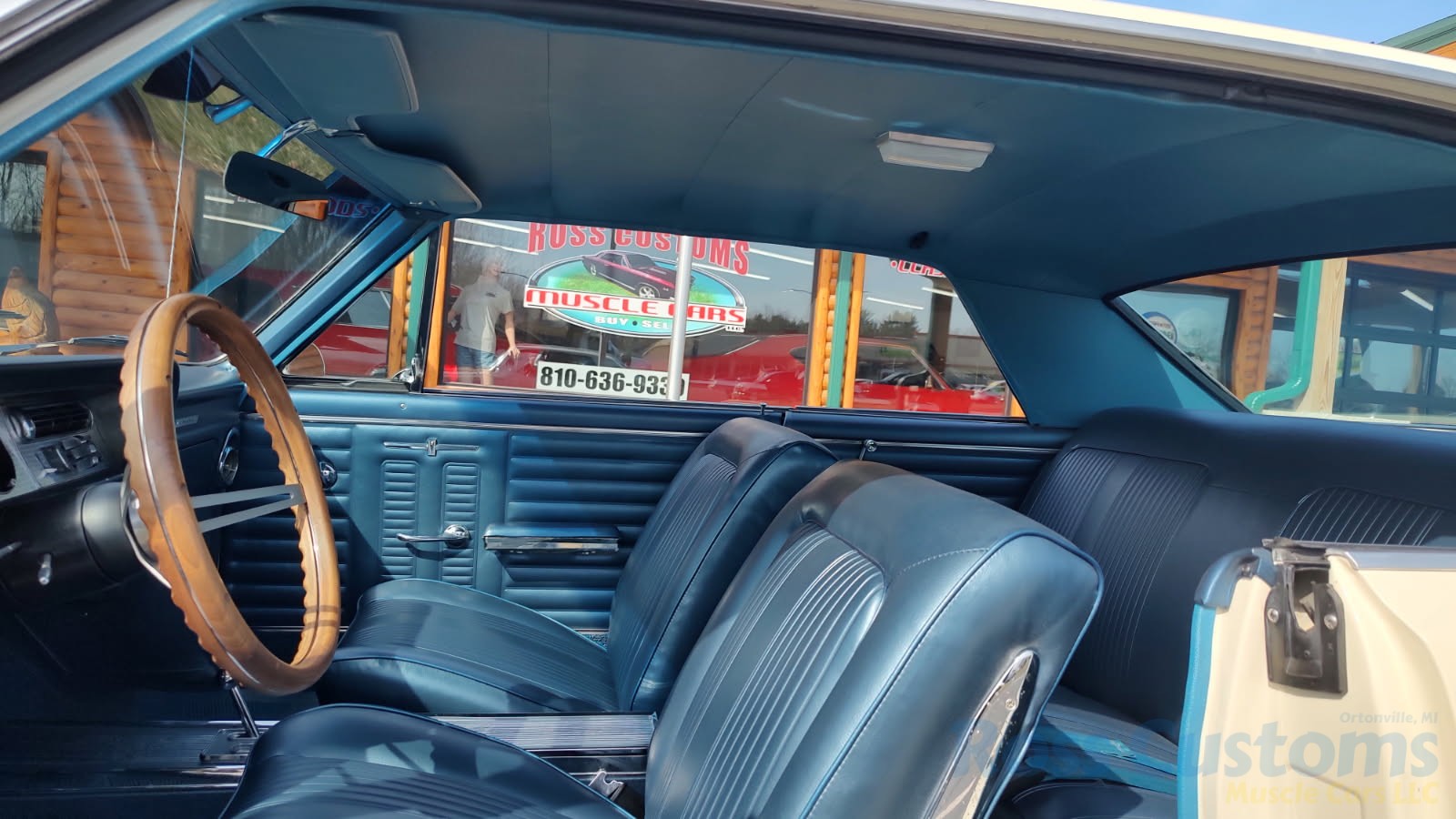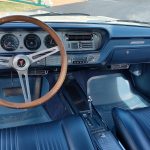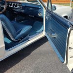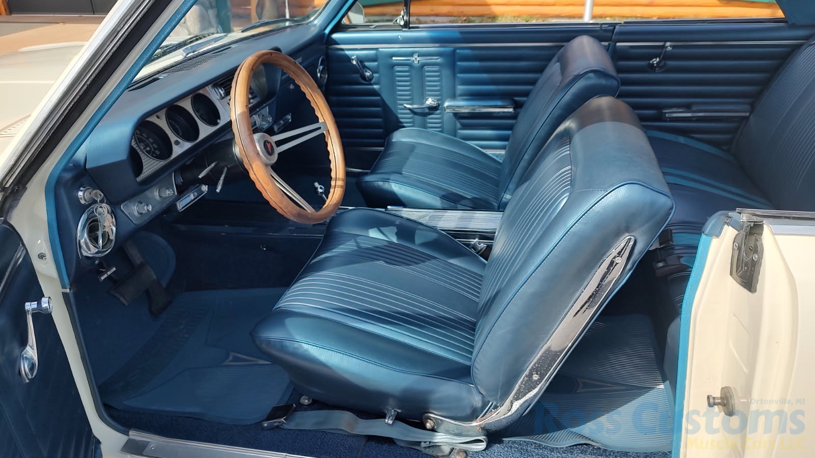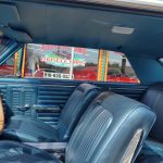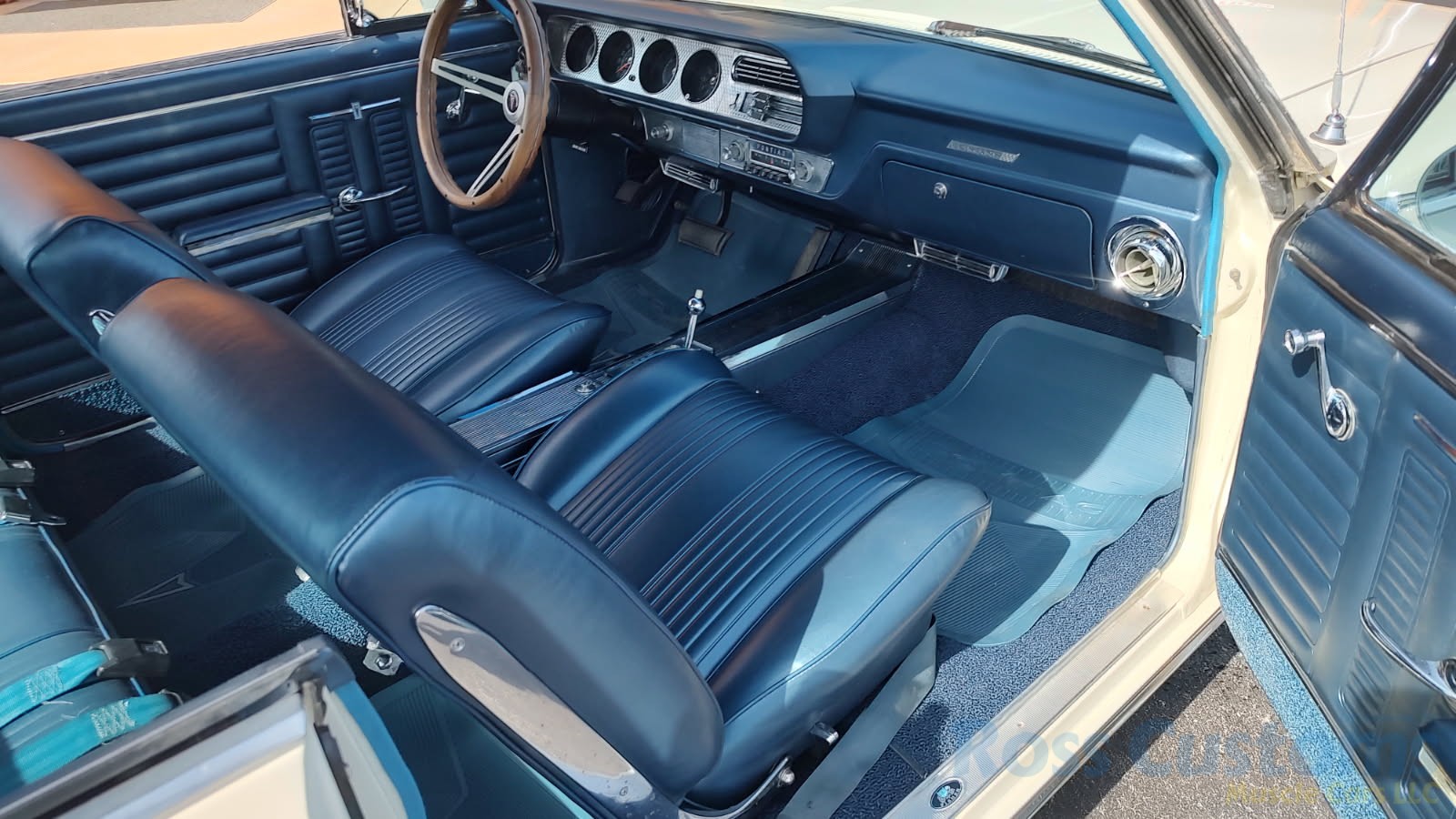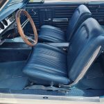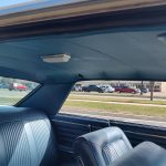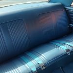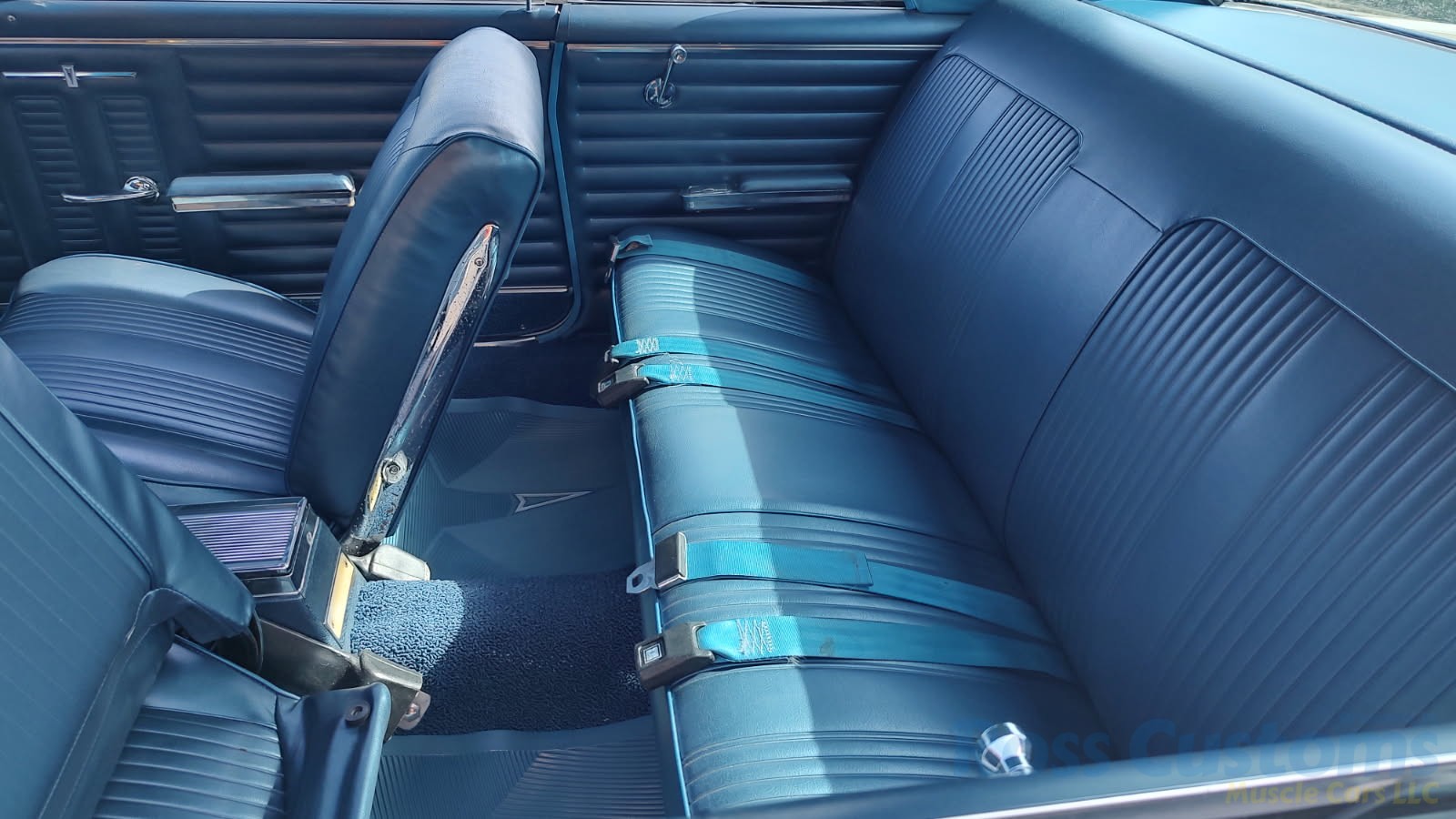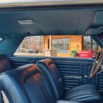 Factory dark blue interior, dash is original in very good condition, all original gauges, previous owner added engine turned trim, rare tilt steering column with 3 spoke wood wheel, new visors, headliner, sail panels and package shelf, new front and rear door panels, new window cranks and handles, arm rest appear to be original in excellent condition, front and rear seats have been reupholstered, optional front and rear seat belts, original console in excellent condition, shifter has been reworked to work correctly with the 3 speed automatic trans, new carpet, deluxe floormats and sill plates.