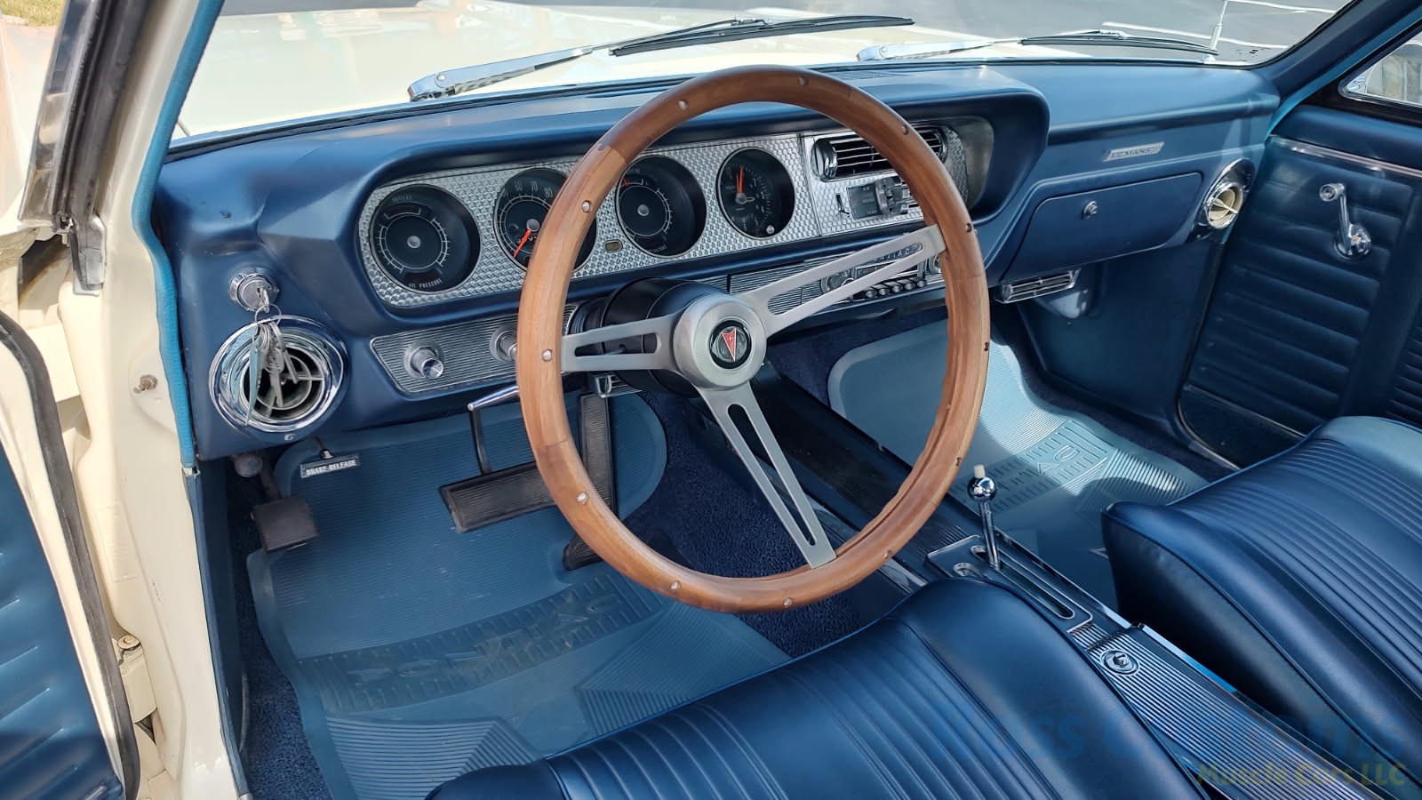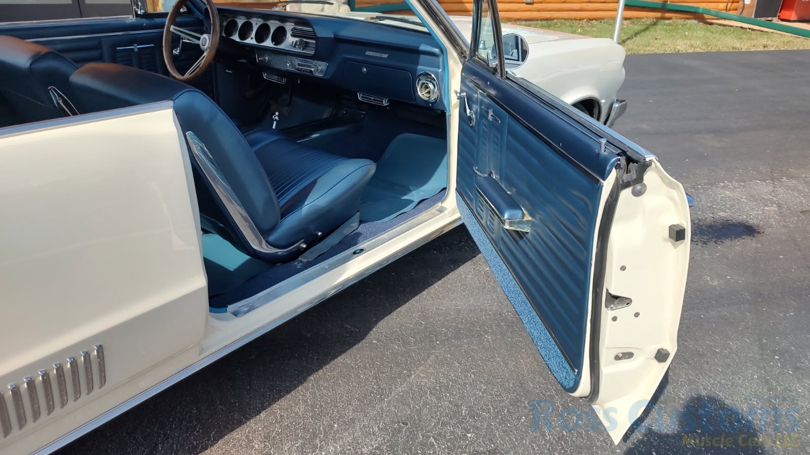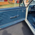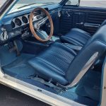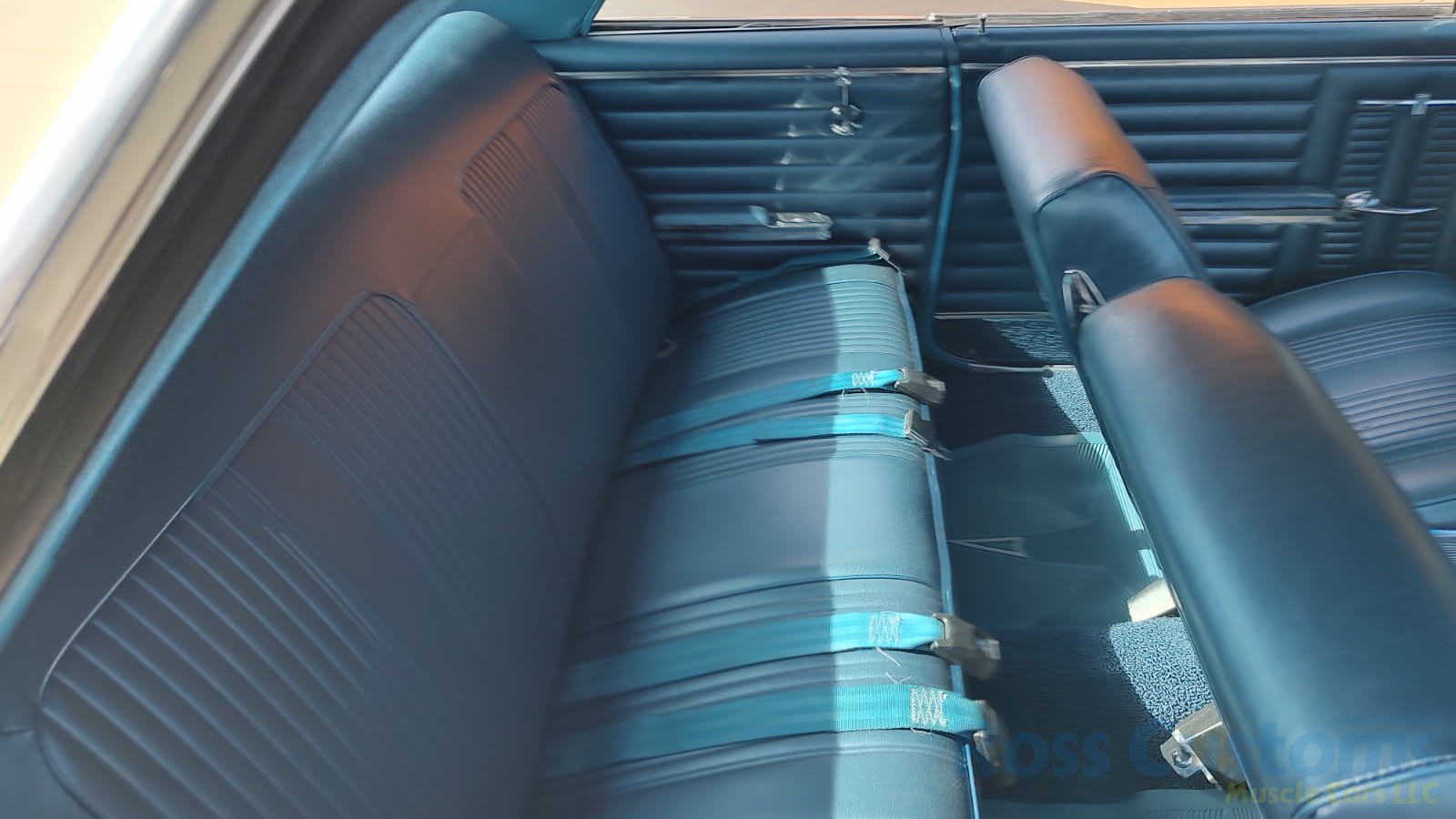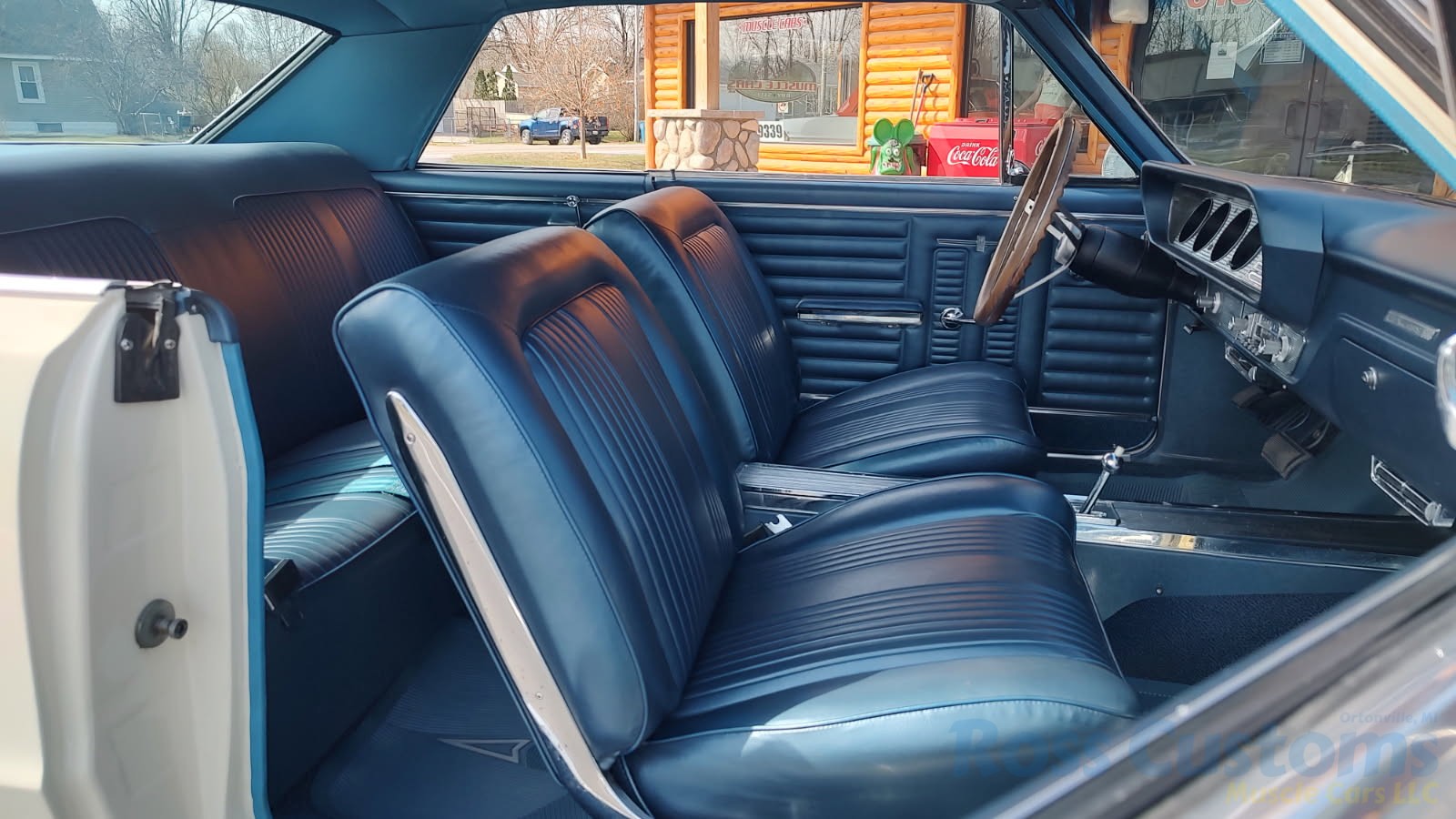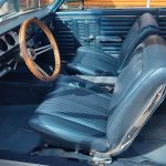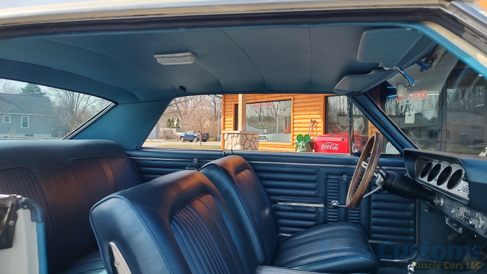 Factory dark blue interior, dash is original in very good condition, all original gauges, previous owner added engine turned trim, rare tilt steering column with 3 spoke wood wheel, new visors, headliner, sail panels and package shelf, new front and rear door panels, new window cranks and handles, arm rest appear to be original in excellent condition, front and rear seats have been reupholstered, optional front and rear seat belts, original console in excellent condition, shifter has been reworked to work correctly with the 3 speed automatic trans, new carpet, deluxe floormats and sill plates.