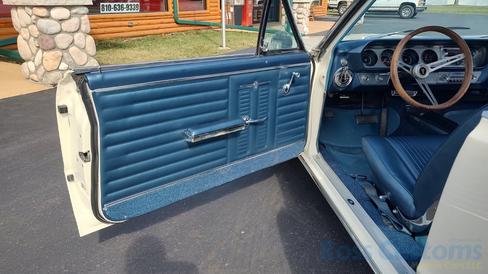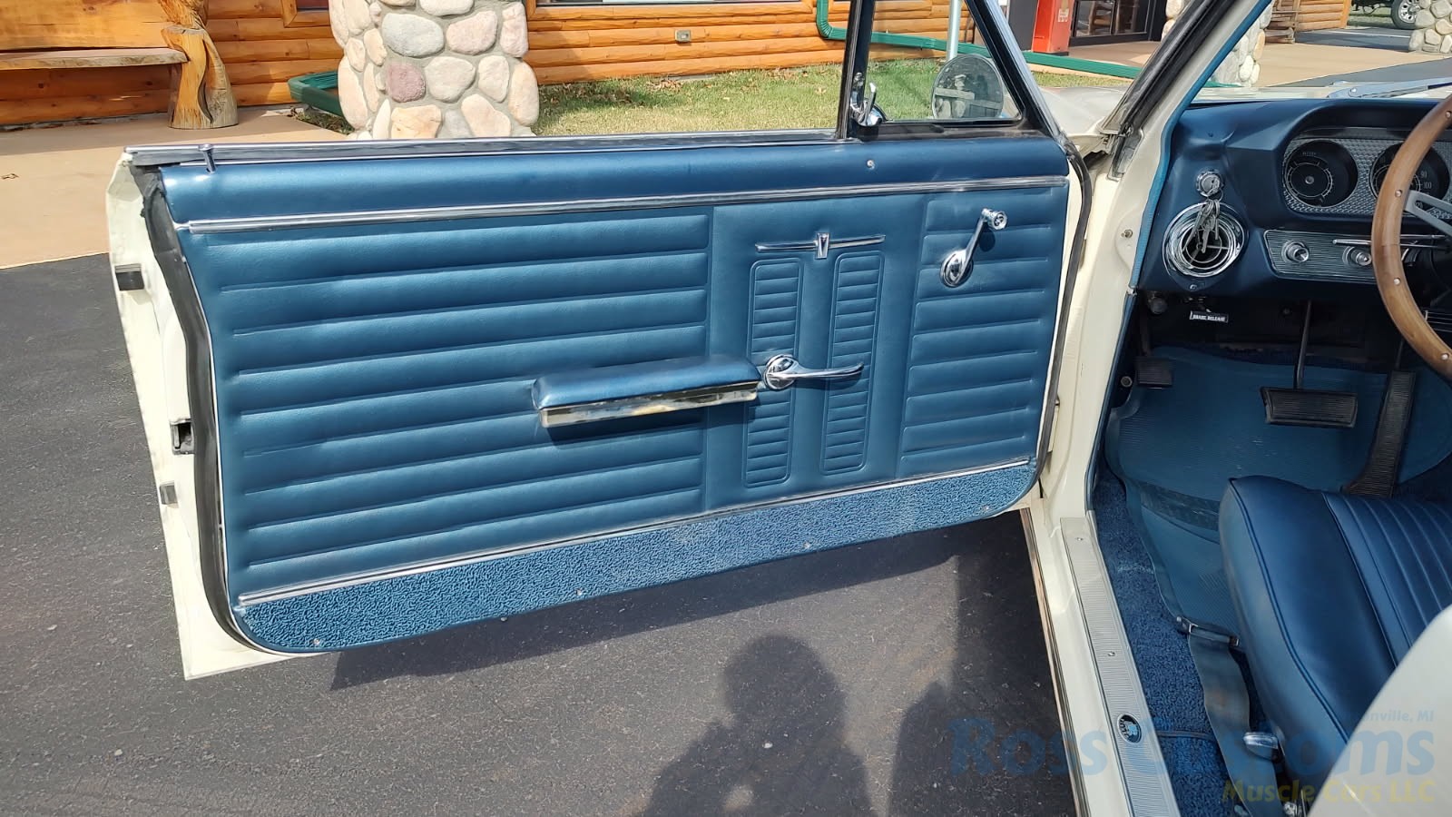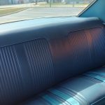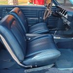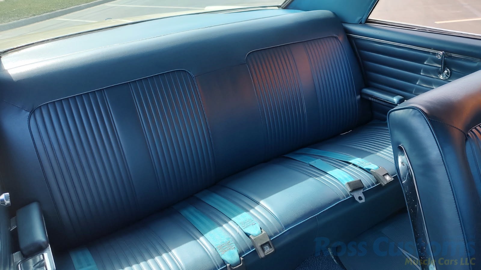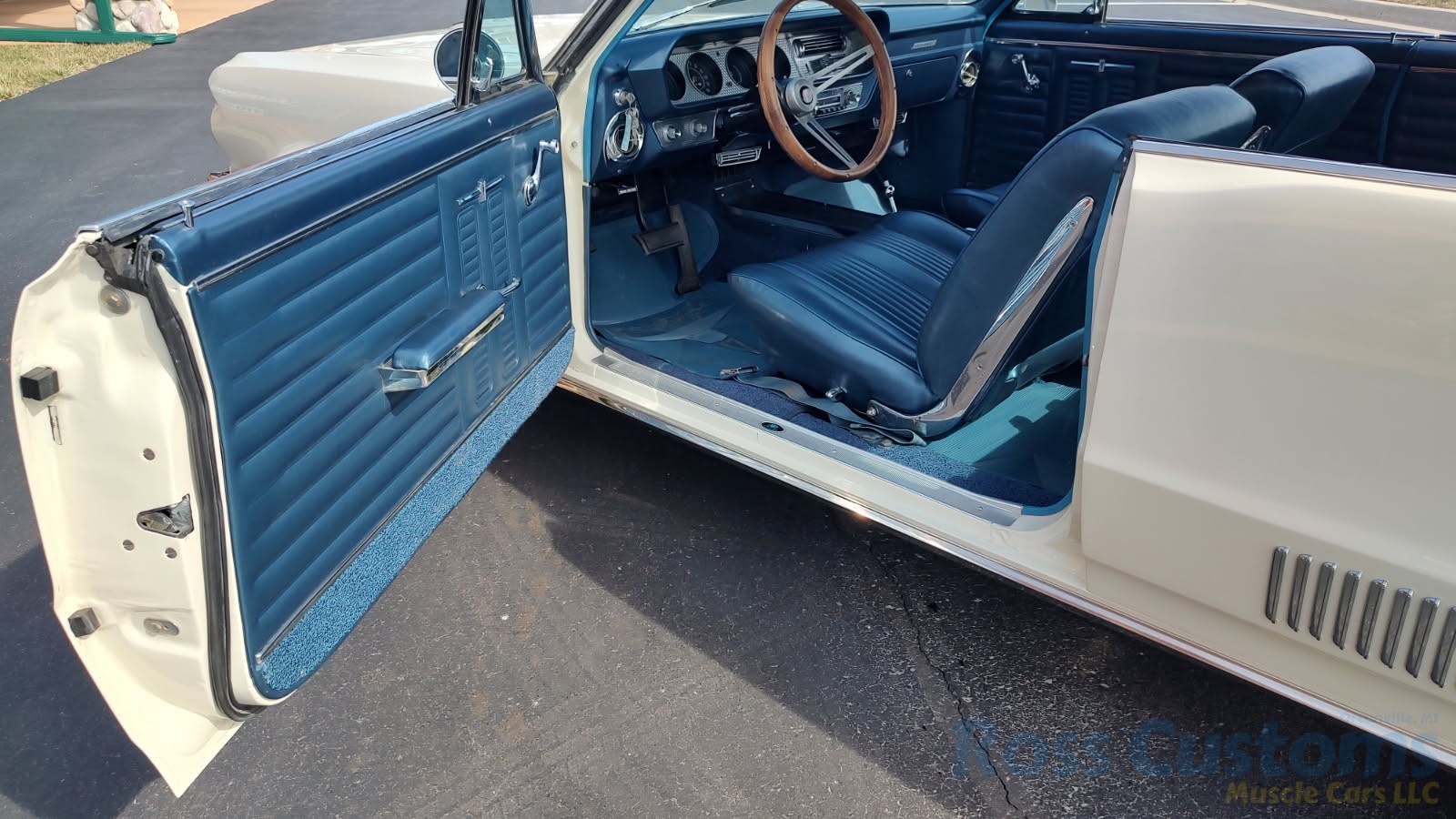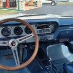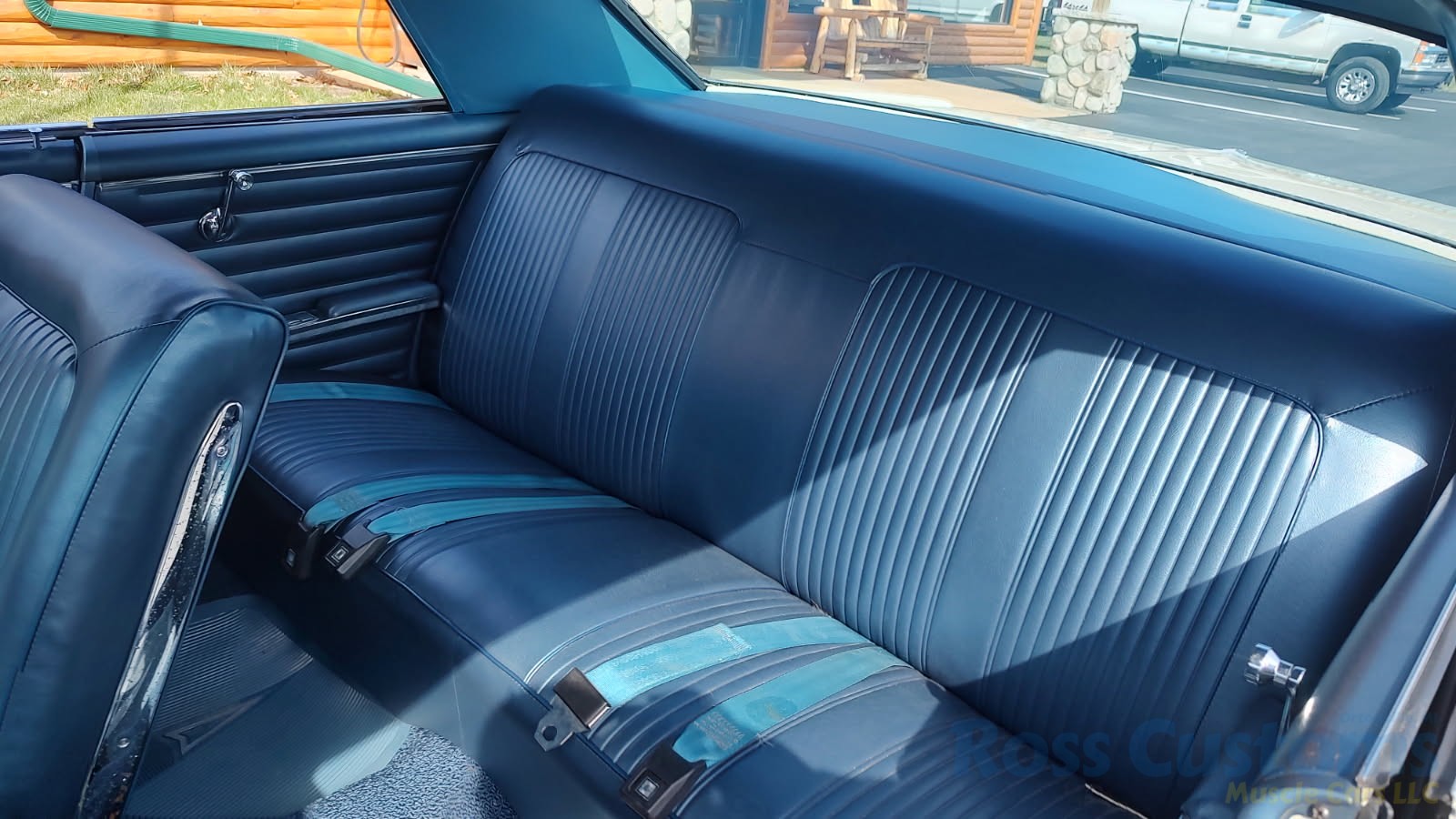 Factory dark blue interior, dash is original in very good condition, all original gauges, previous owner added engine turned trim, rare tilt steering column with 3 spoke wood wheel, new visors, headliner, sail panels and package shelf, new front and rear door panels, new window cranks and handles, arm rest appear to be original in excellent condition, front and rear seats have been reupholstered, optional front and rear seat belts, original console in excellent condition, shifter has been reworked to work correctly with the 3 speed automatic trans, new carpet, deluxe floormats and sill plates.