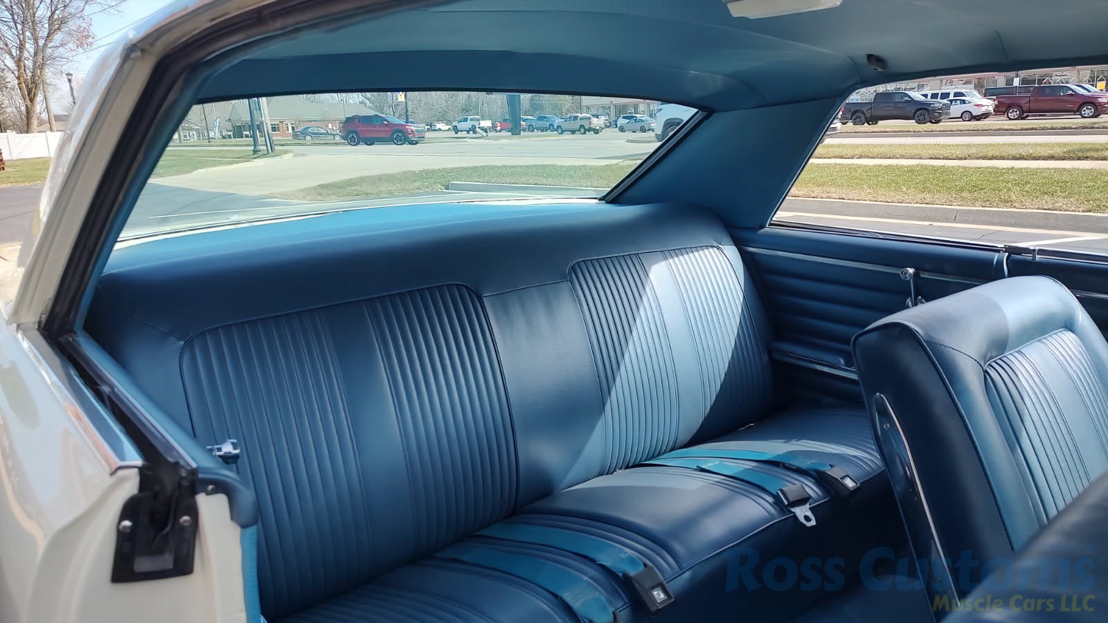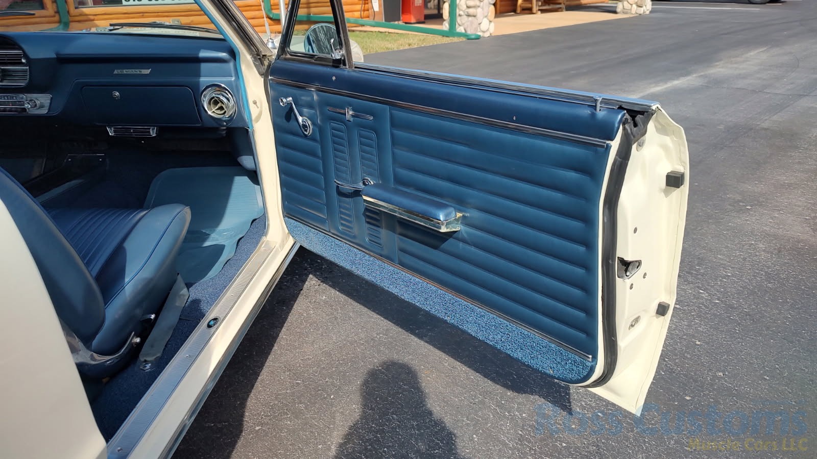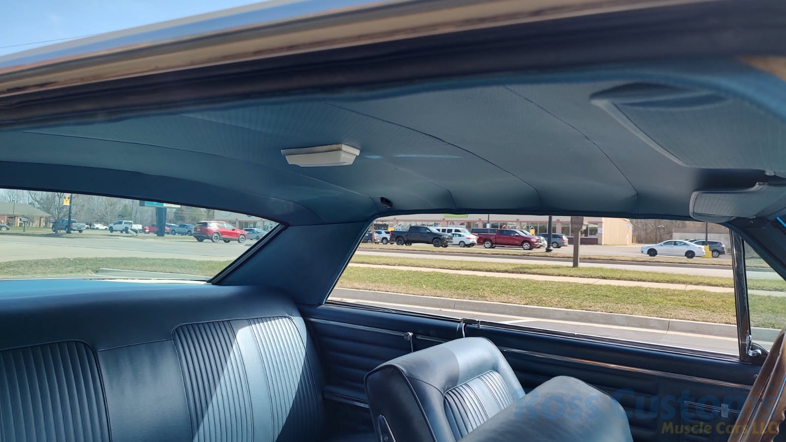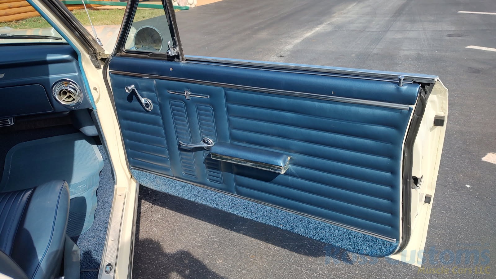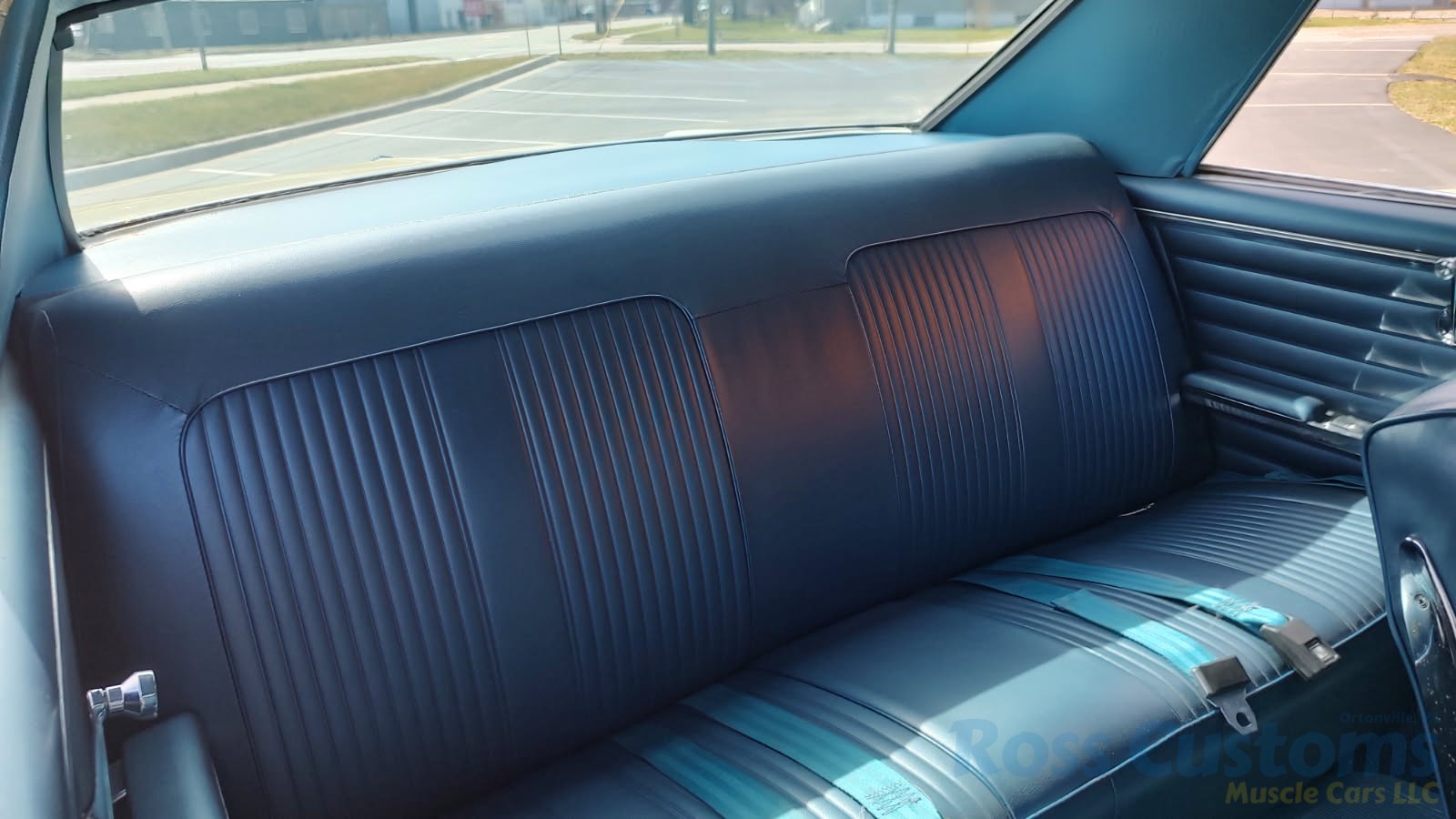 Factory dark blue interior, dash is original in very good condition, all original gauges, previous owner added engine turned trim, rare tilt steering column with 3 spoke wood wheel, new visors, headliner, sail panels and package shelf, new front and rear door panels, new window cranks and handles, arm rest appear to be original in excellent condition, front and rear seats have been reupholstered, optional front and rear seat belts, original console in excellent condition, shifter has been reworked to work correctly with the 3 speed automatic trans, new carpet, deluxe floormats and sill plates.